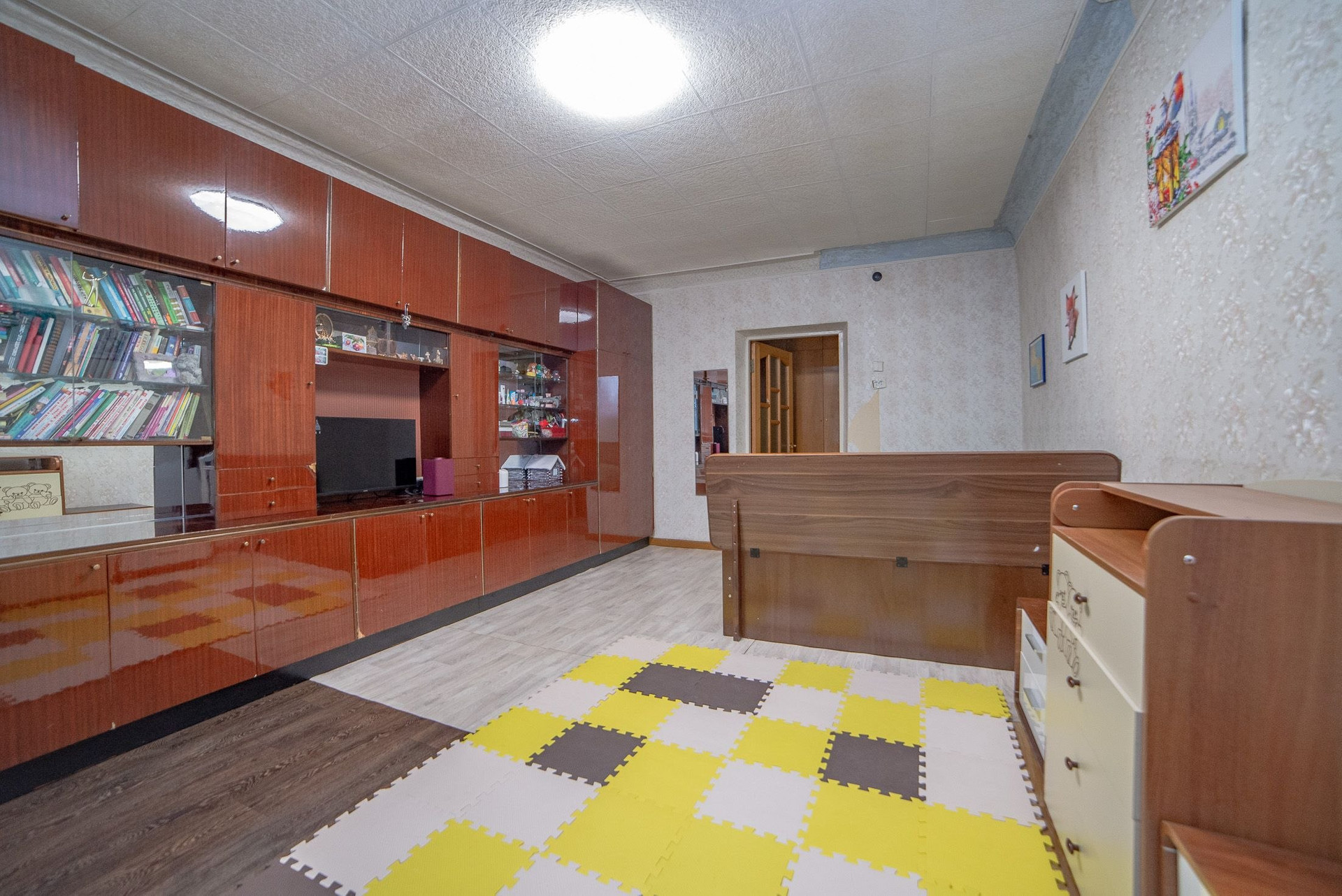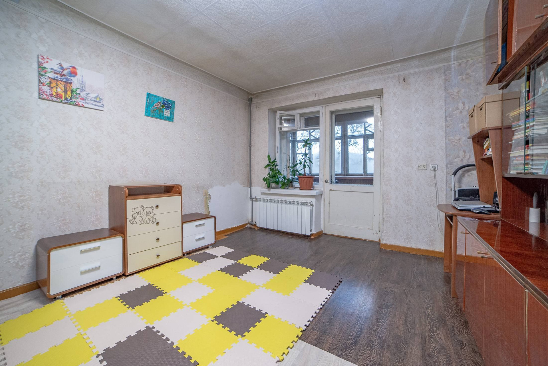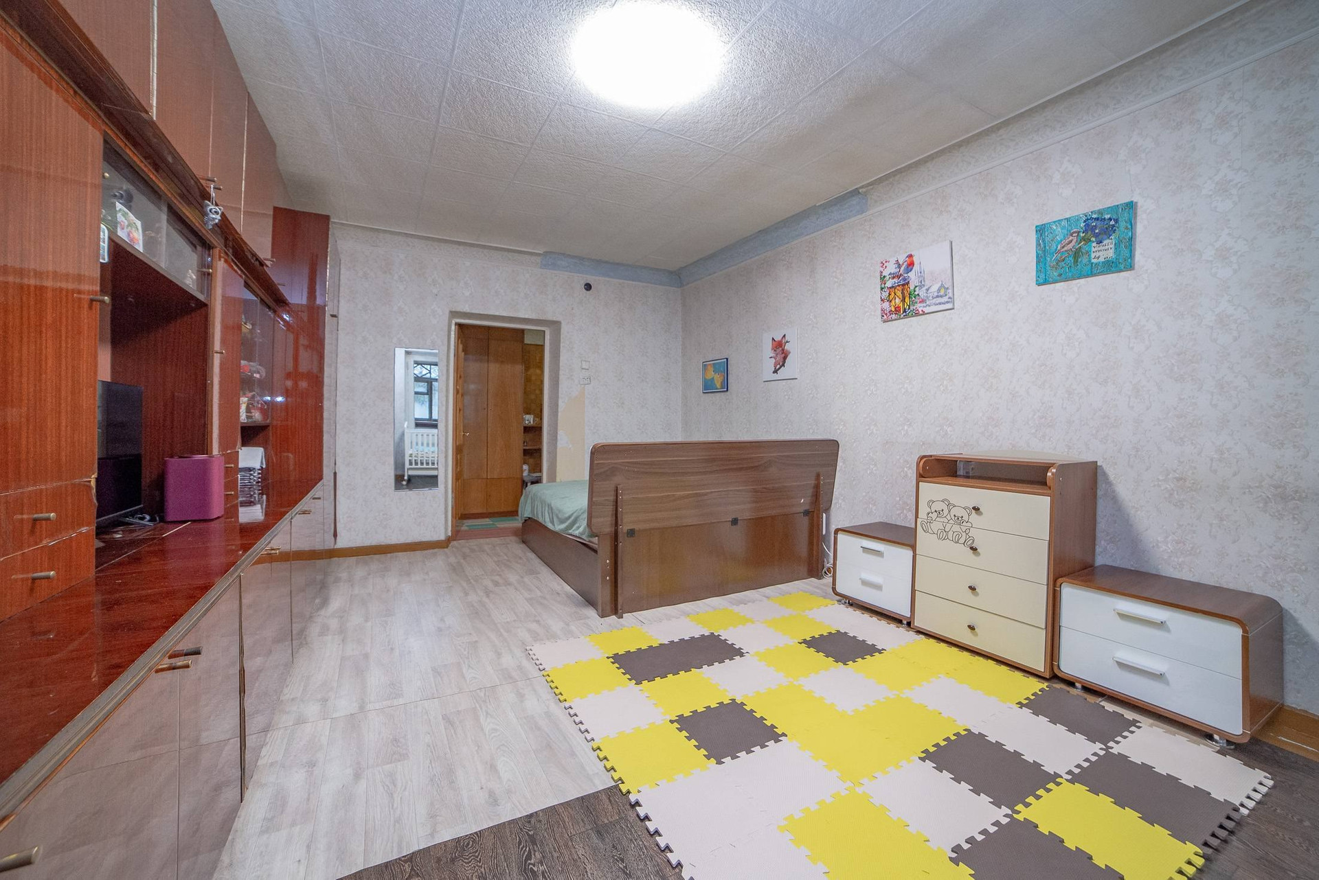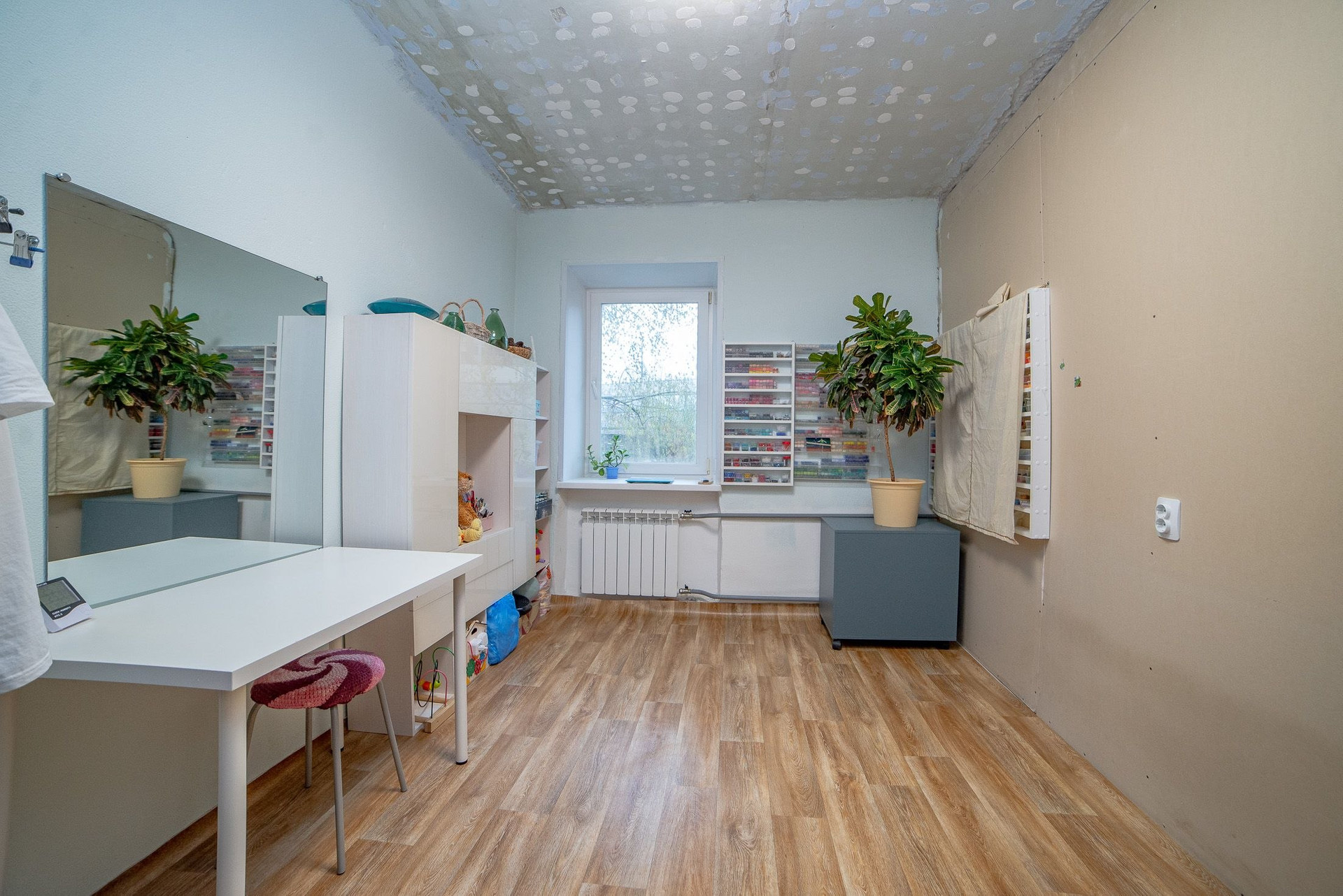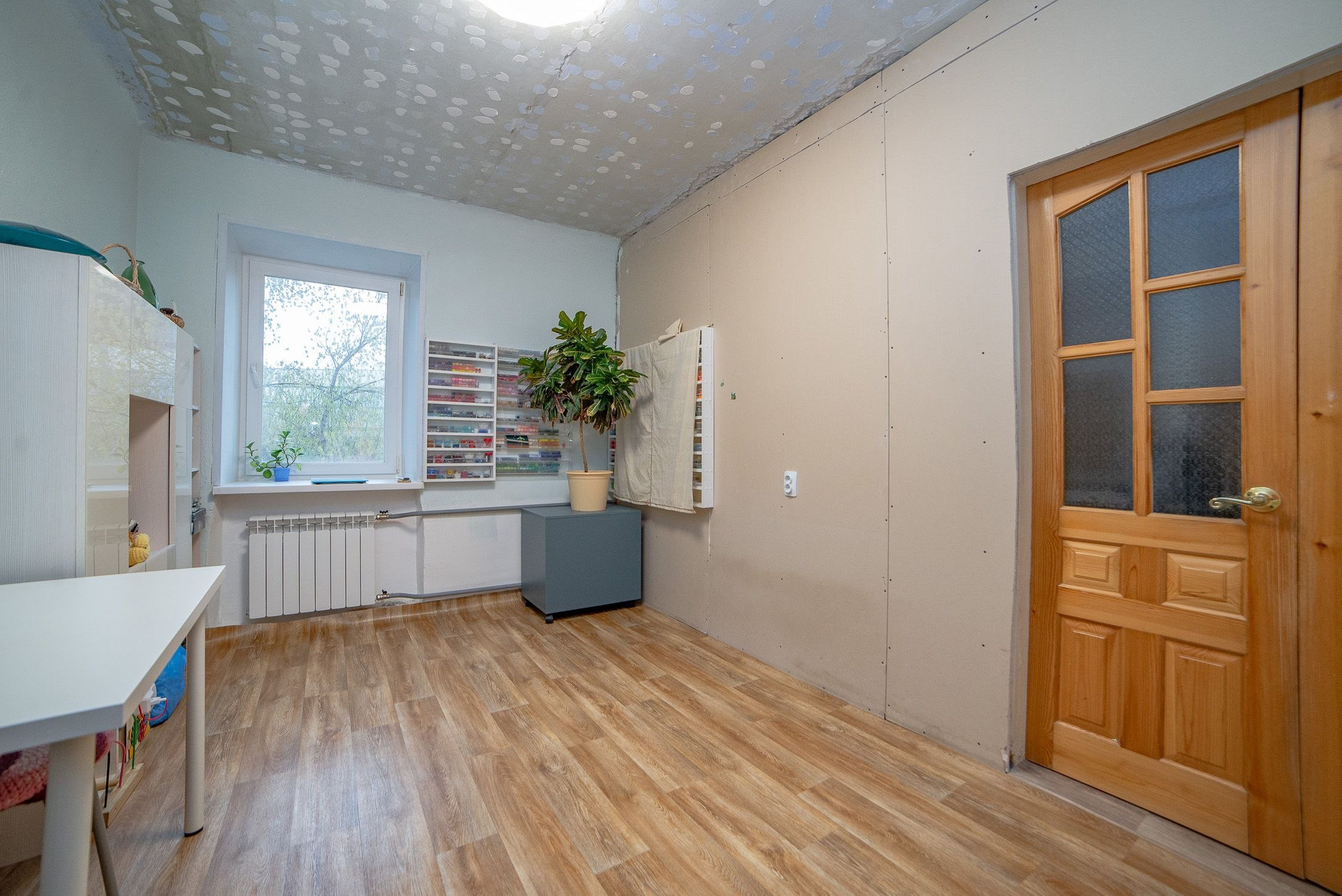 В маленькой комнате залит хороший пол, стены выровнили гипсокартоном, потолок "подготовили" чтобы сделать натяжной, но так руки и не дошли..