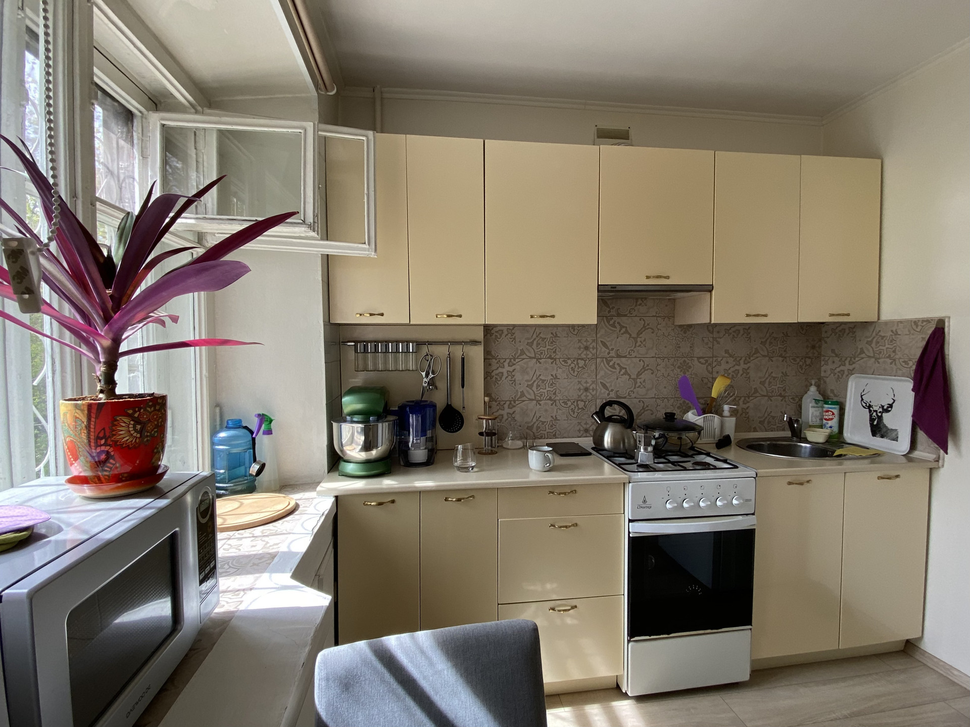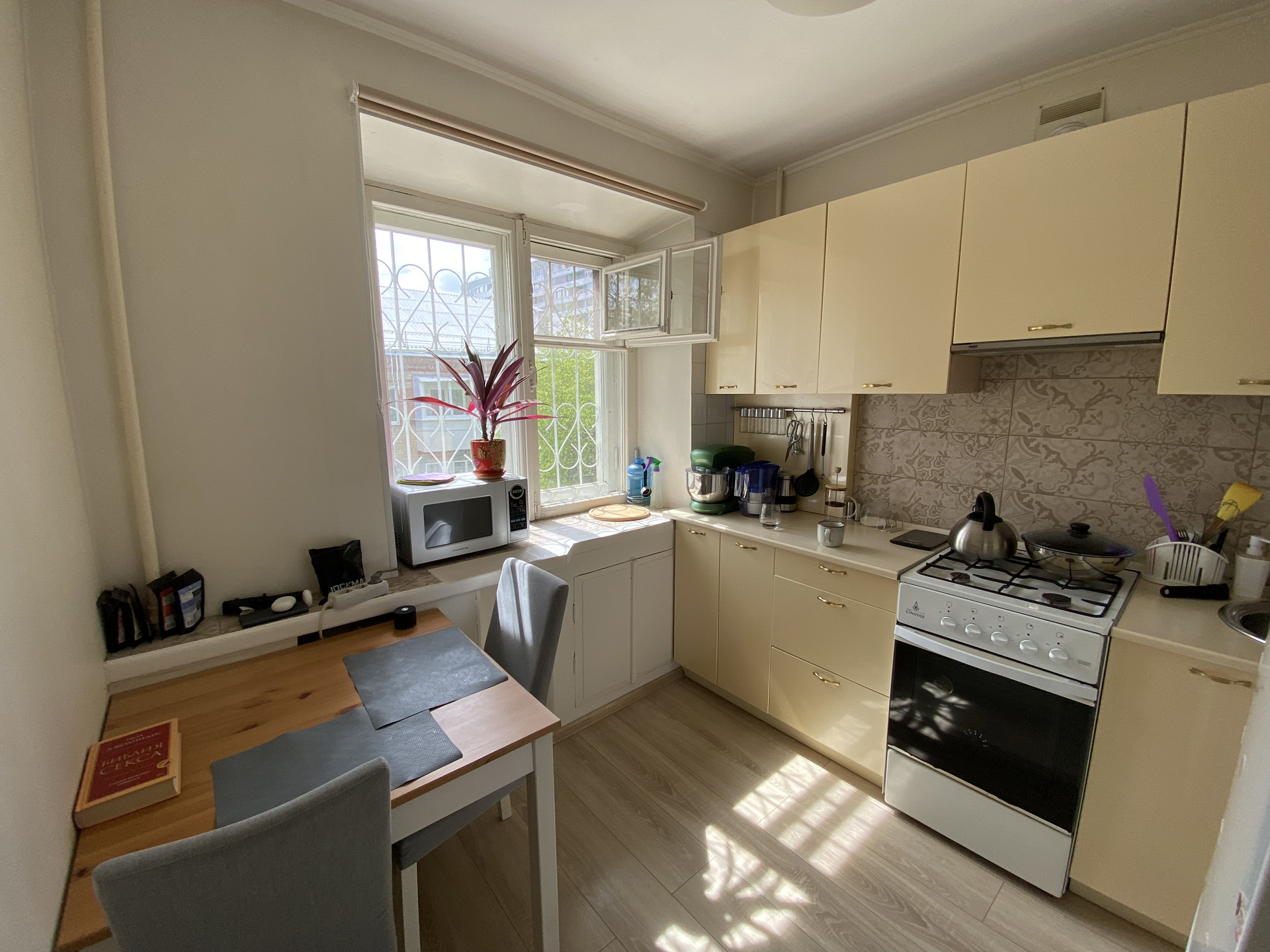 - Кирпичный дом с толстыми полуметровыми стенами обеспечивает тепло (батареи закрыты экранами, на кухне форточка открыта круглый год) и тишину;