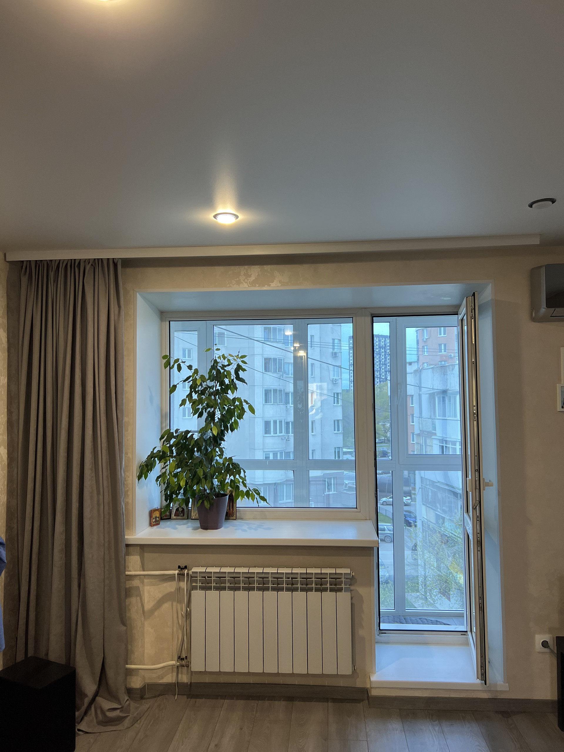 Окна пластиковые, балкон застеклен. Установлена сейф-дверь и охранная система квартиры, заменены межкомнатные двери.