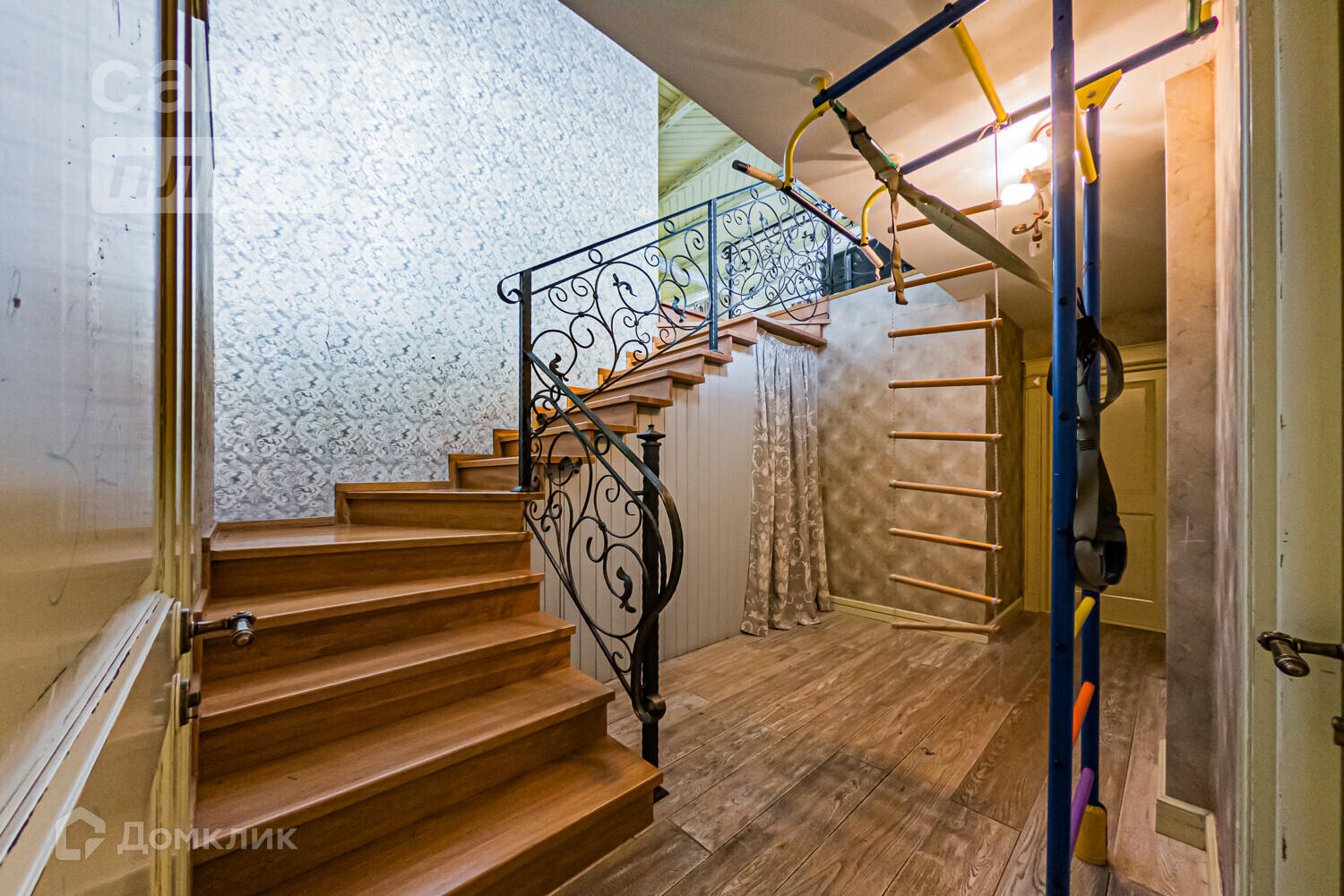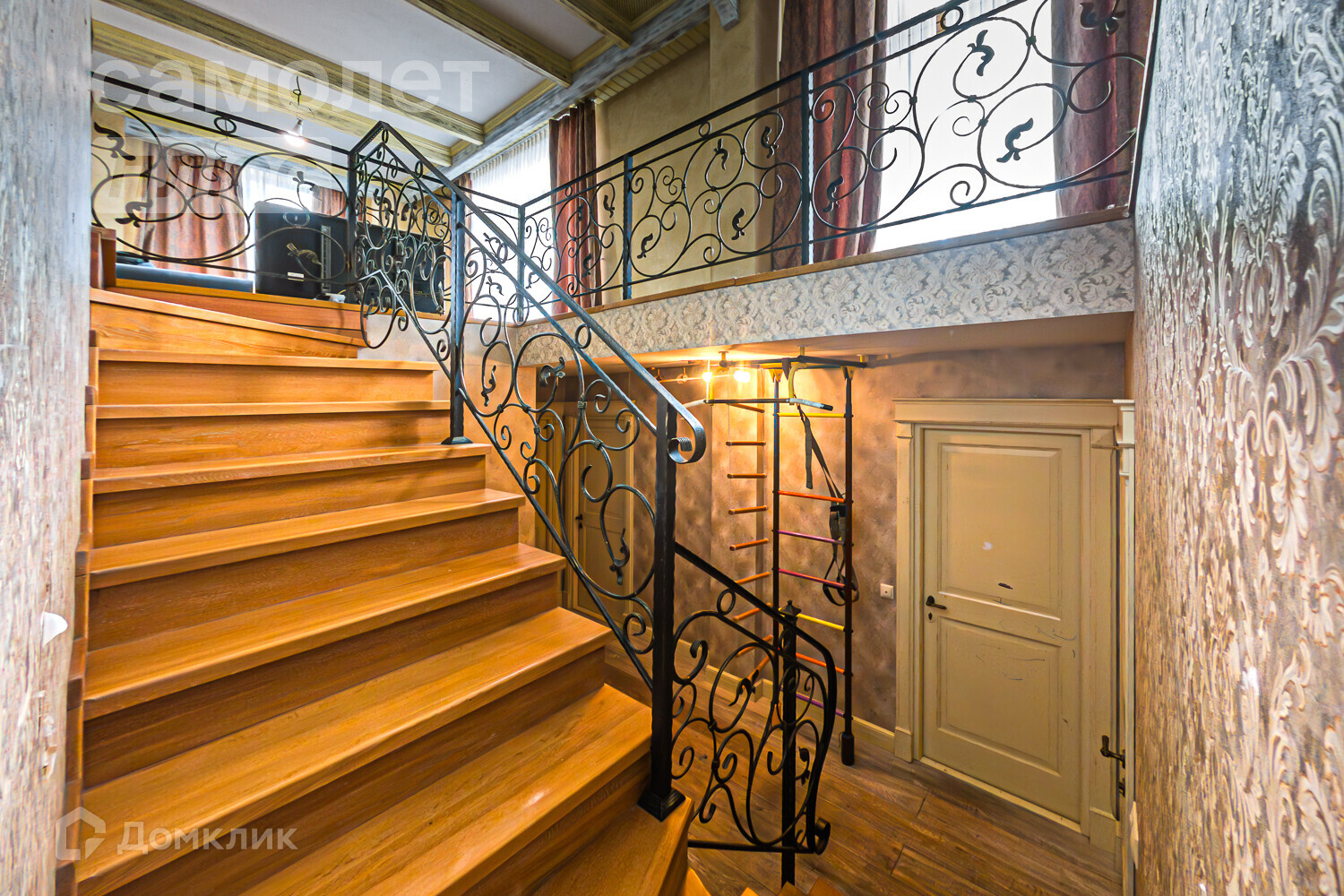 -Ограждение внутриквартирной лестницы - кованое железо, ступени - лестницы из дуба.