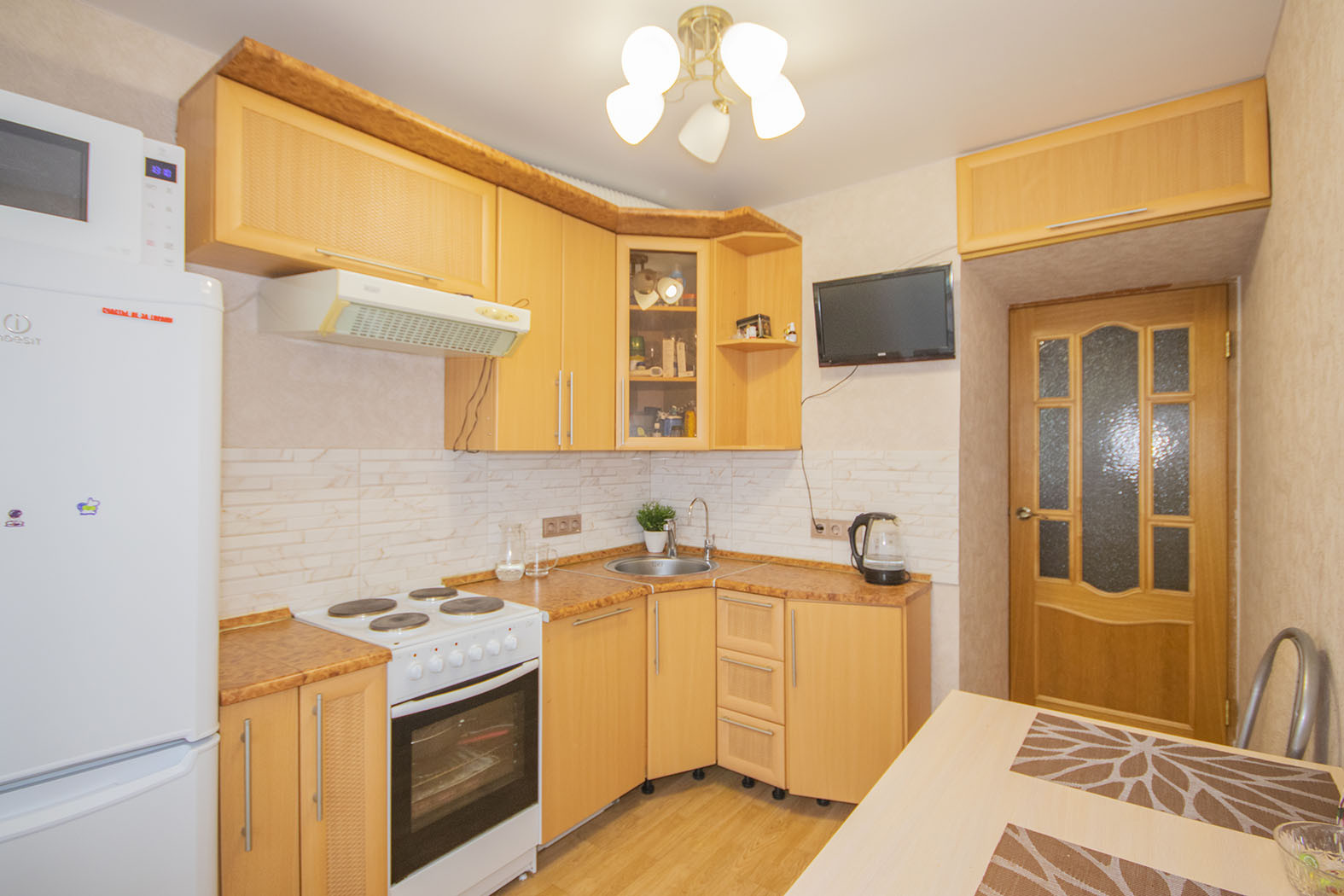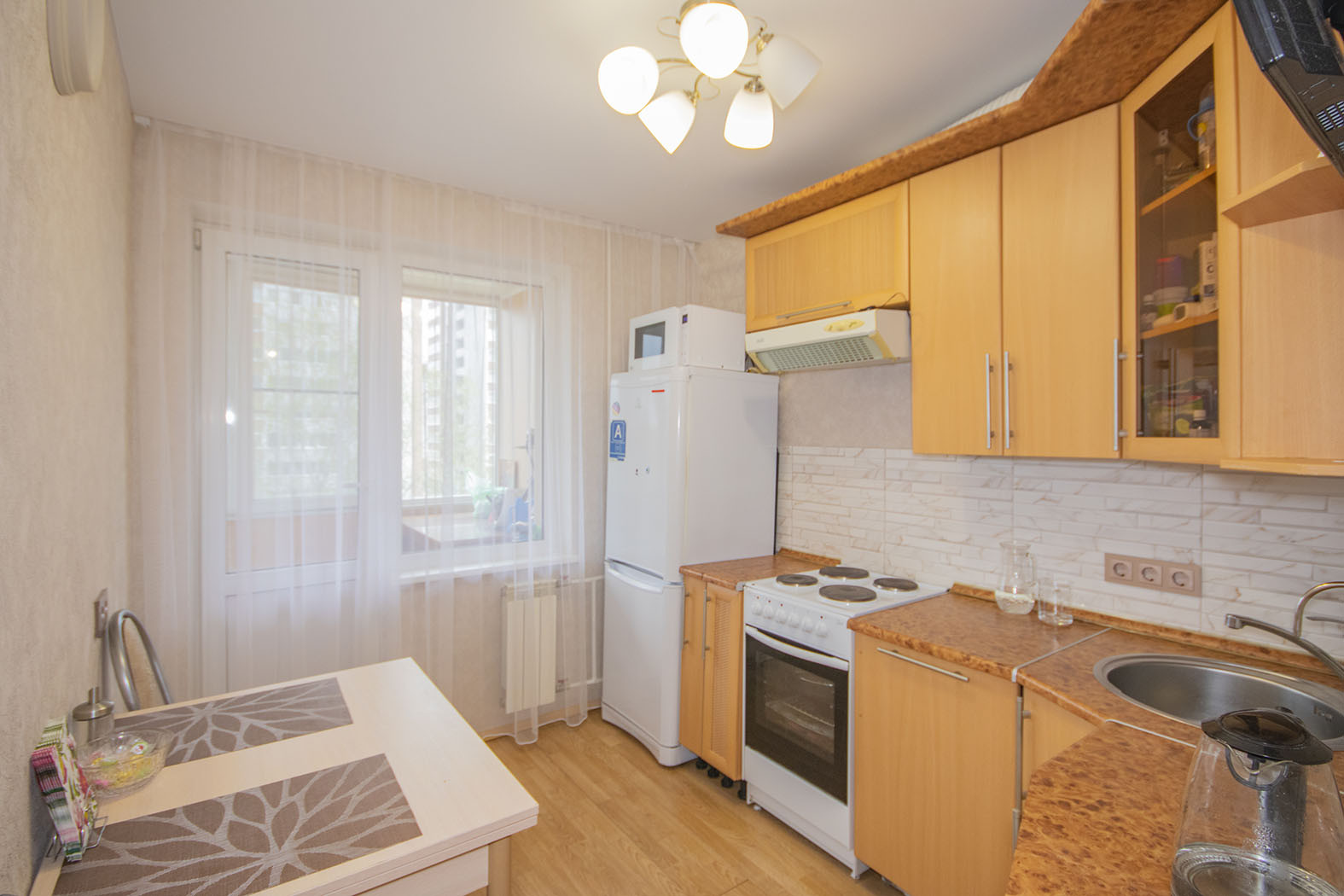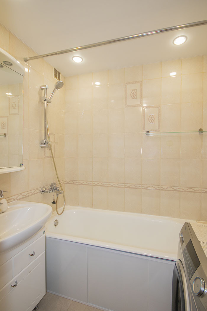 В квартире остается кухонный гарнитур и встроенная бытовая техника – посудомоечная машина, холодильник, плита. Так же на кухне оставляем стол и стулья.