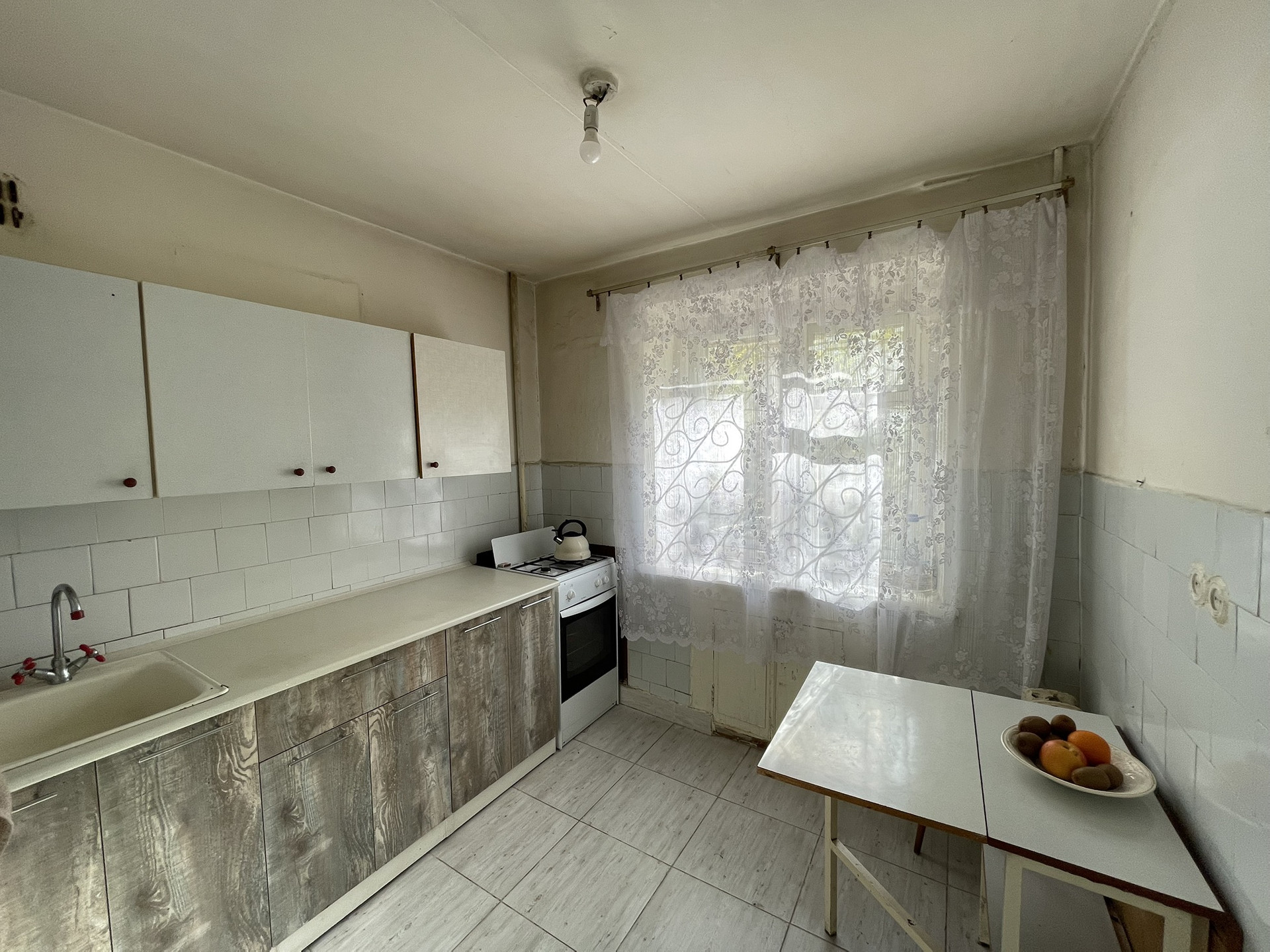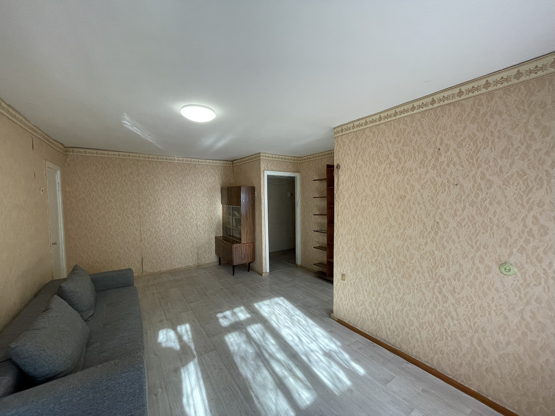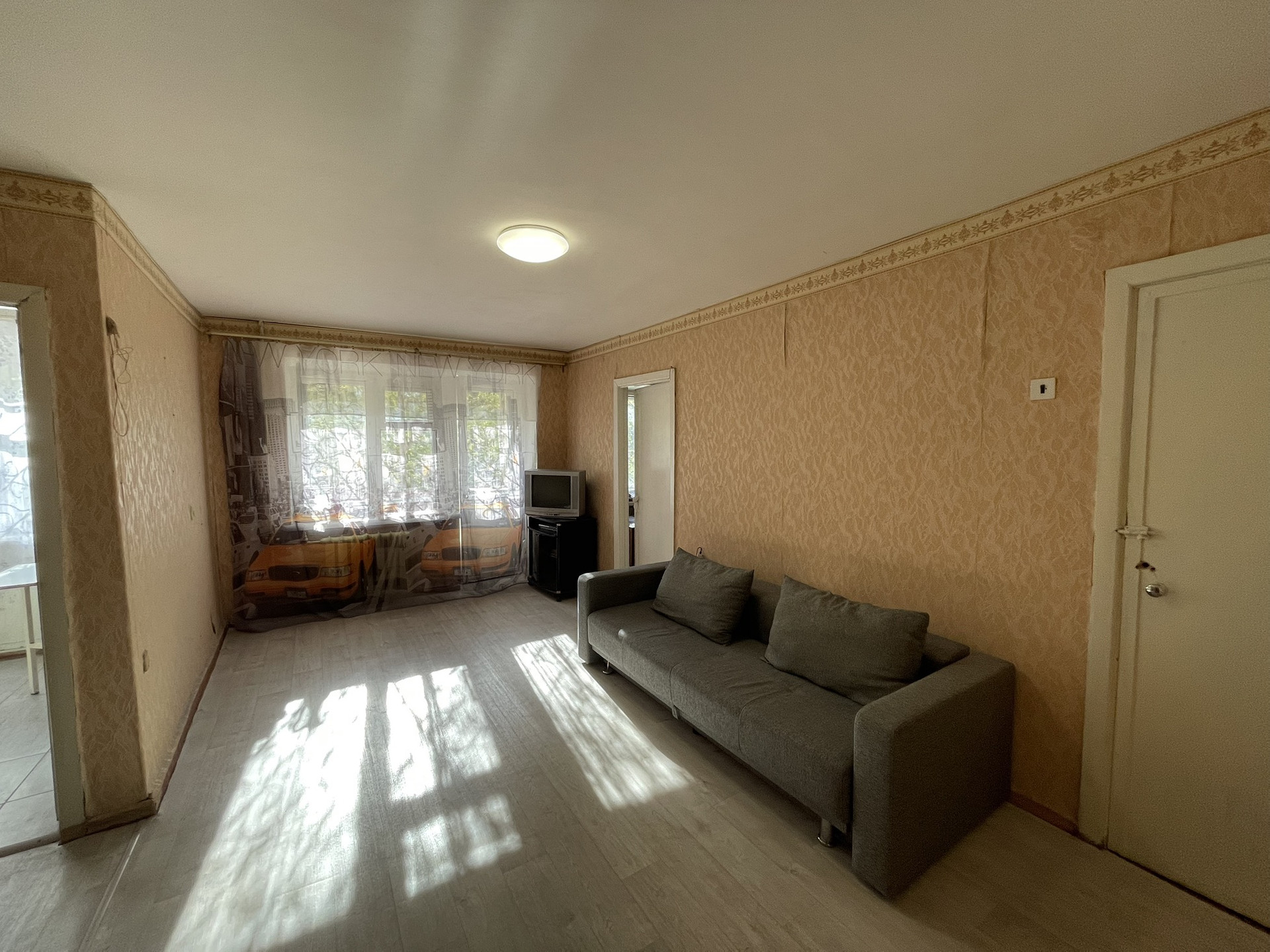 Кухонный гарнитур с газовой плитой остаются новым собственникам. Основная комната и спальня правильной геометрической формы. Так же есть гардеробная. В основной комнате расположен выход на балкон.