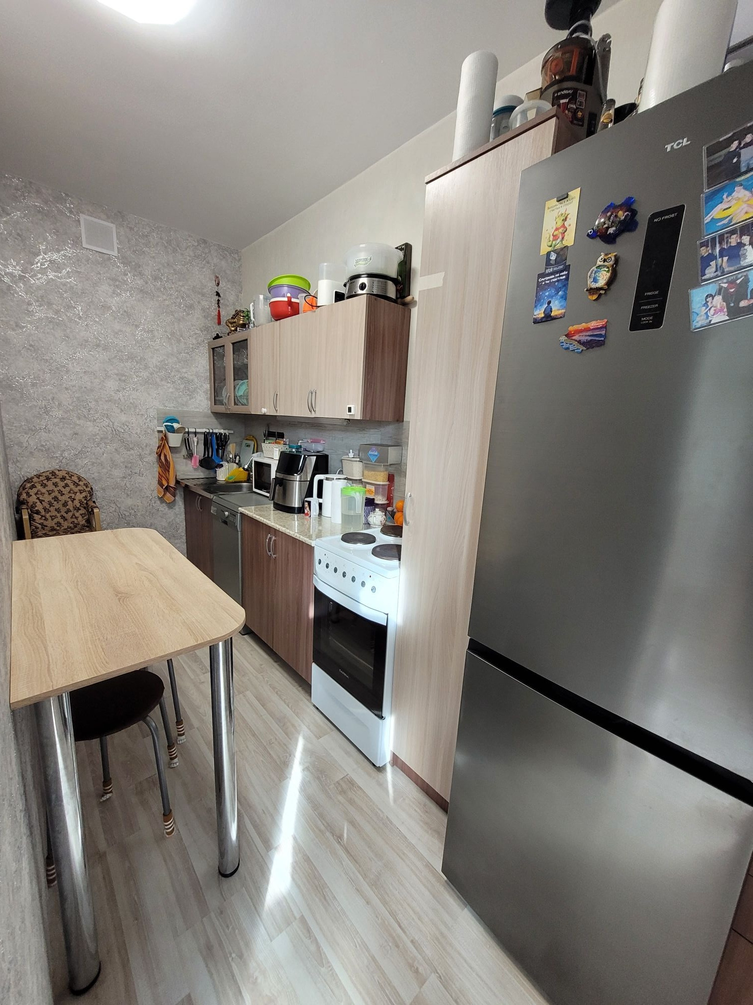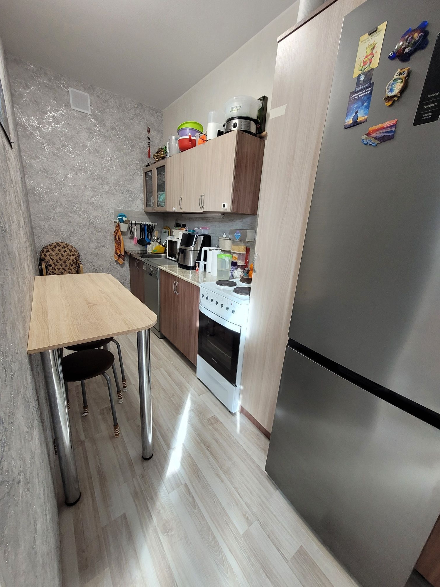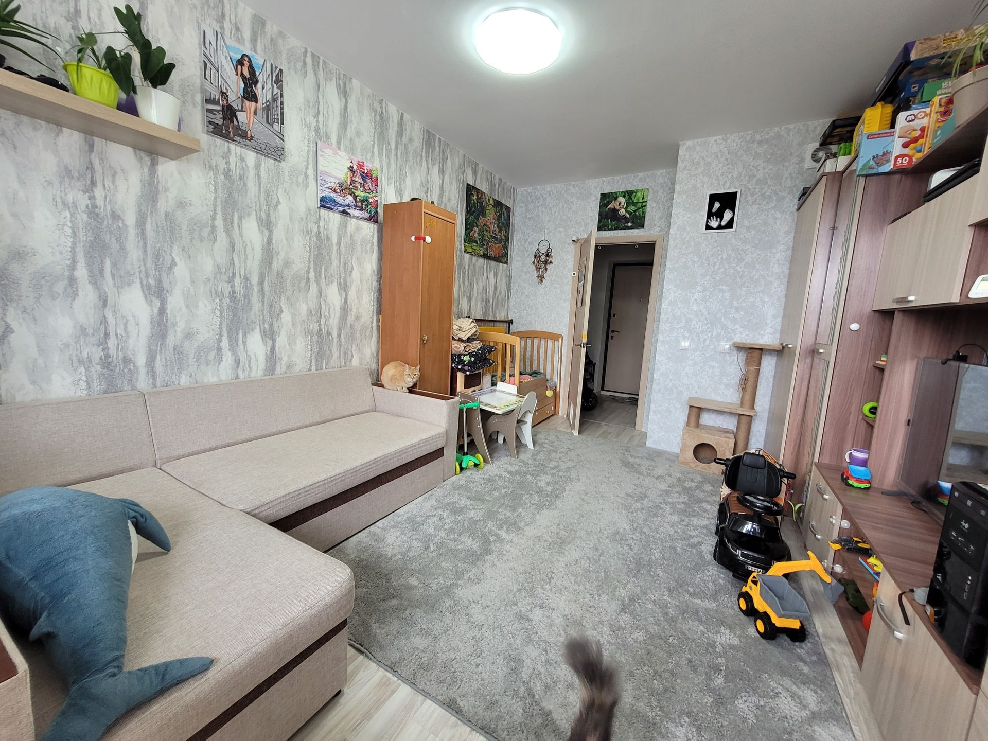В квартире остаётся: кухонный гарнитур и стол кухонный, из комнаты шкаф пенал, в прихожей шкаф с зеркалом.