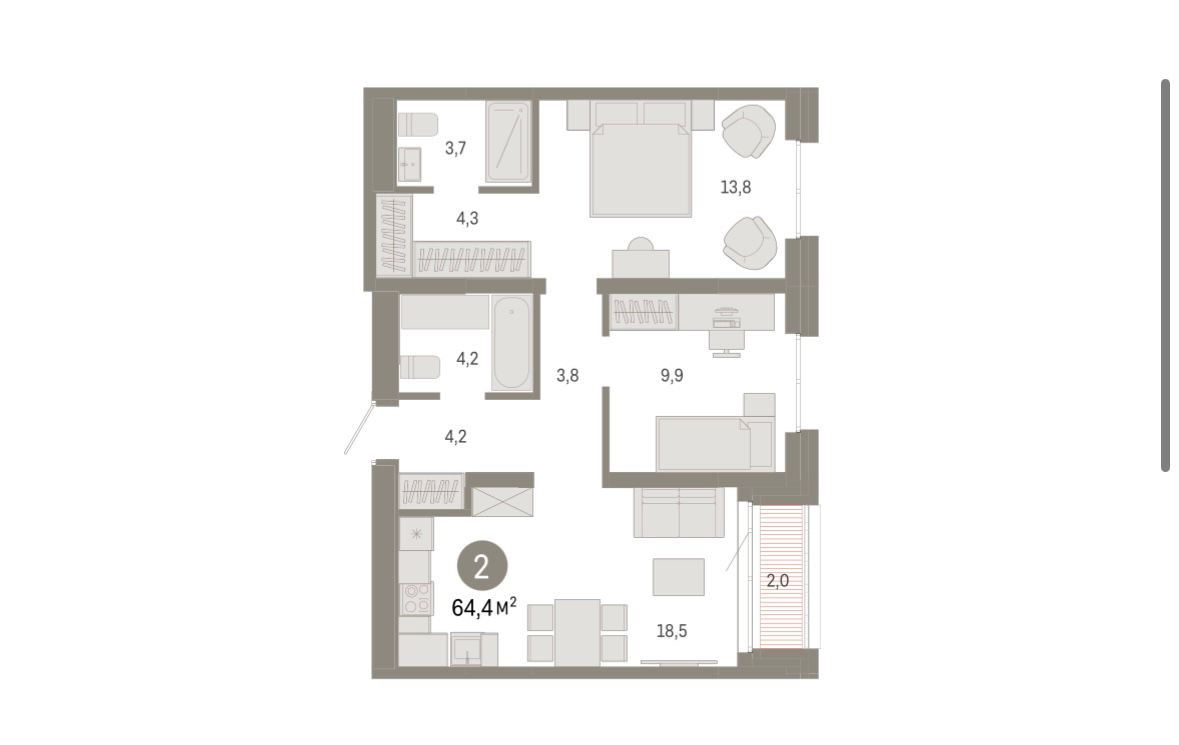 Общая площадь 64.4 м2