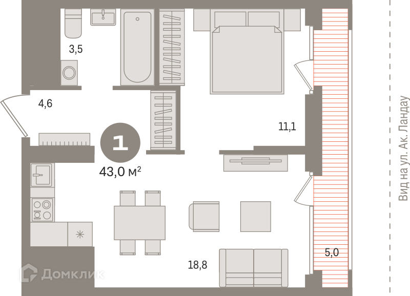 1-комнатная квартира, 43.5 м2, этаж 3 / 5, на продажу в Екатеринбурге, улица Академика Ландау, 9
