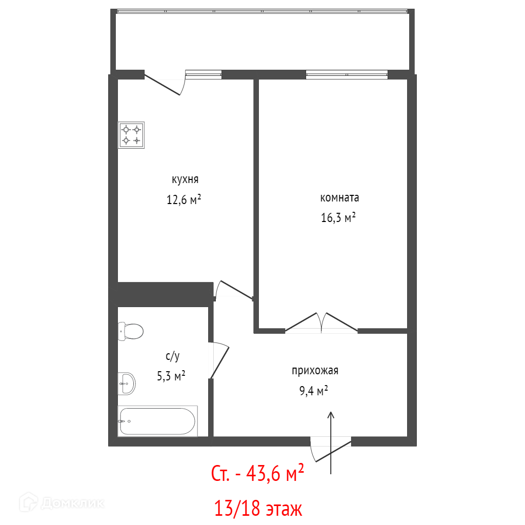 Общая площадь 43.6 м2