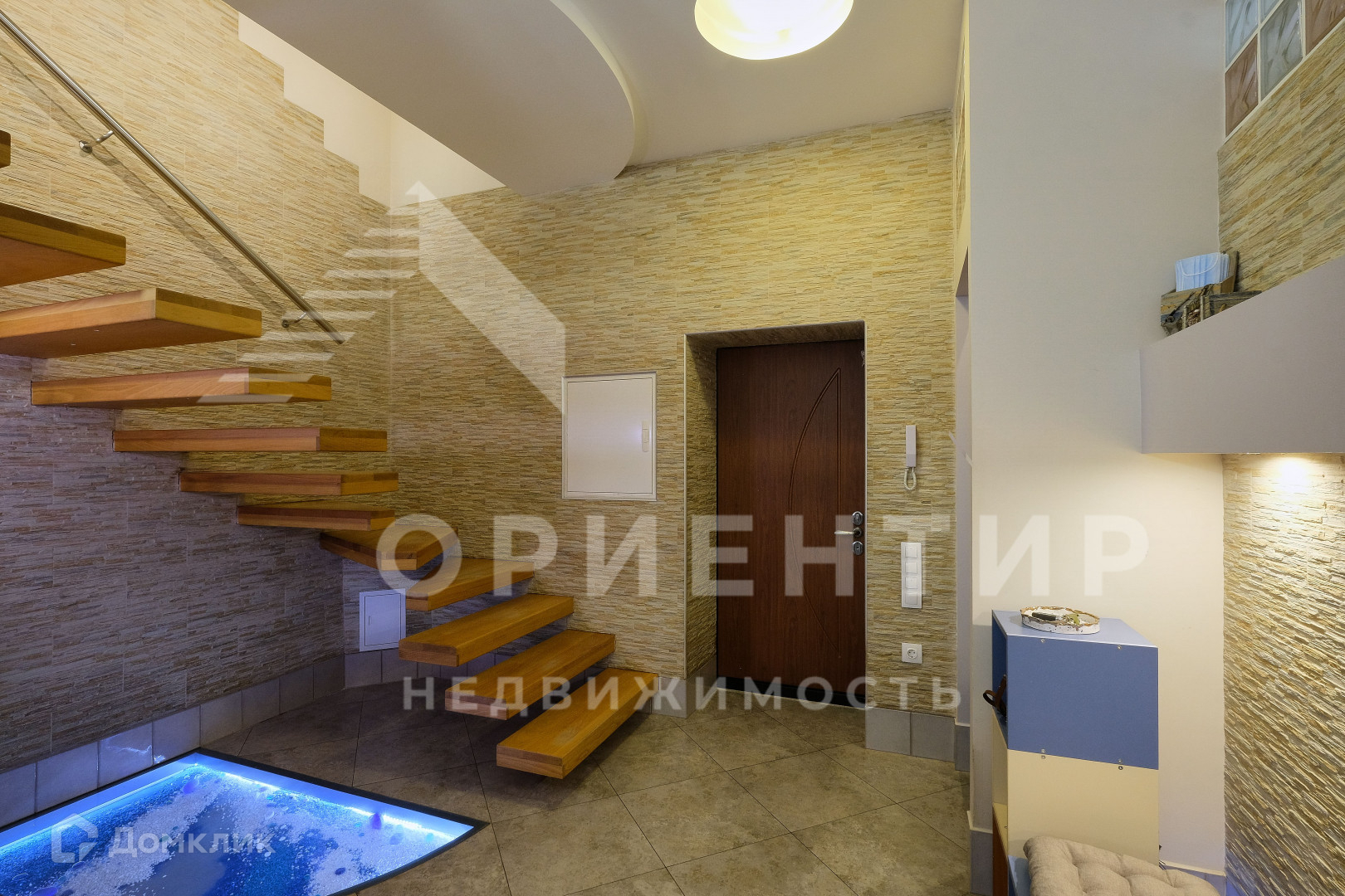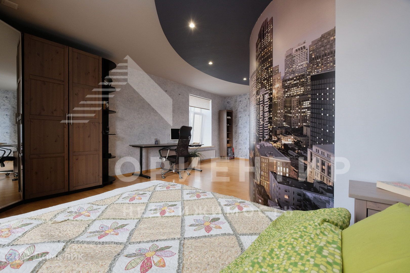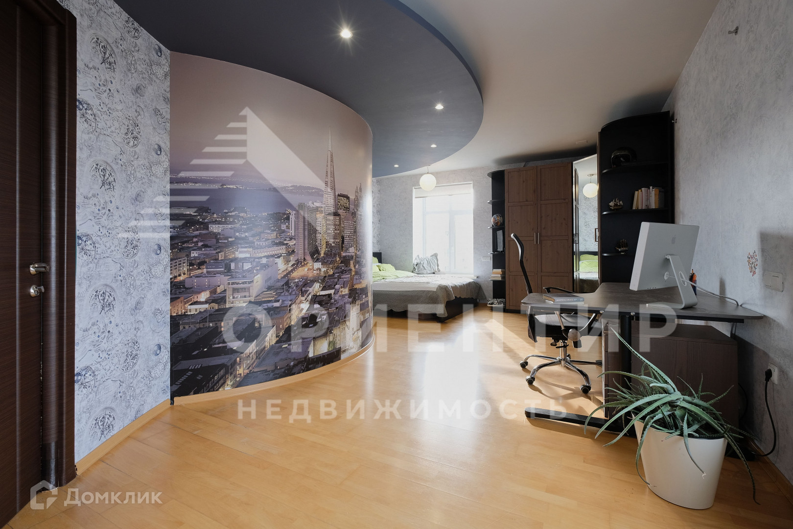 Квартира располагается на 8-9 этажах. На первом уровне квартиры потолок 3,5 метра, что добавляет объекту простора и фундаментальности. Располагается прихожая, кухня-гостиная. Две спальни и санузел. На втором уровне три спальни, два санузла, один из которых 16 м2 и общее пространство (аналог гостиной комнаты). Отделка выполнена из качественных материалов. Окна выходят как на центр города (одно из окон панорамное), так и на аллею ул. Мира.