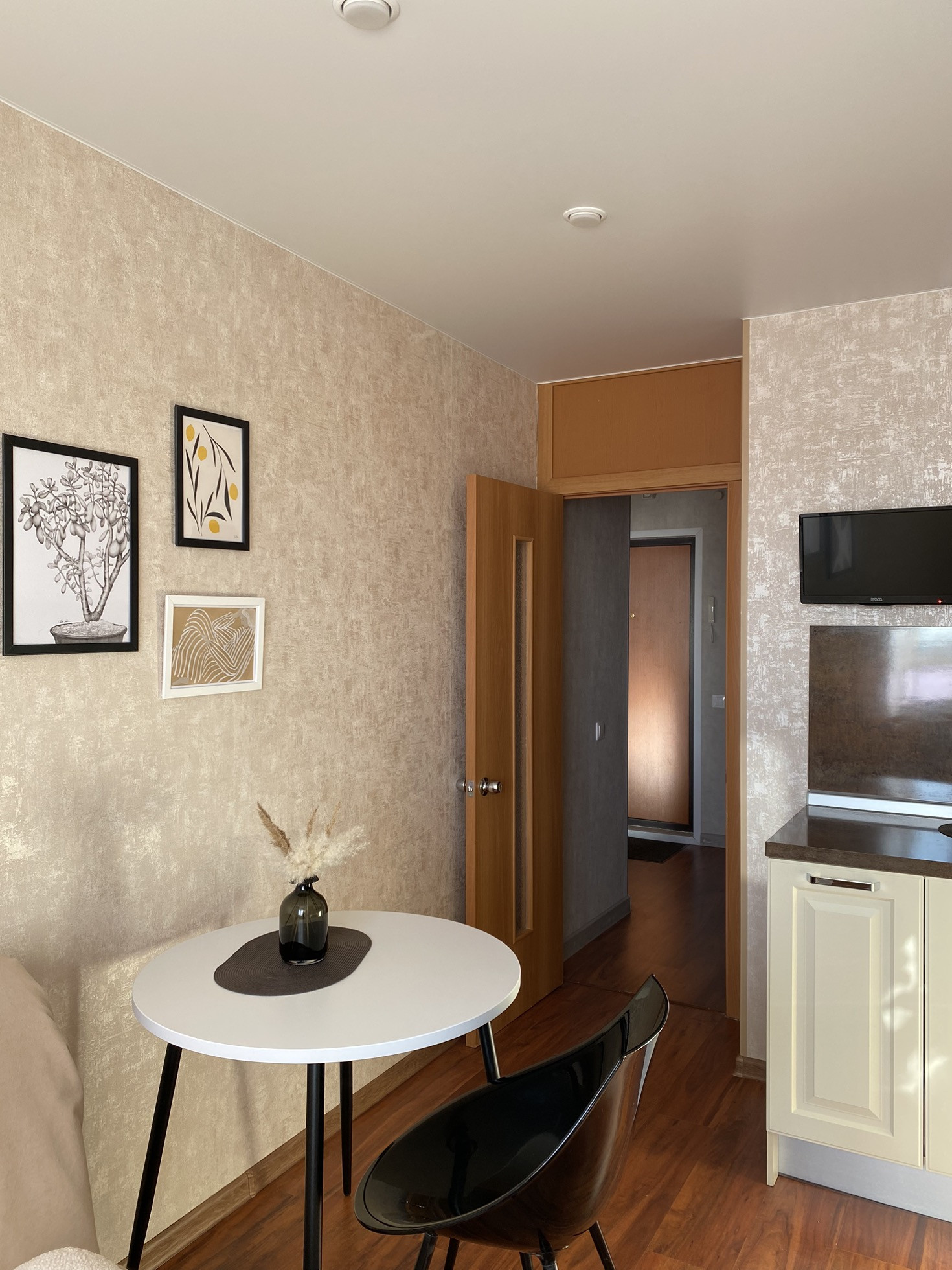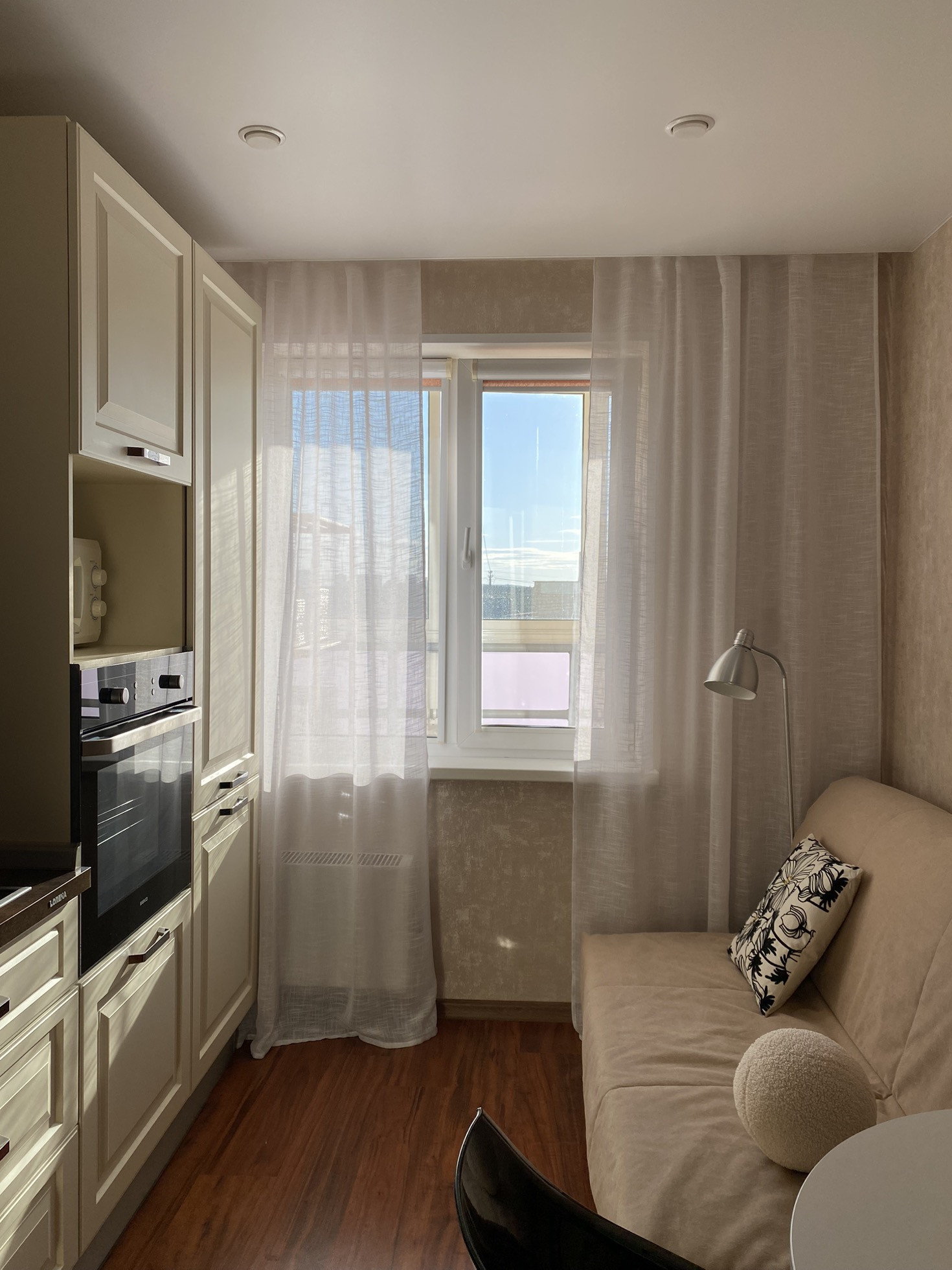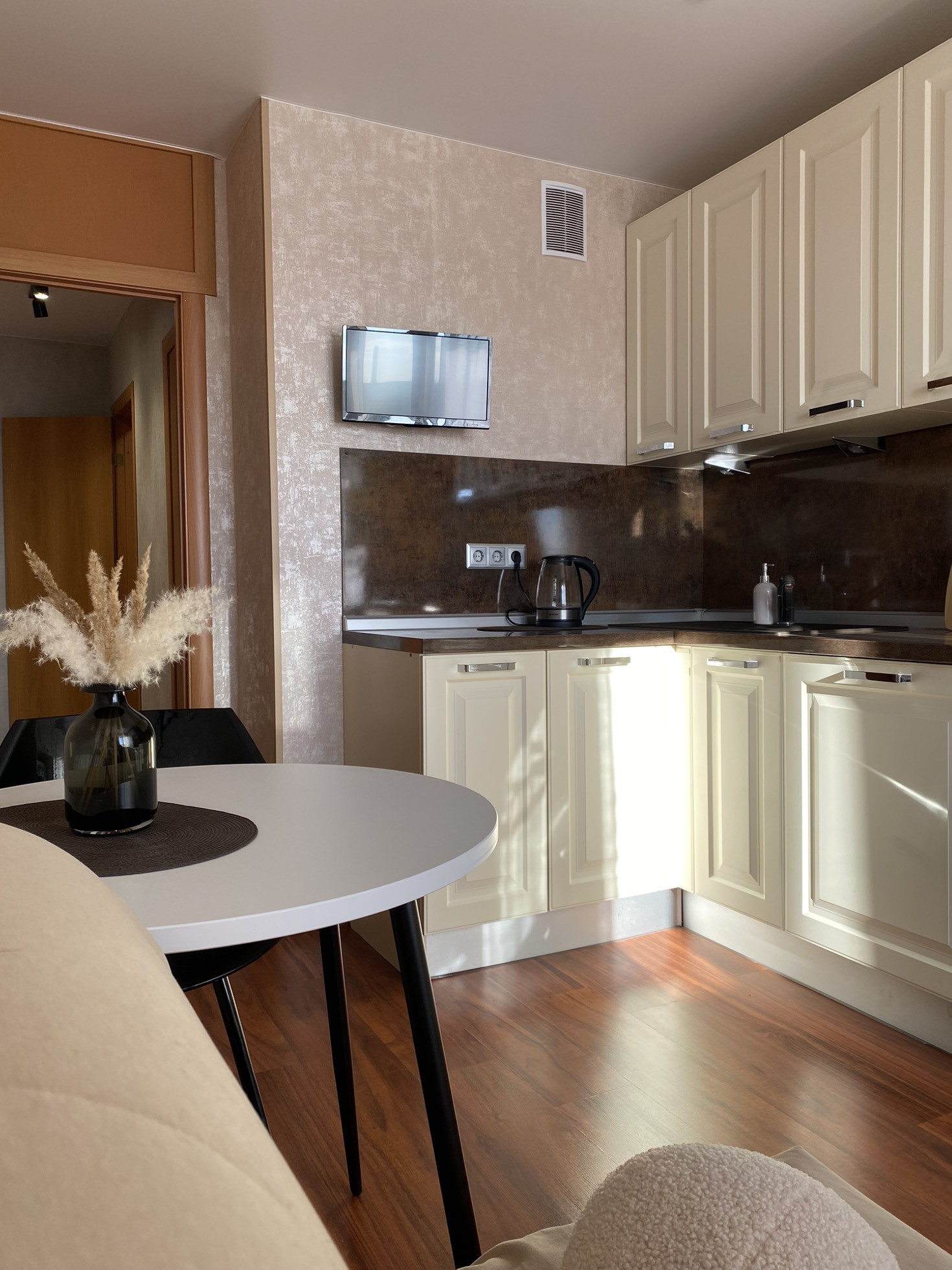 Кухня оборудована кухонным гарнитуром Lorena с встроенным духовым шкафом и варочной панелью. В прихожей организована гардеробная с дверями-купе.