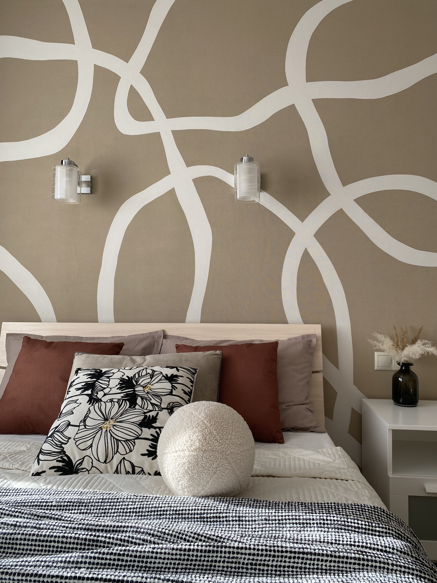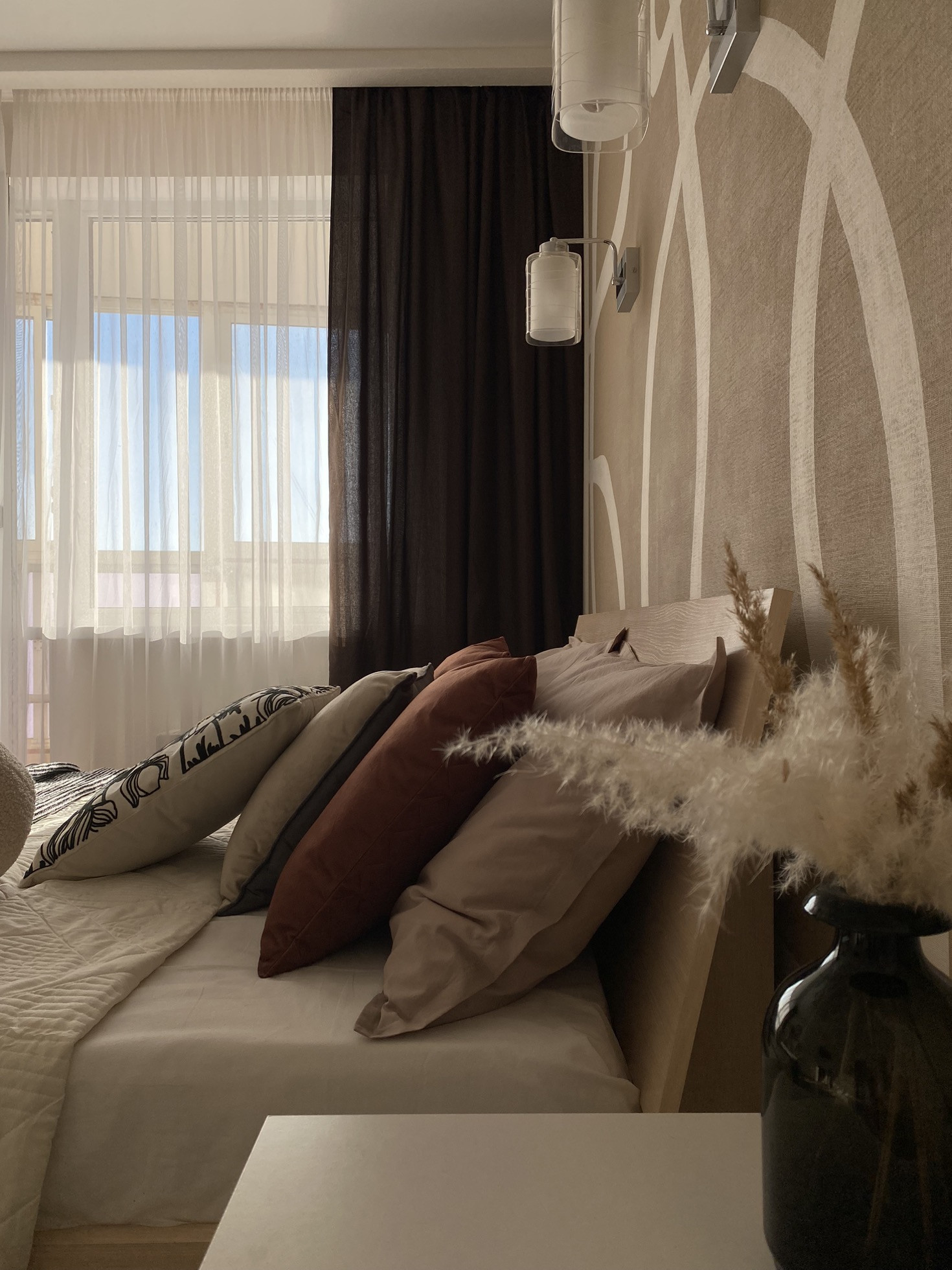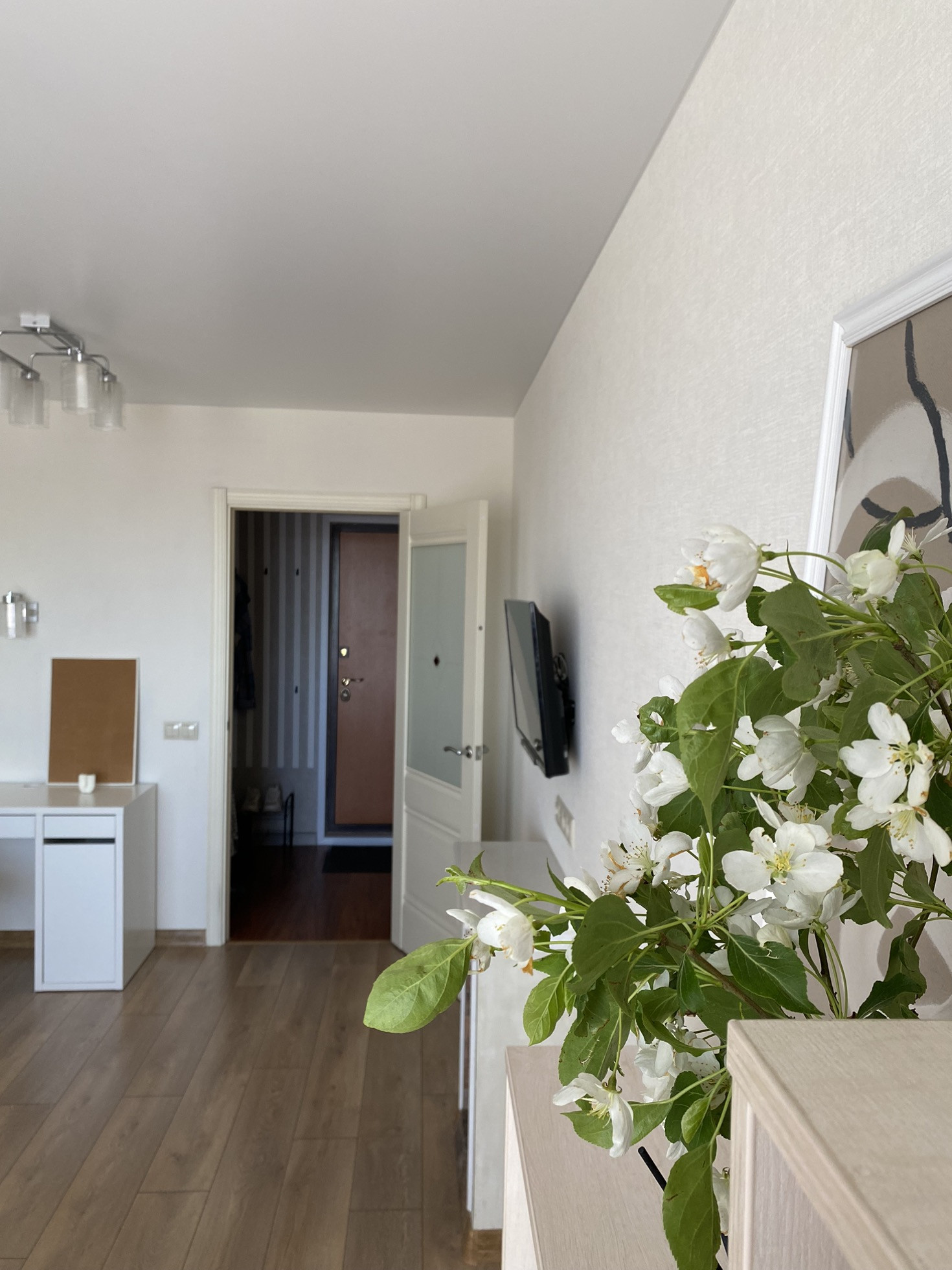 Кухня оборудована кухонным гарнитуром Lorena с встроенным духовым шкафом и варочной панелью. В прихожей организована гардеробная с дверями-купе.