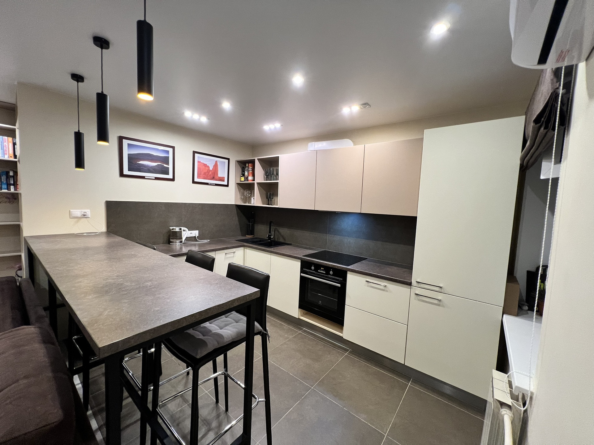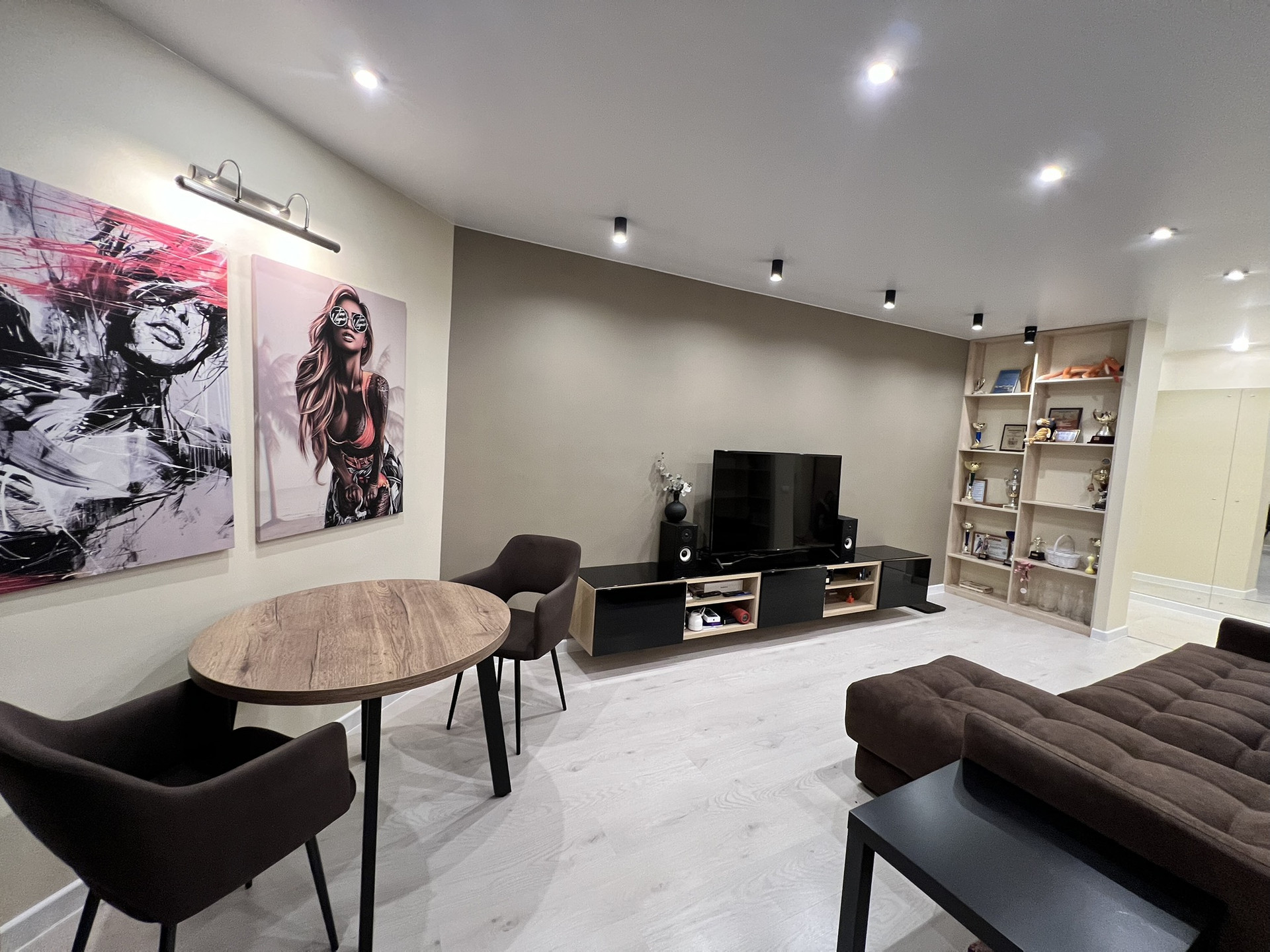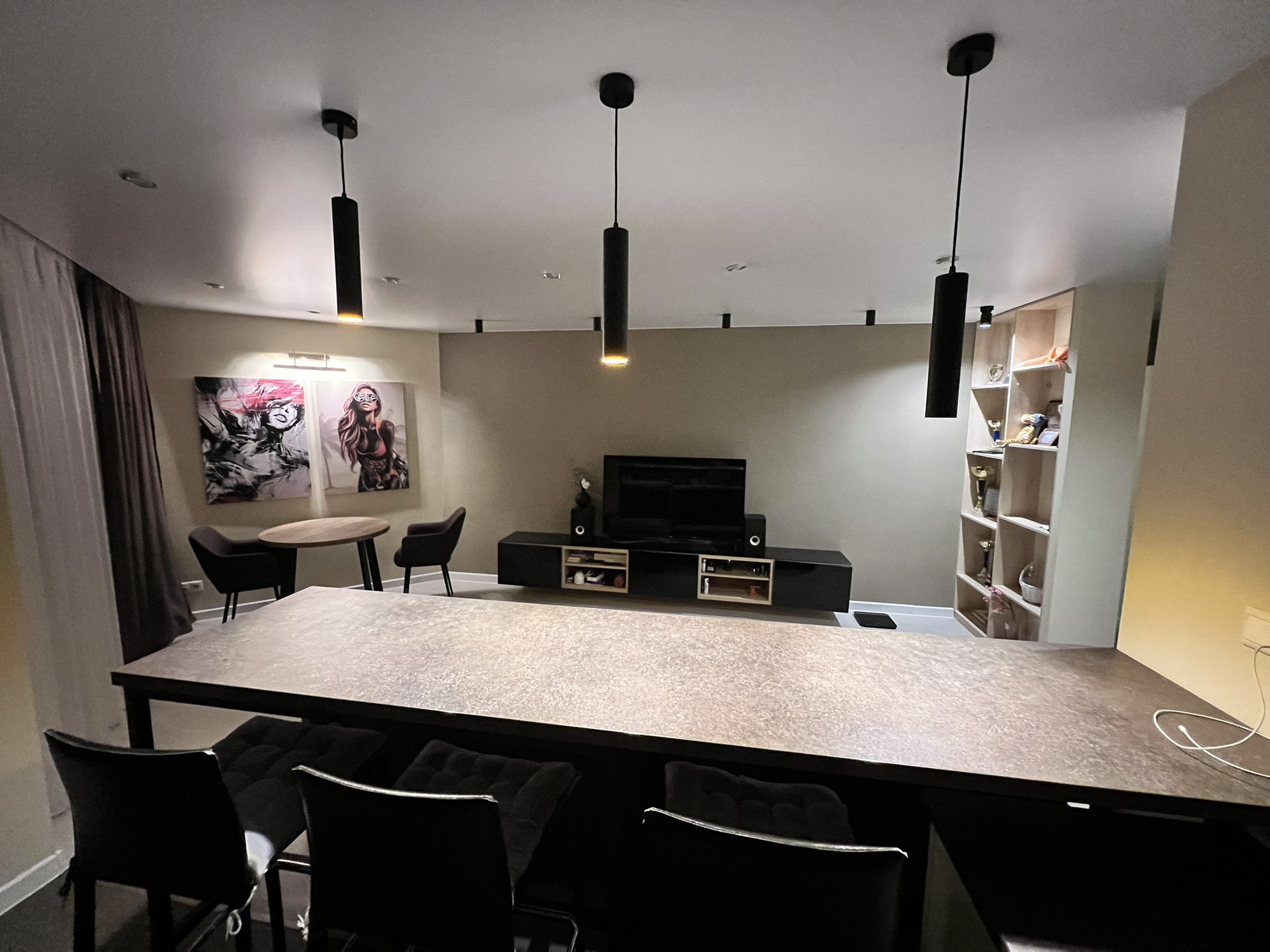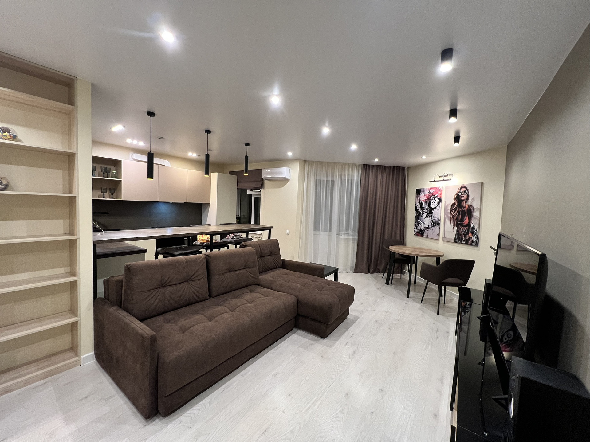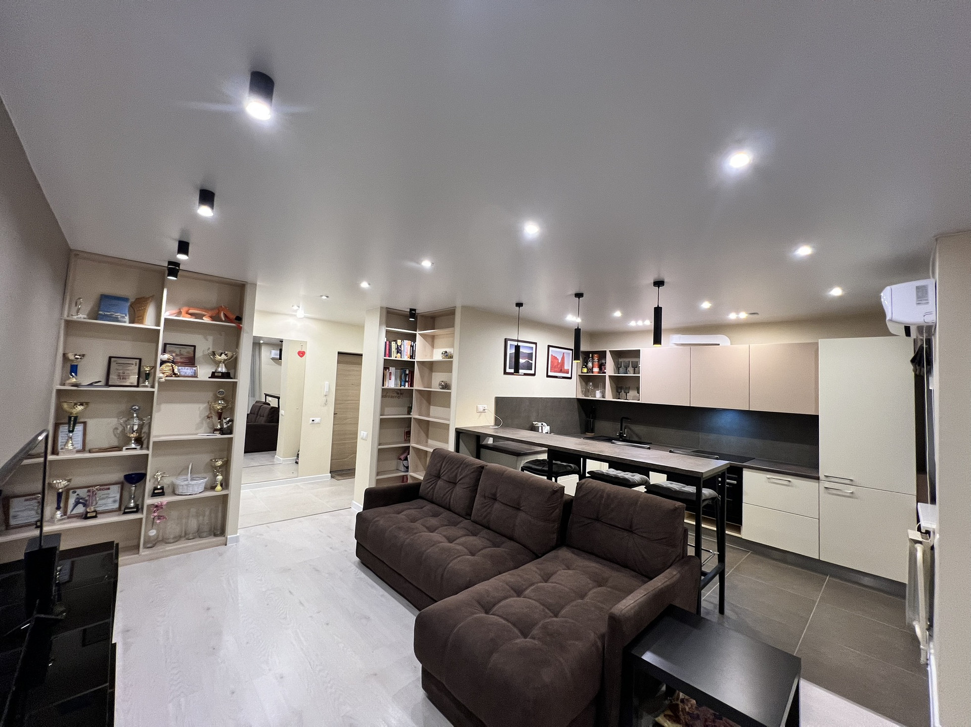 Встроенные стеллажи в комнате , диван, барная стойка.