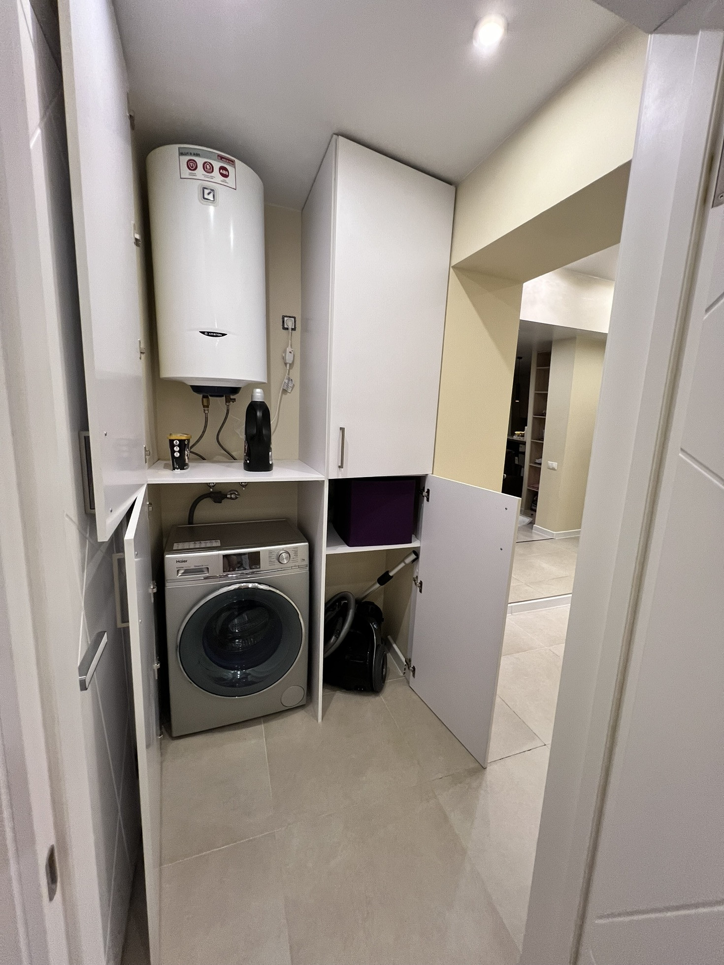 Сделан отдельно хоз блок для стиралки, водонагревателя, пылесоса и тп.