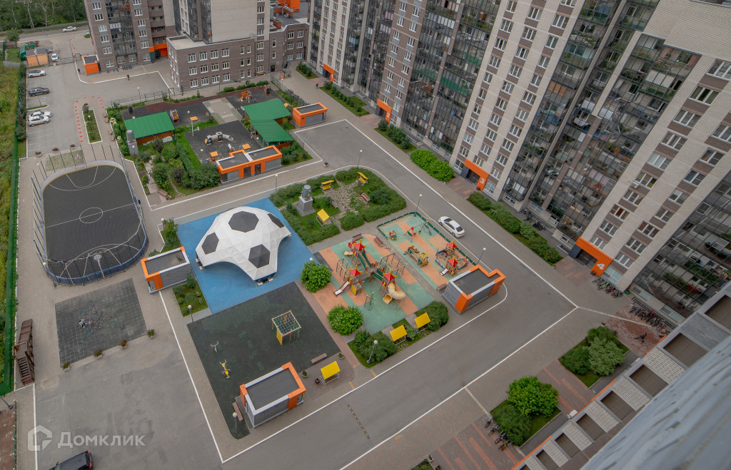 Двор без машин, под домом есть подземный паркинг + много мест с бесплатными парковками вокруг дома.