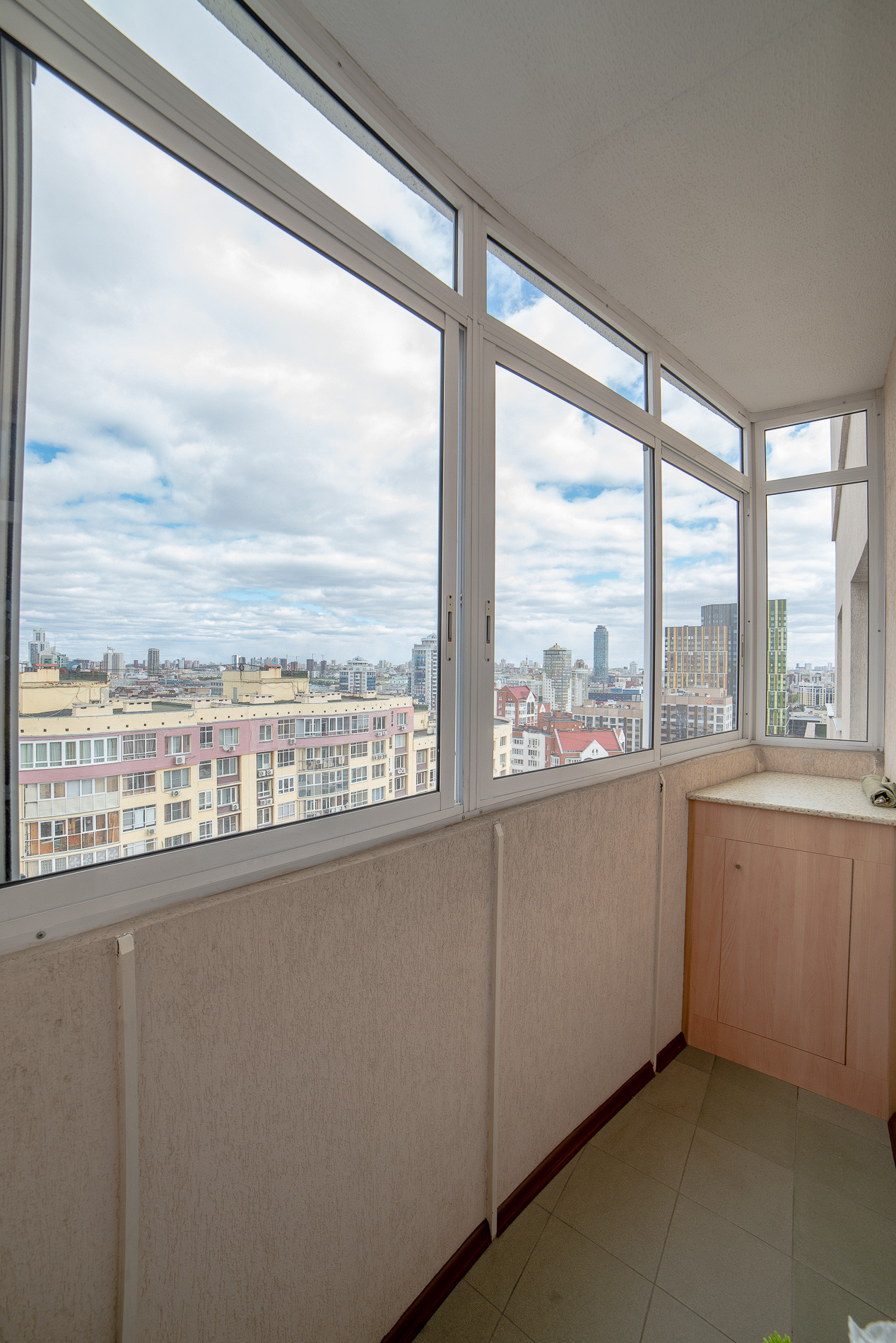 Квартира на 14 этаже (выше только технический этаж), из окон вид на город – можно смотреть салюты, рассветы, закаты из дома.