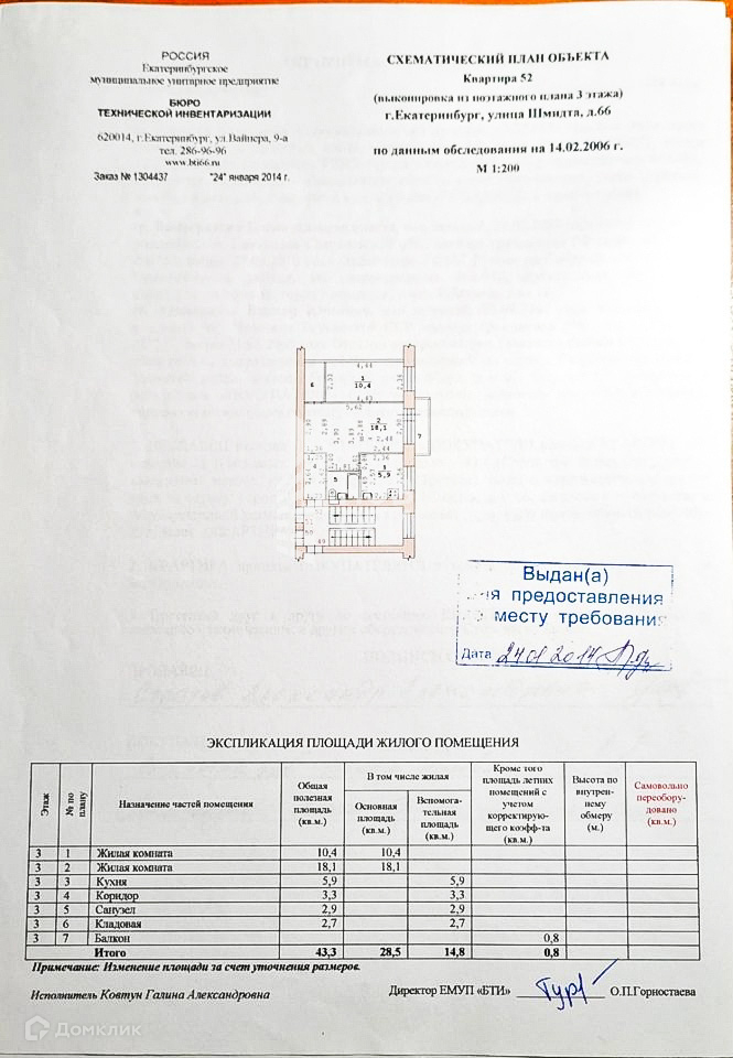 2-комнатная квартира, 43.3 м2, этаж 3 / 5, на продажу в Екатеринбурге, улица Отто Шмидта, 66