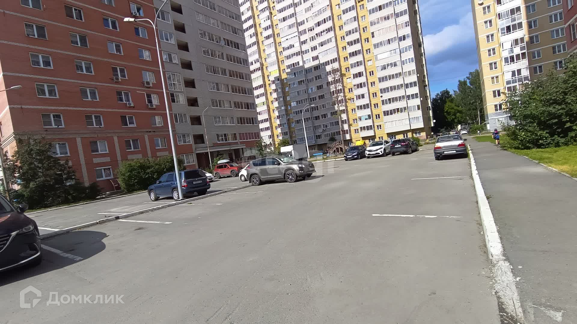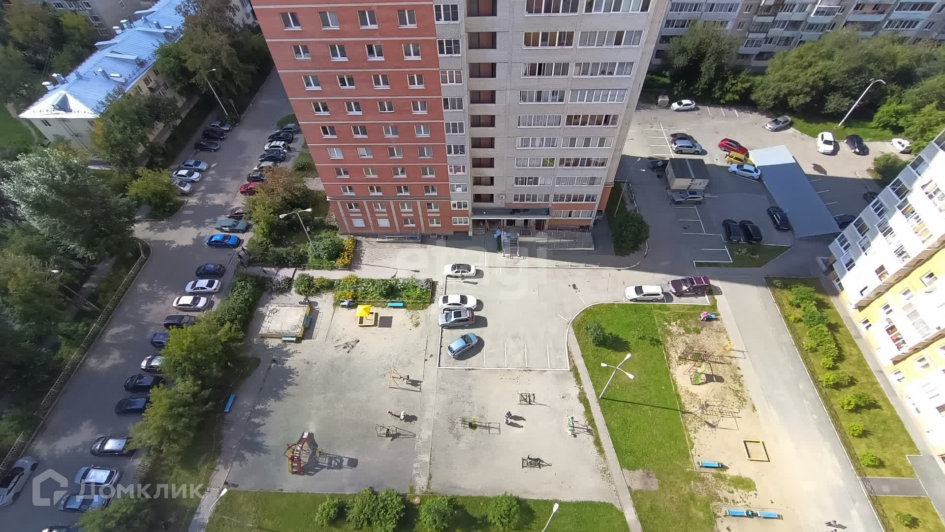 Огороженная территория с парковкой и детской площадкой.