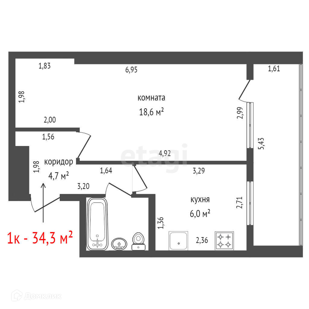 Общая площадь 34.3 м2