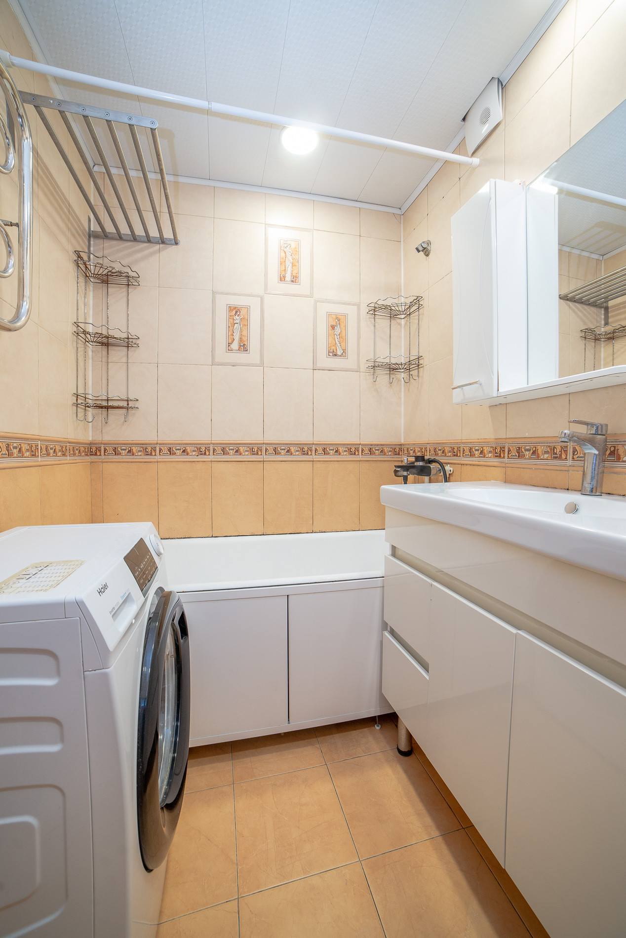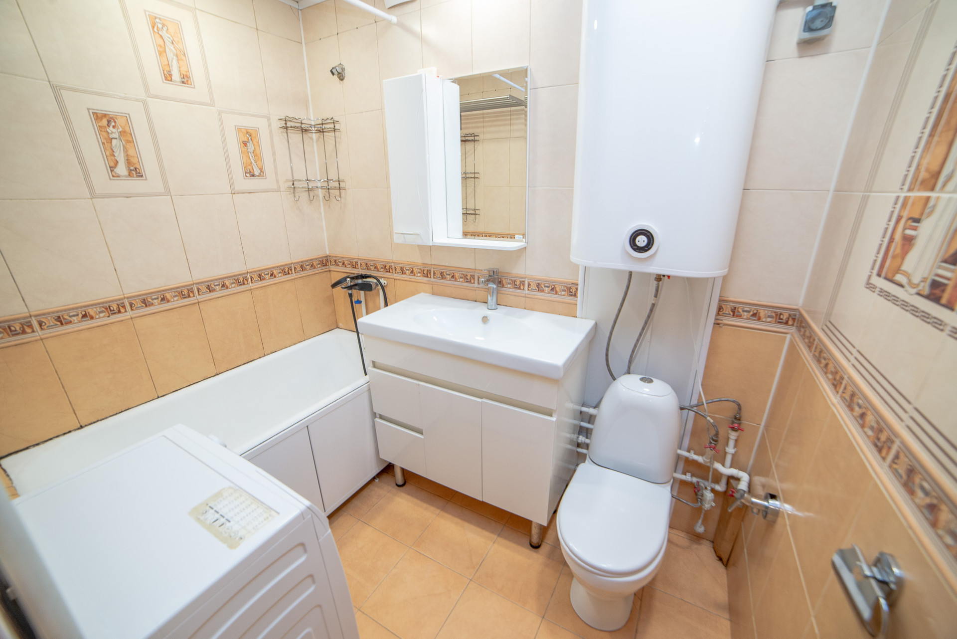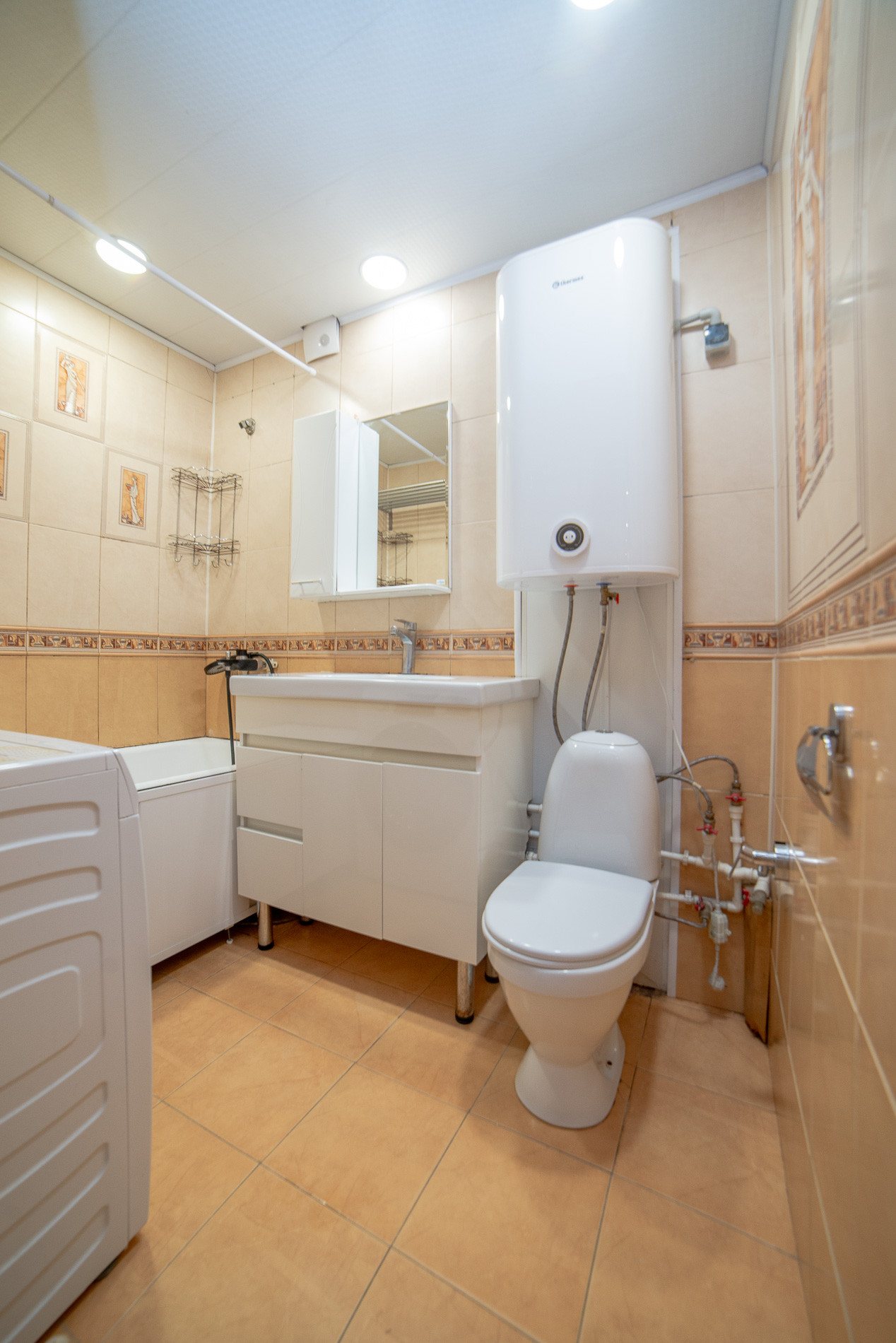 Санузел совмещен, в плитке, водонагреватель остается в подарок покупателю.