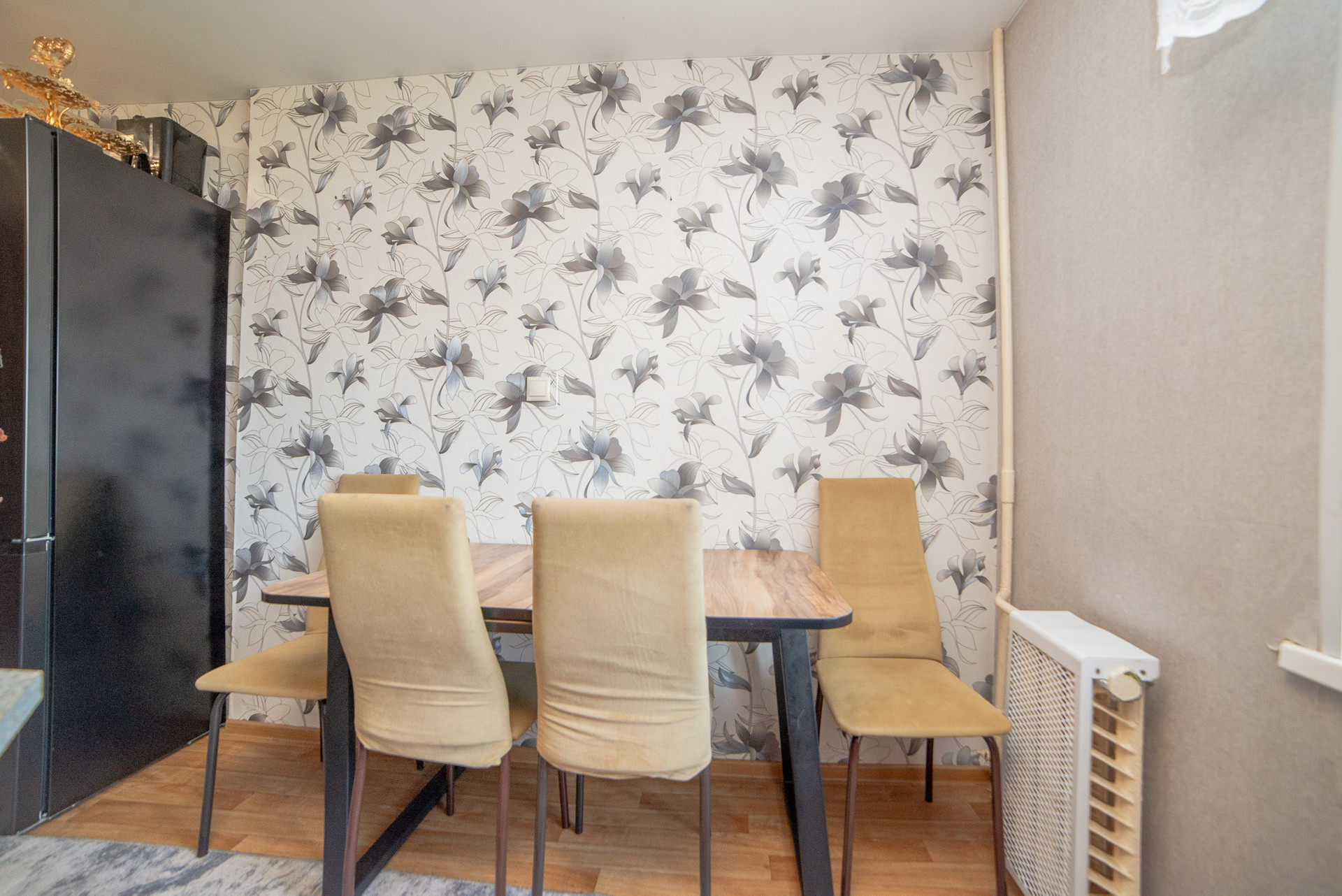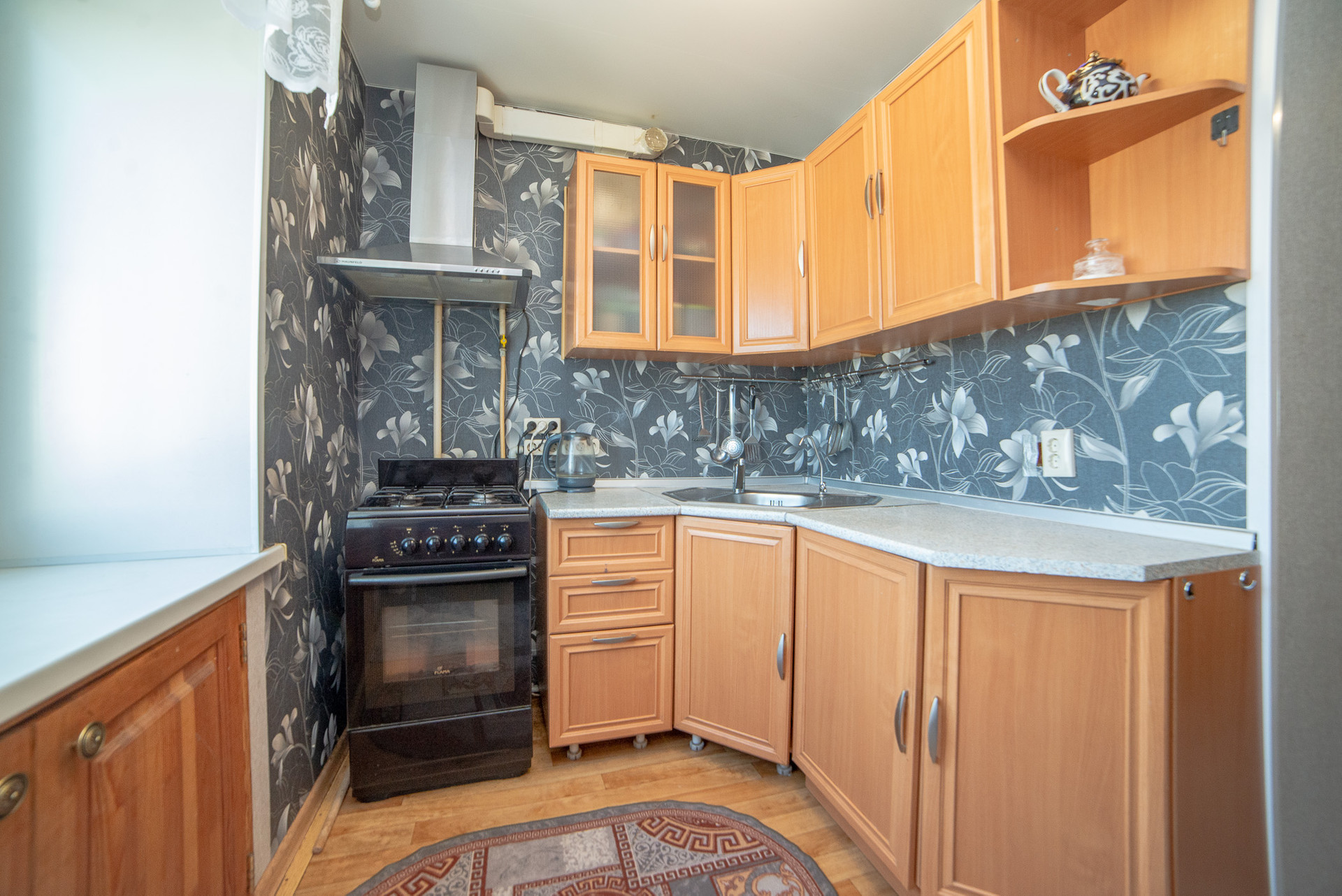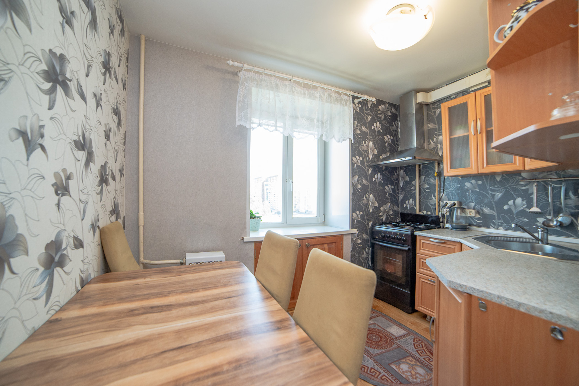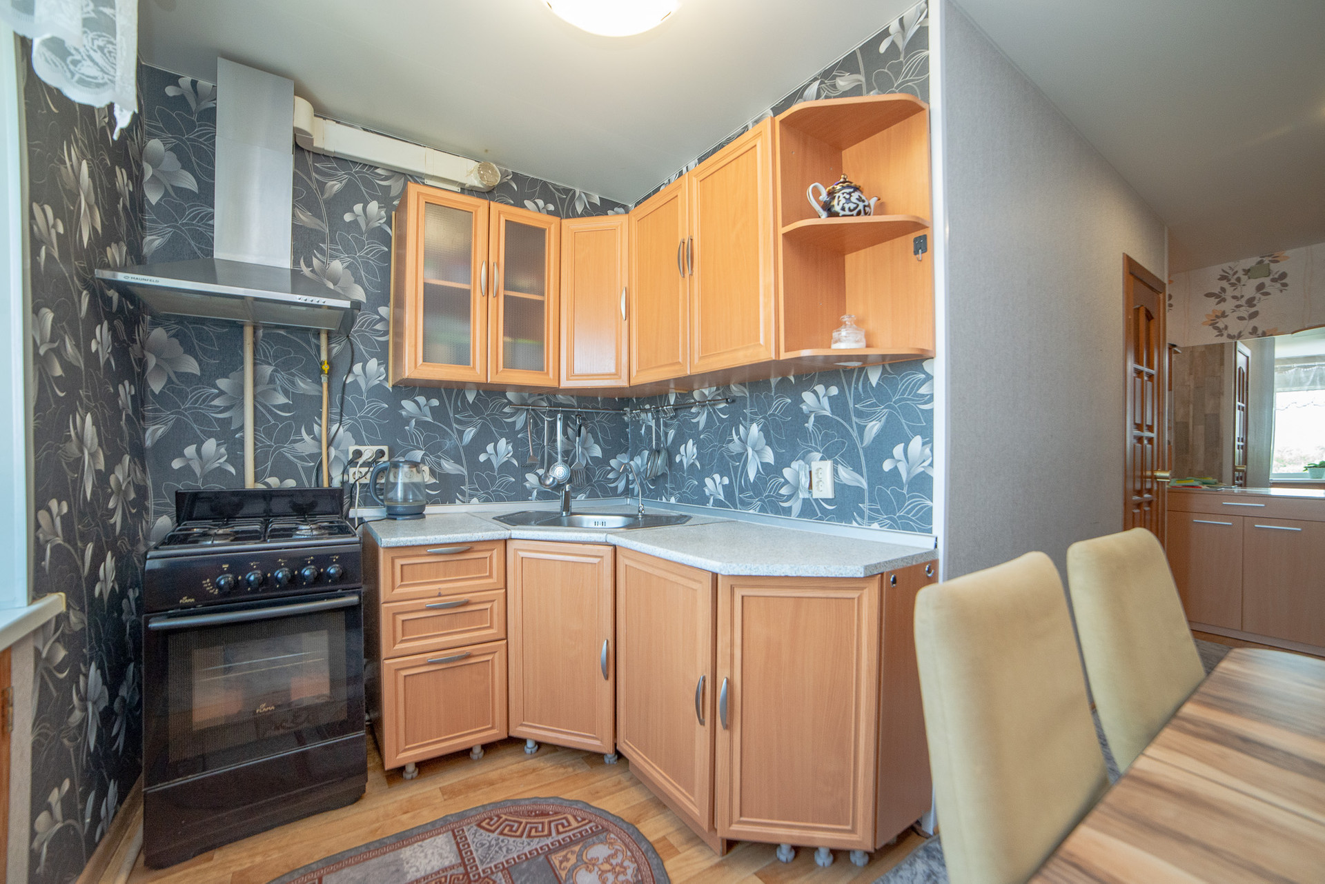 Кухня имеет правильную квадратную форму, в помещении кухни комфортно размещается кухонный гарнитур со всей необходимой техникой, обеденная зона. Установлена современная система фильтров для очистки воды. Кухонный гарнитур с газовой плитой с духовым шкафом и вытяжкой, обеденной зоной, системой очистки воды - остаются в подарок покупателю.