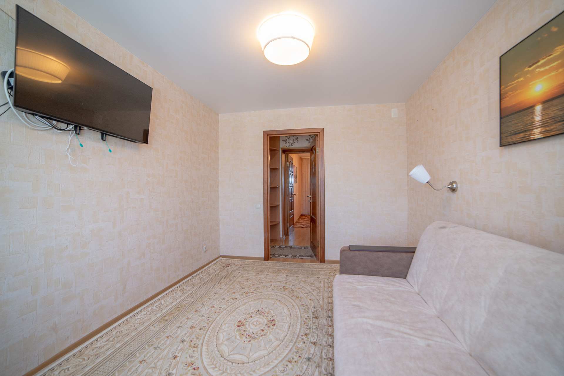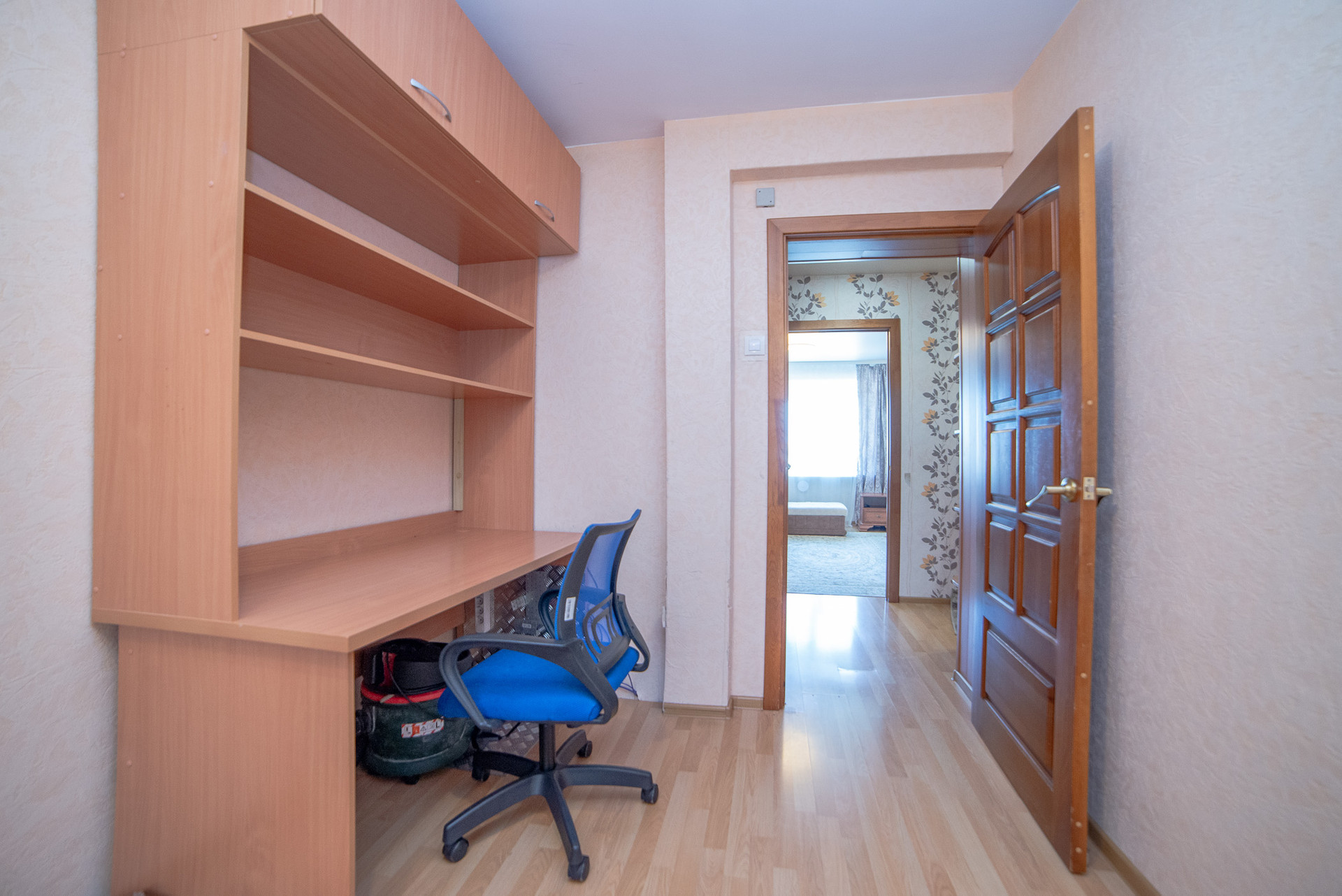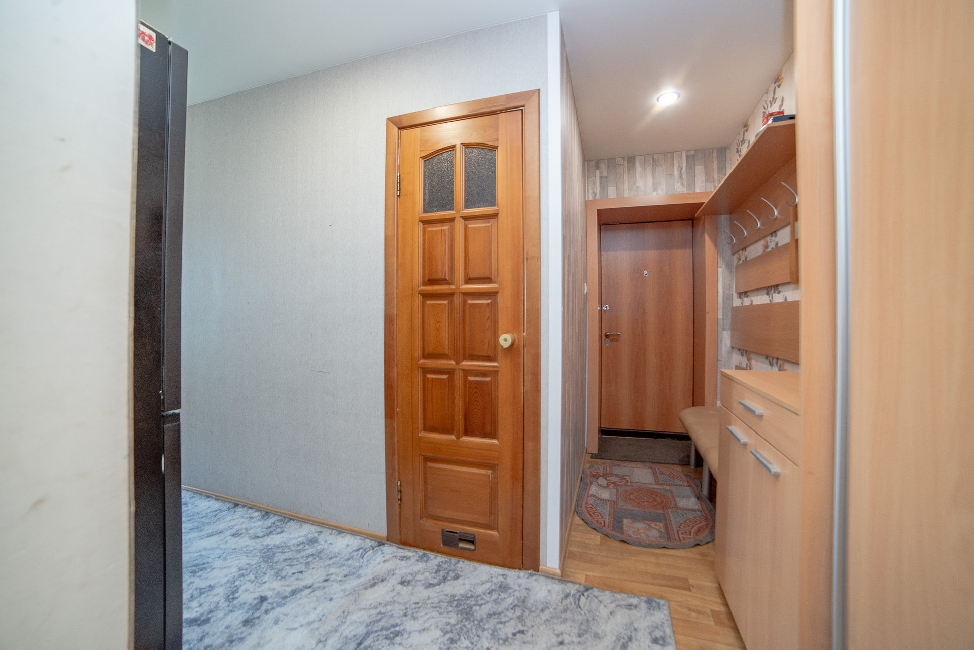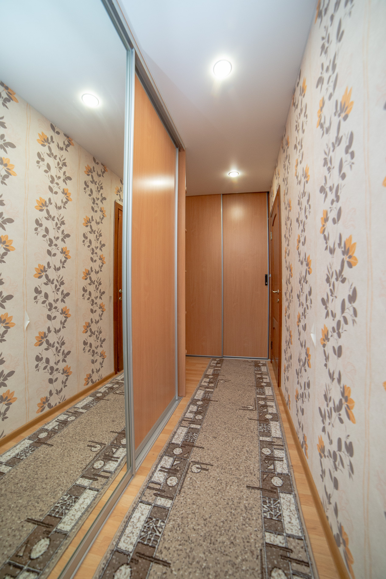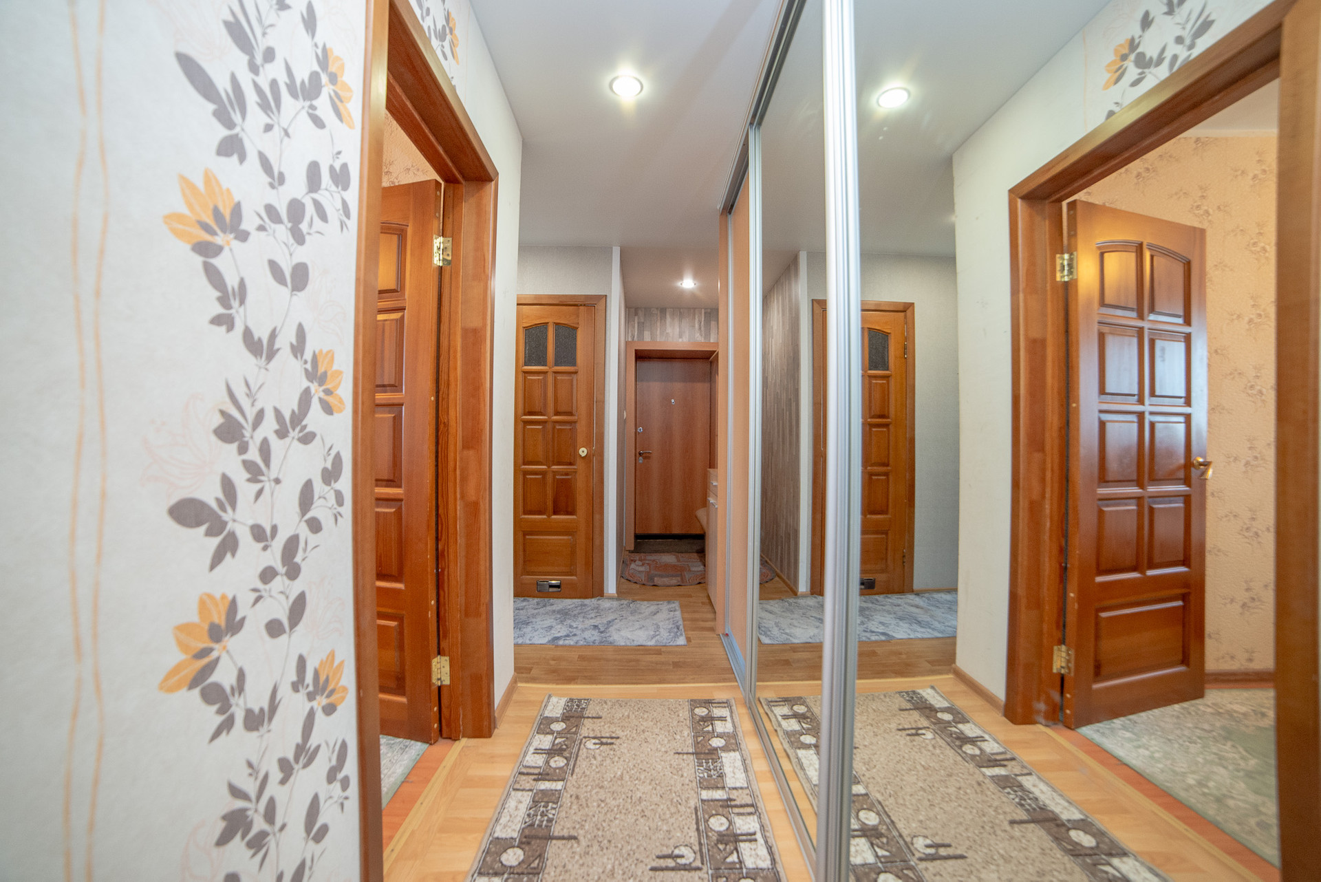 Коридор функционален, оснащен большим шкафом купе и гардеробной, закрывающими потребность в местах для хранения. Шкаф-купе, гардеробная, мебель в прихожей остаются в подарок покупателю.