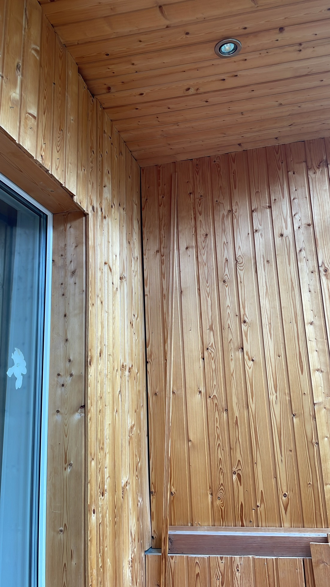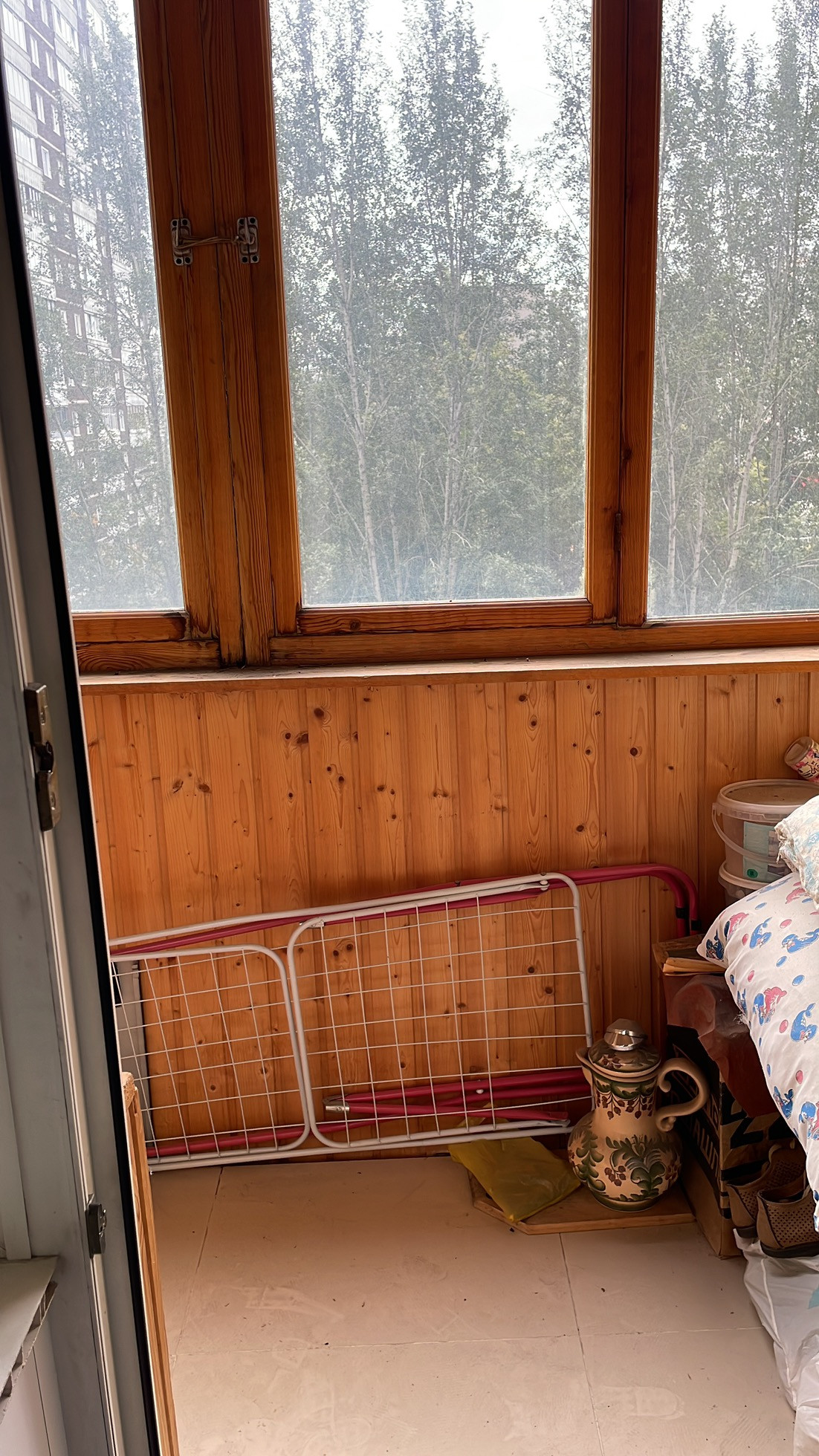 Балкон застекленный обшит и на полу лежит плитка выведен свет