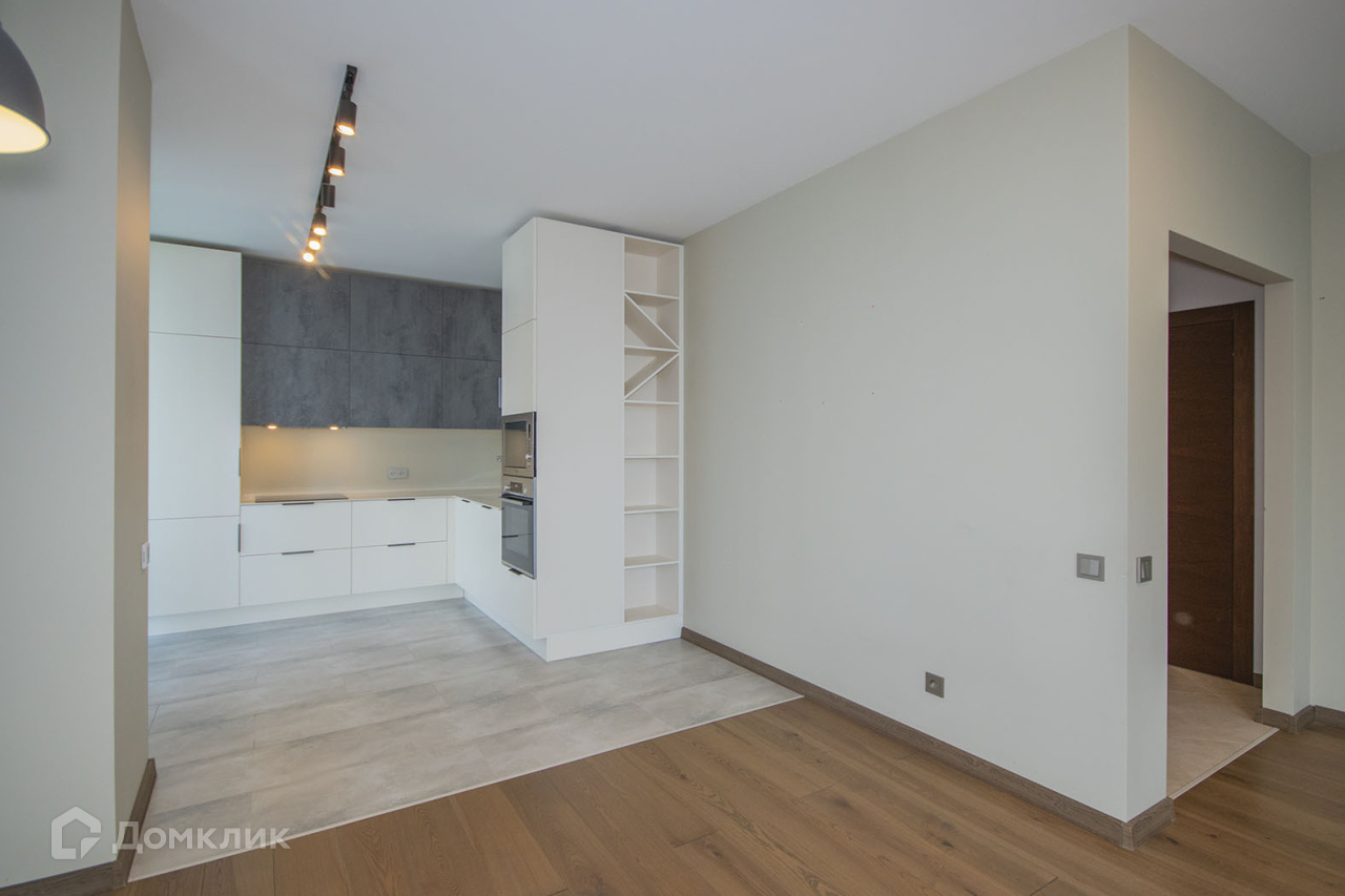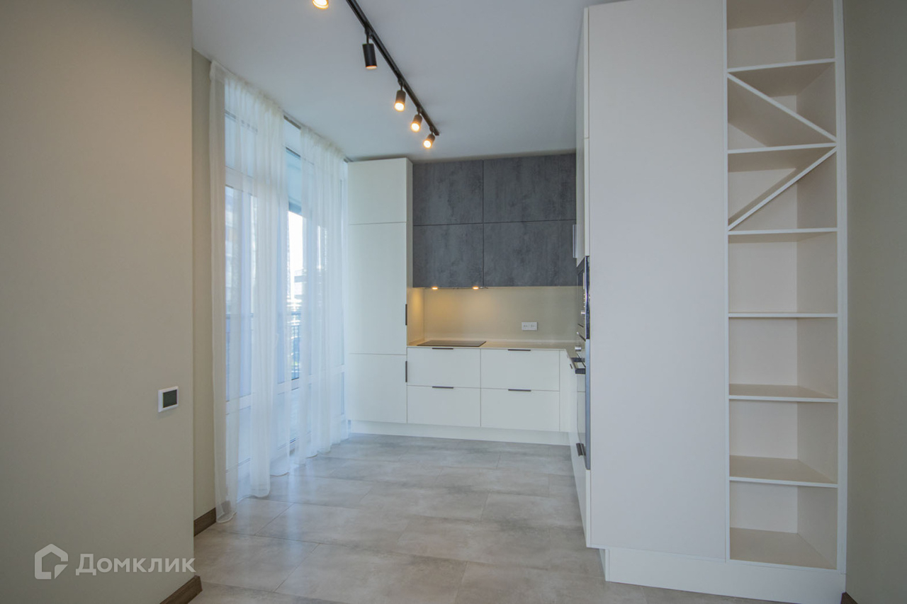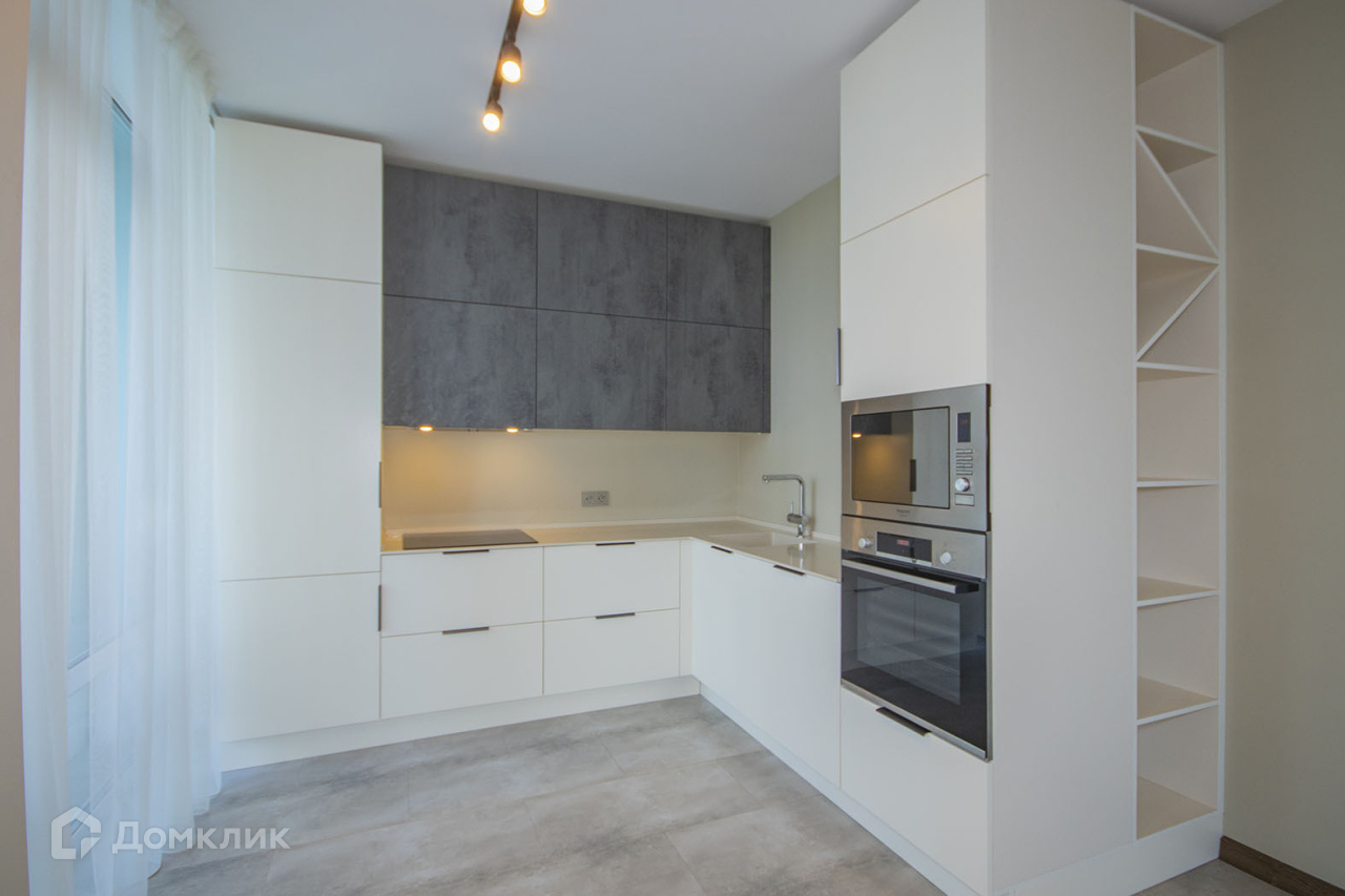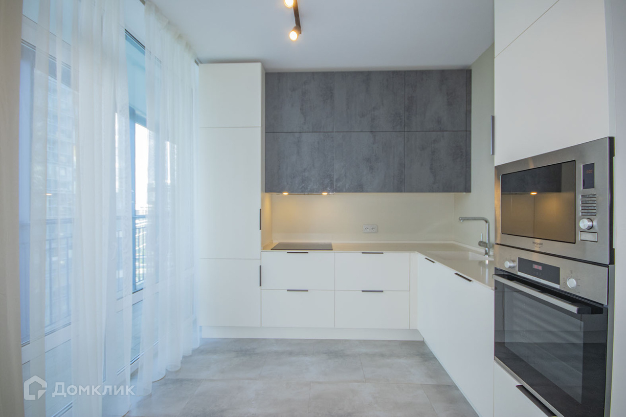 Квартира на 15 этаже, много света за счет большого количества окон и панорамного остекления, просторная и грамотно зонированная  кухня-гостинная, кухонный гарнитур фирмы Гастон с  встроенной кухонной техникой фирм Hotpoint Ariston, BOSCH, MAUNFELD, небольшая уединенная спальная комната,  при входе в квартиру большой холл, есть гардеробная, санузел раздельный.