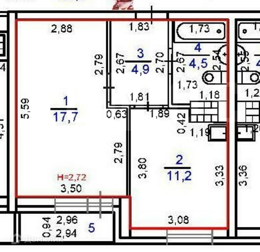 Общая площадь 38,3квм: комната 17,7квм; кухня-гостиная 11,2кв; просторный коридор 5квм + застекленная лоджия 3,5квм с хорошим видом (не окна в окна).