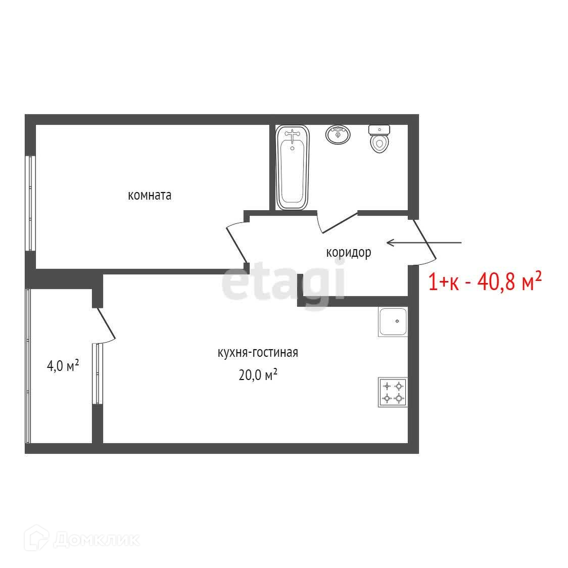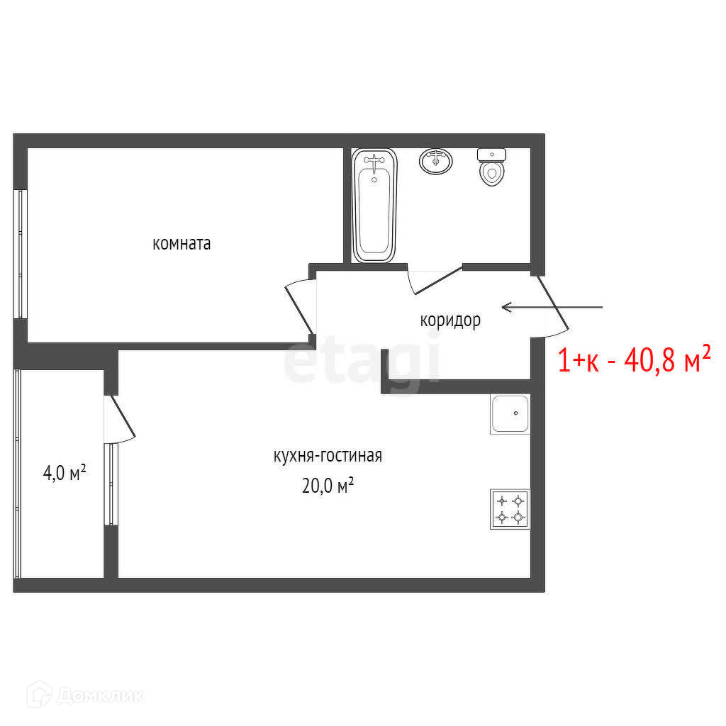 Общая площадь 40.8 м2