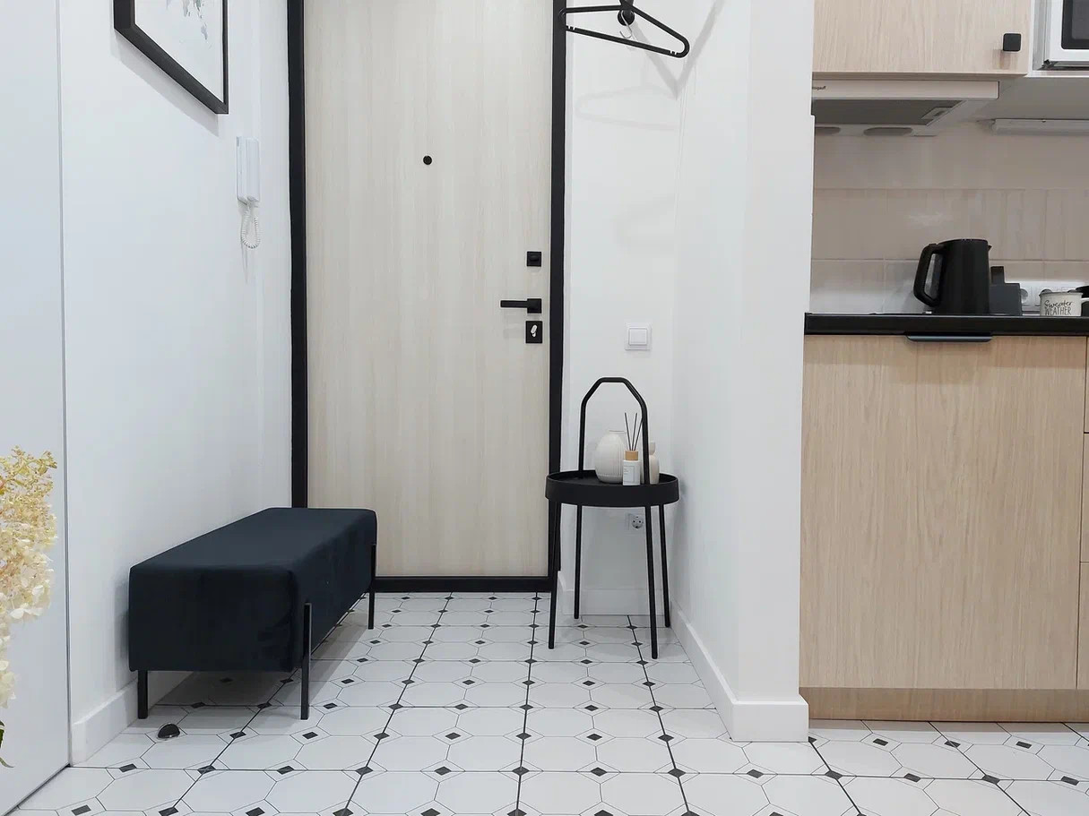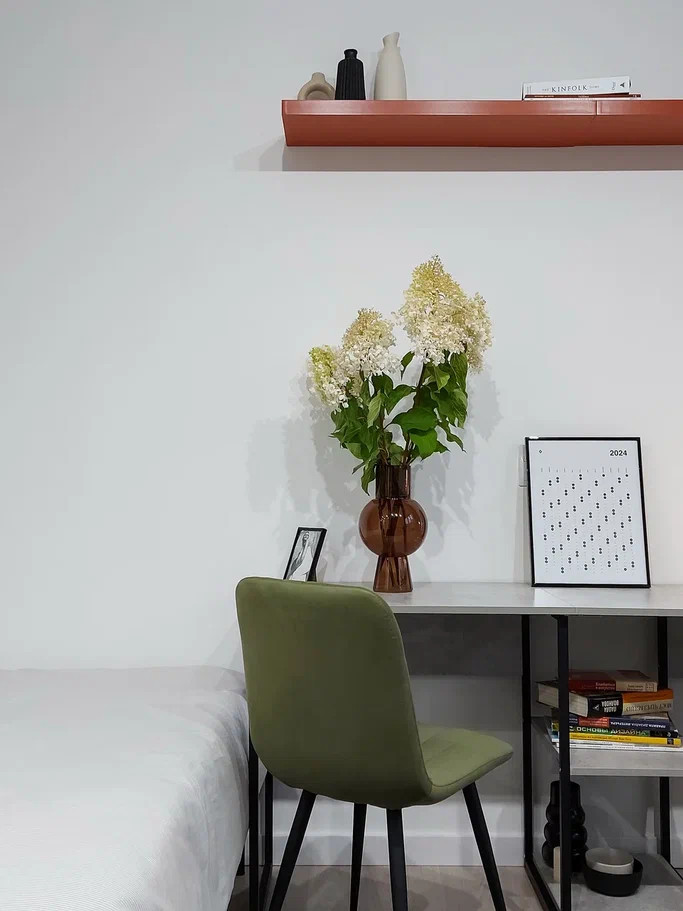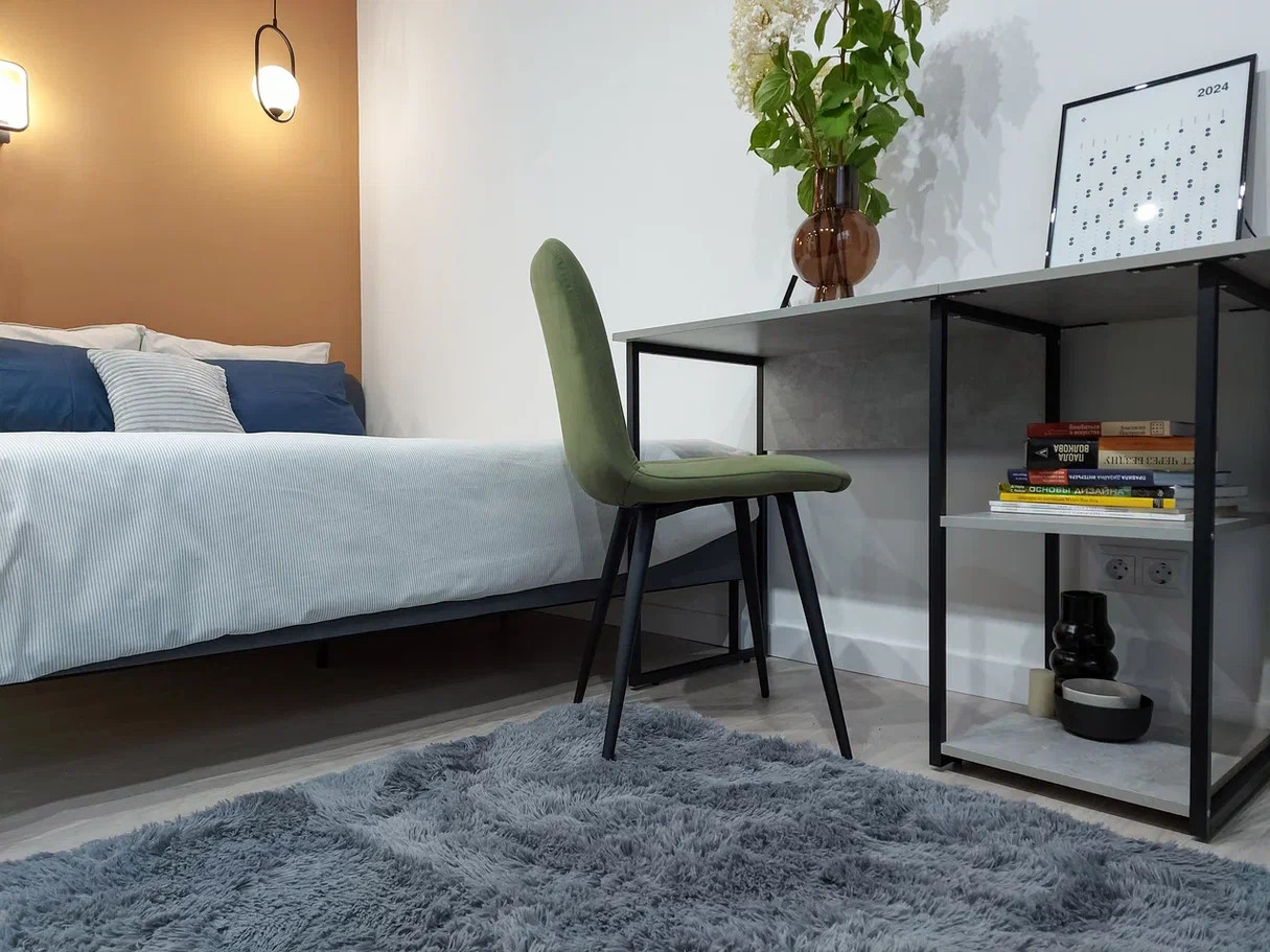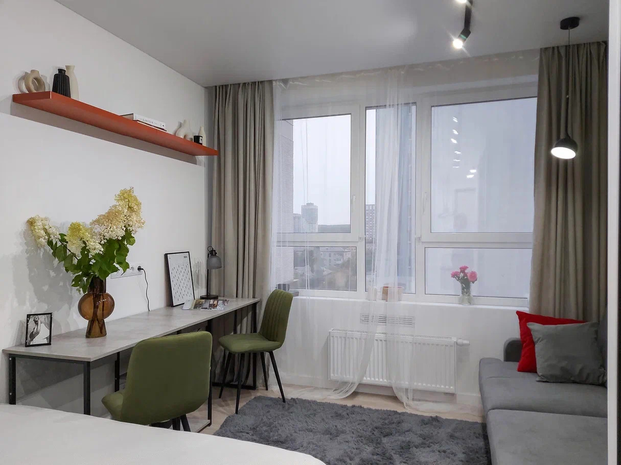 3. Планировка продумана до мелочей, есть отдельная кухонная зона, совмещенный с/у с душем, просторная прихожая, в комнате 3 функциональные зоны: спальная зона с 2-х местной кроватью, зона отдыха с диваном и рабочая зона со столом на 2-х человек.