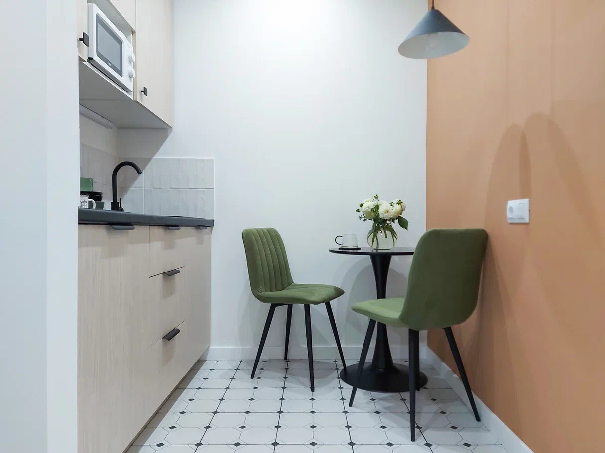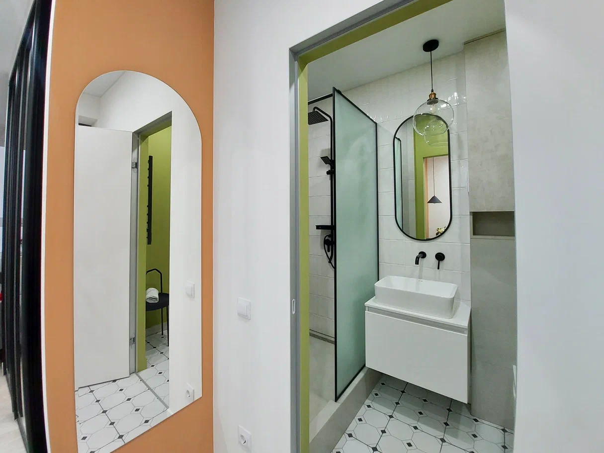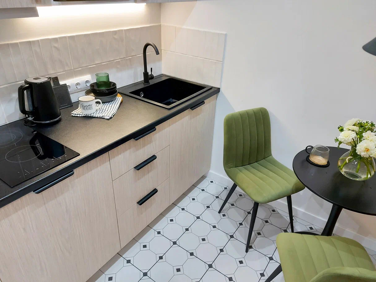 3. Планировка продумана до мелочей, есть отдельная кухонная зона, совмещенный с/у с душем, просторная прихожая, в комнате 3 функциональные зоны: спальная зона с 2-х местной кроватью, зона отдыха с диваном и рабочая зона со столом на 2-х человек.