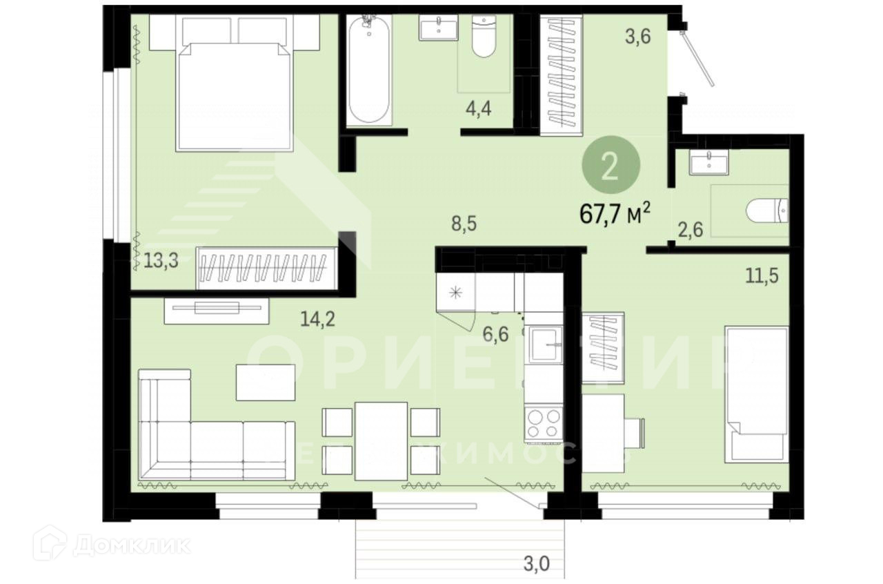 Общая площадь 67.7 м2