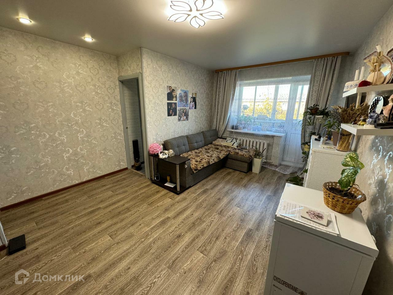 В квартире: натяжные потолки, ламинат, пластиковые стеклопакеты.