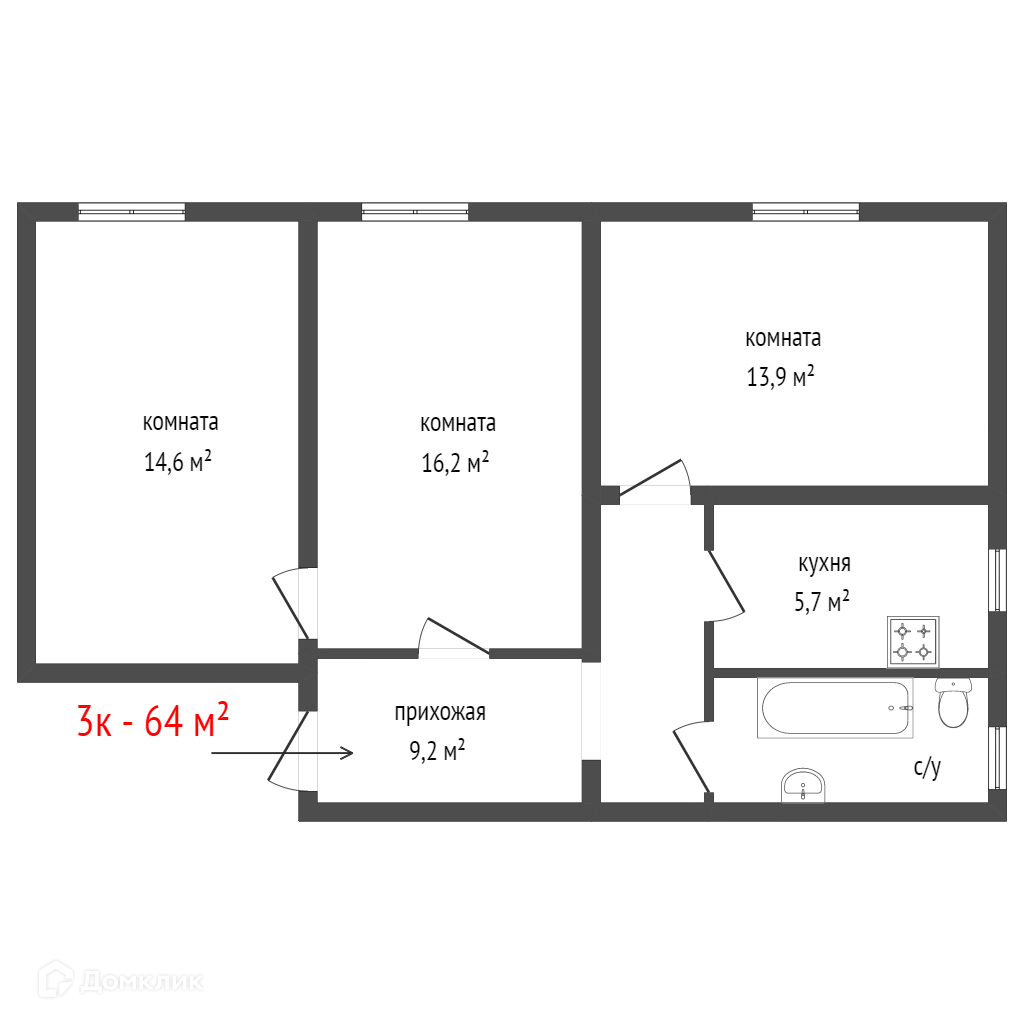 Общая площадь 64 м2
