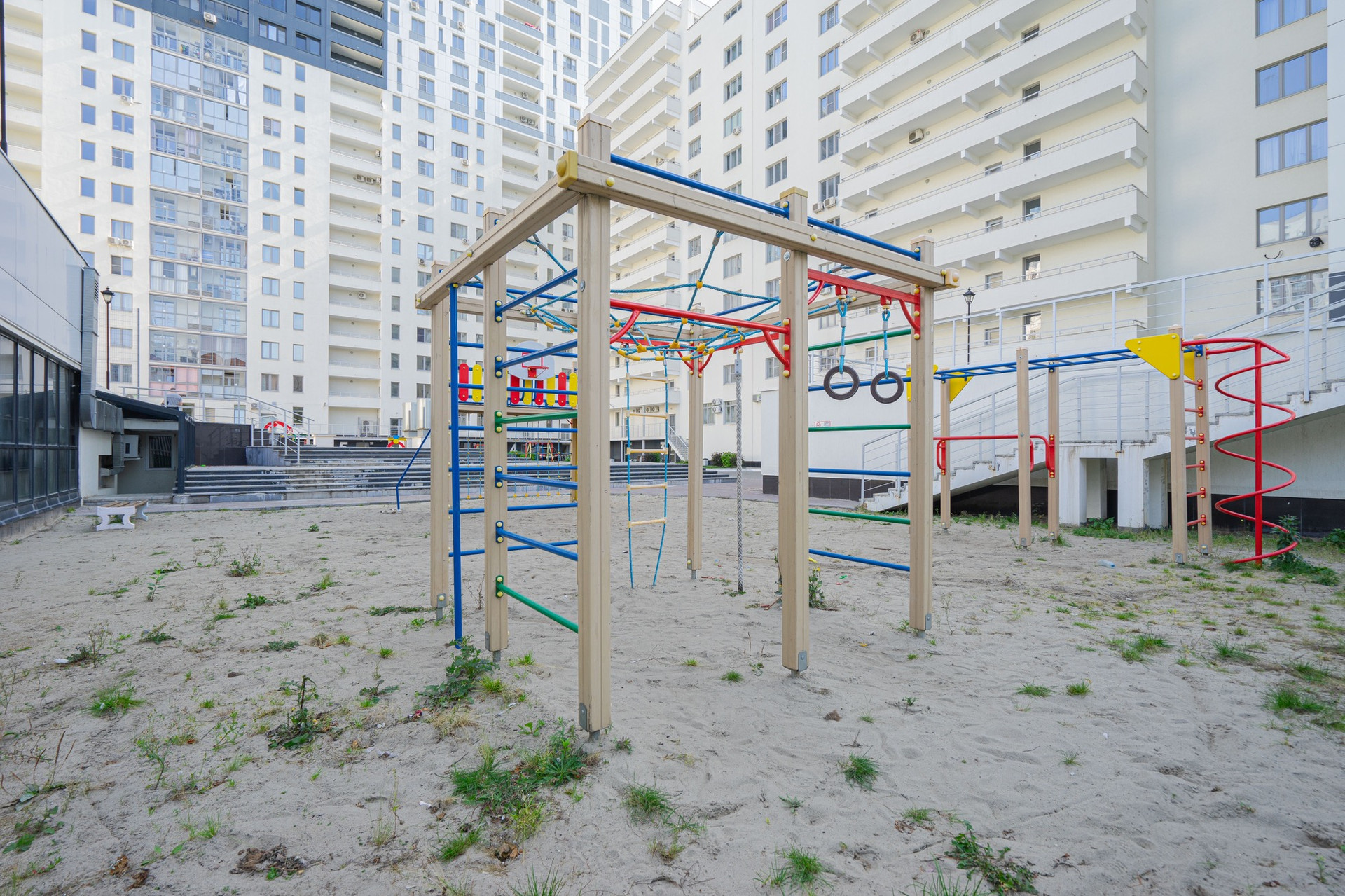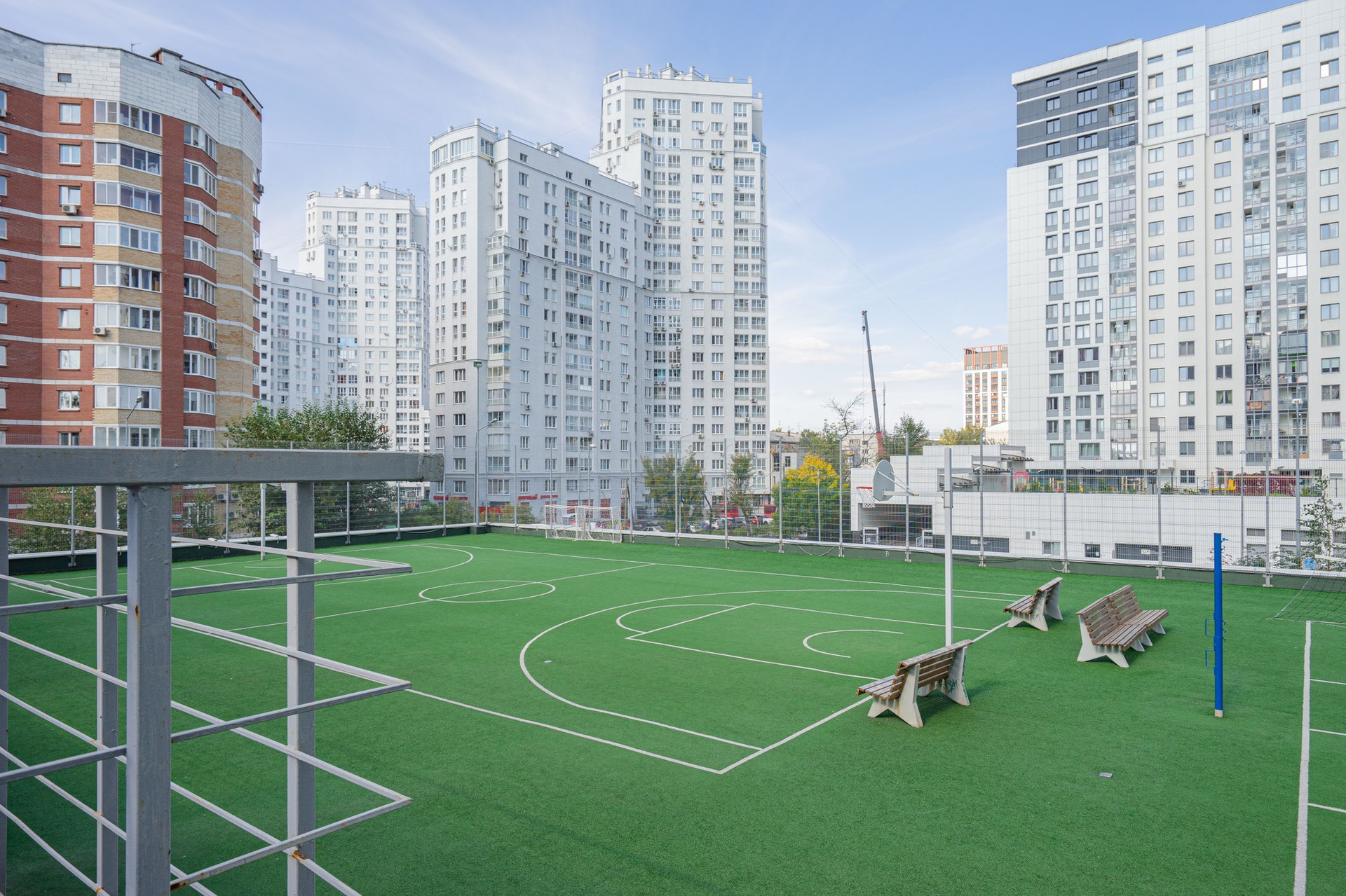 - Территория двора обустроена по принципу «Многоэтажный двор» и поднята над уровнем земли: функционально выделены детская и спортивная площадки, места для отдыха для взрослых, на верхнем уровне расположено поле для игр в футбол,волейбол, баскетбол.
