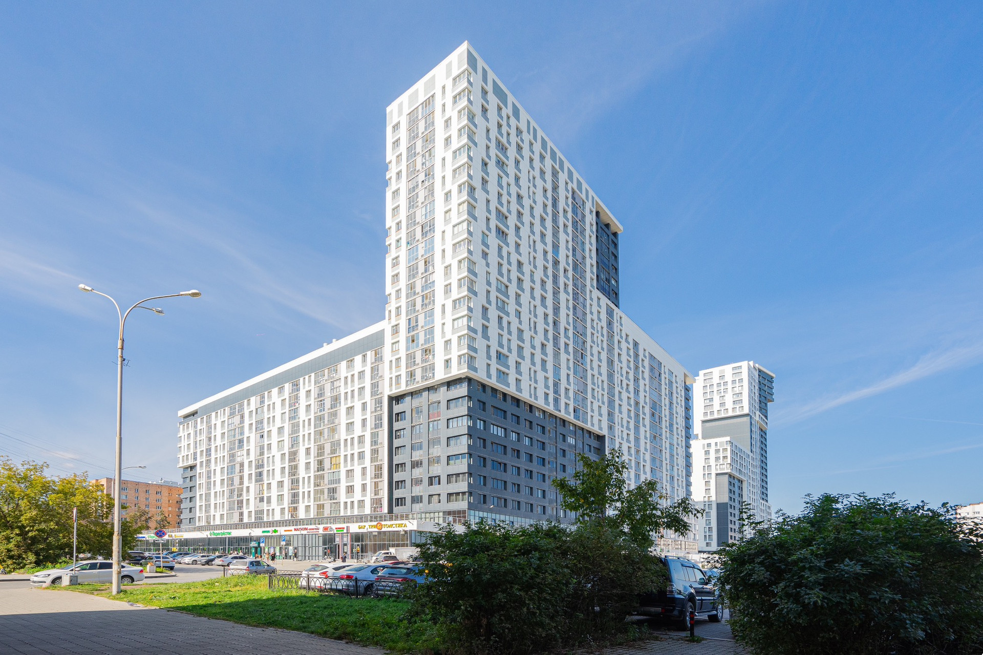 На первых этажах комплекса расположены: супермаркет «Перекресток», магазины, пекарни, кафе, медицинский центр Invitro с диагностическим отделением, развивающие центры для детей, Fresh Fitness фитнес- клуб с бассейном, аптека, парикмахерские и пр. услуги.