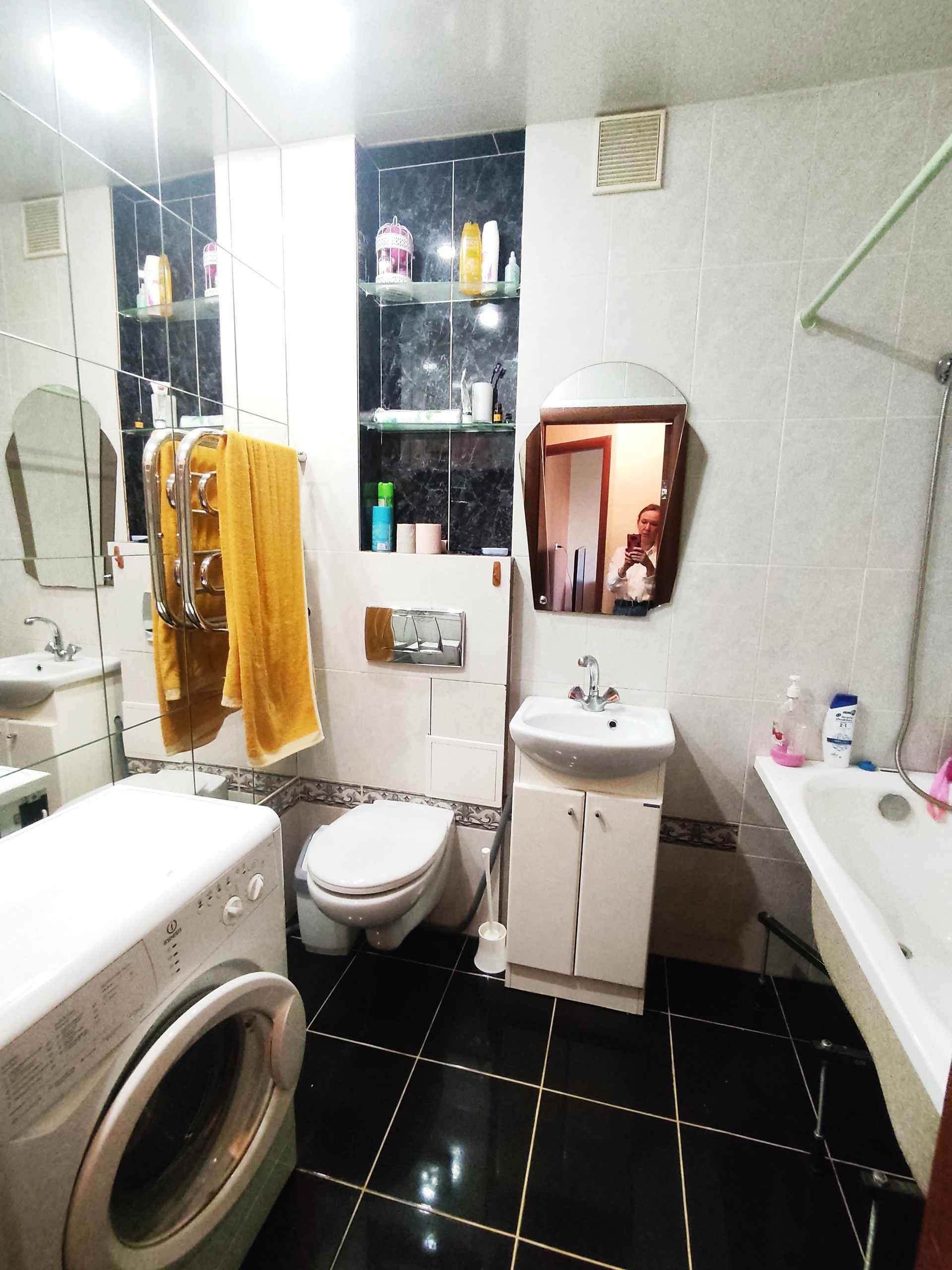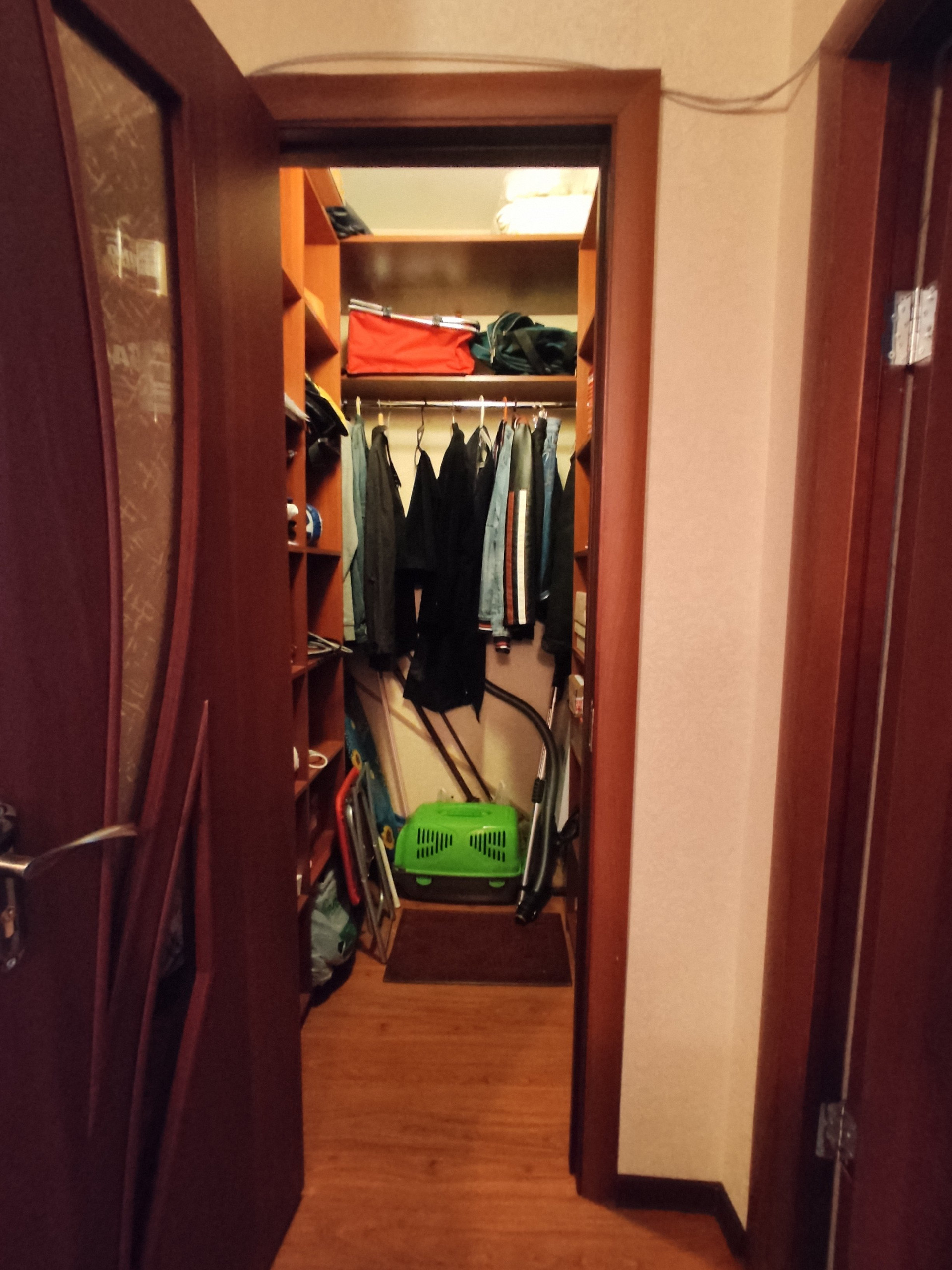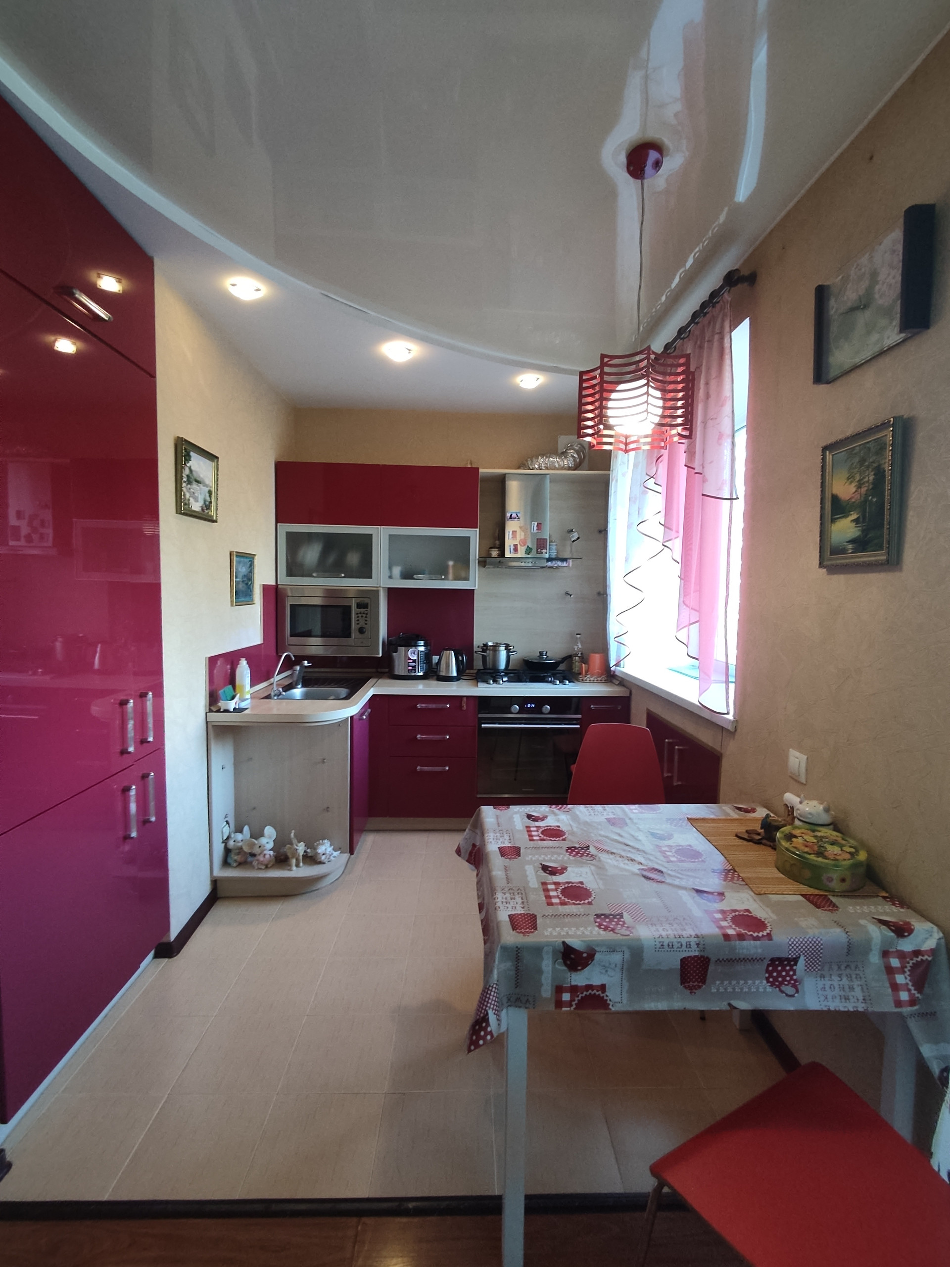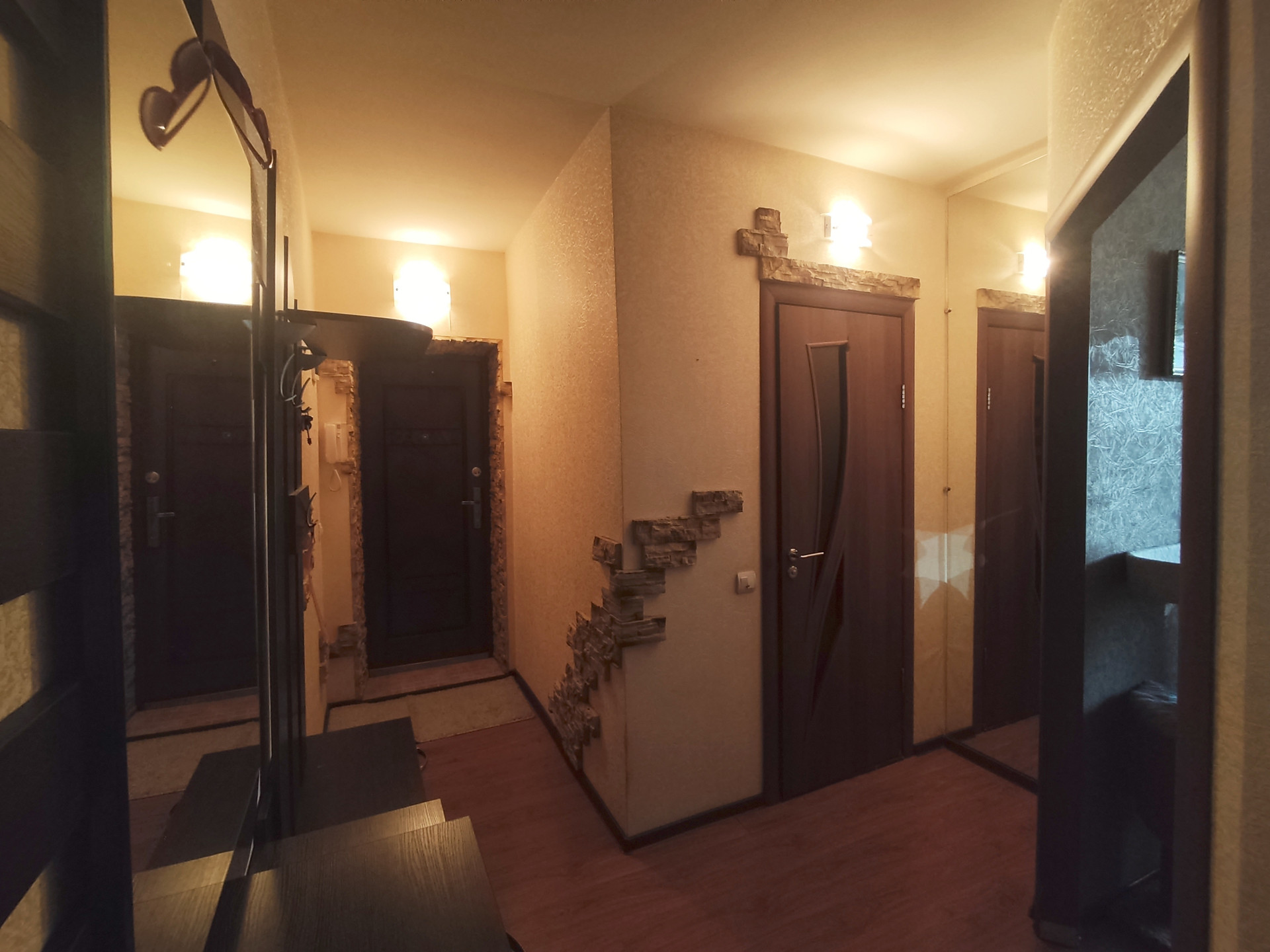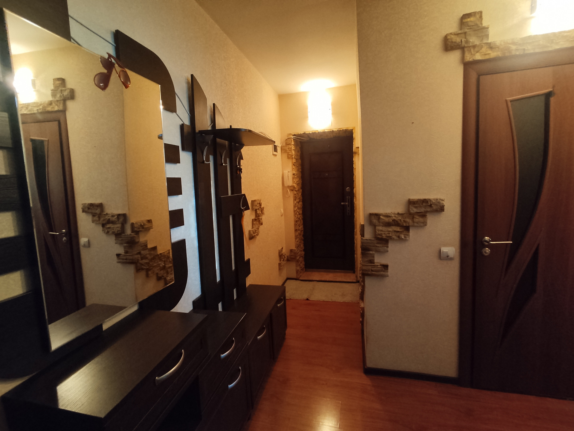 Натяжные потолки, ламинат. Гардеробная. Теплые полы в сан узле и на кухне. Балкон общит пластиковыми панелями, окна пластик. Поменяны стояки холодной и горячей воды.