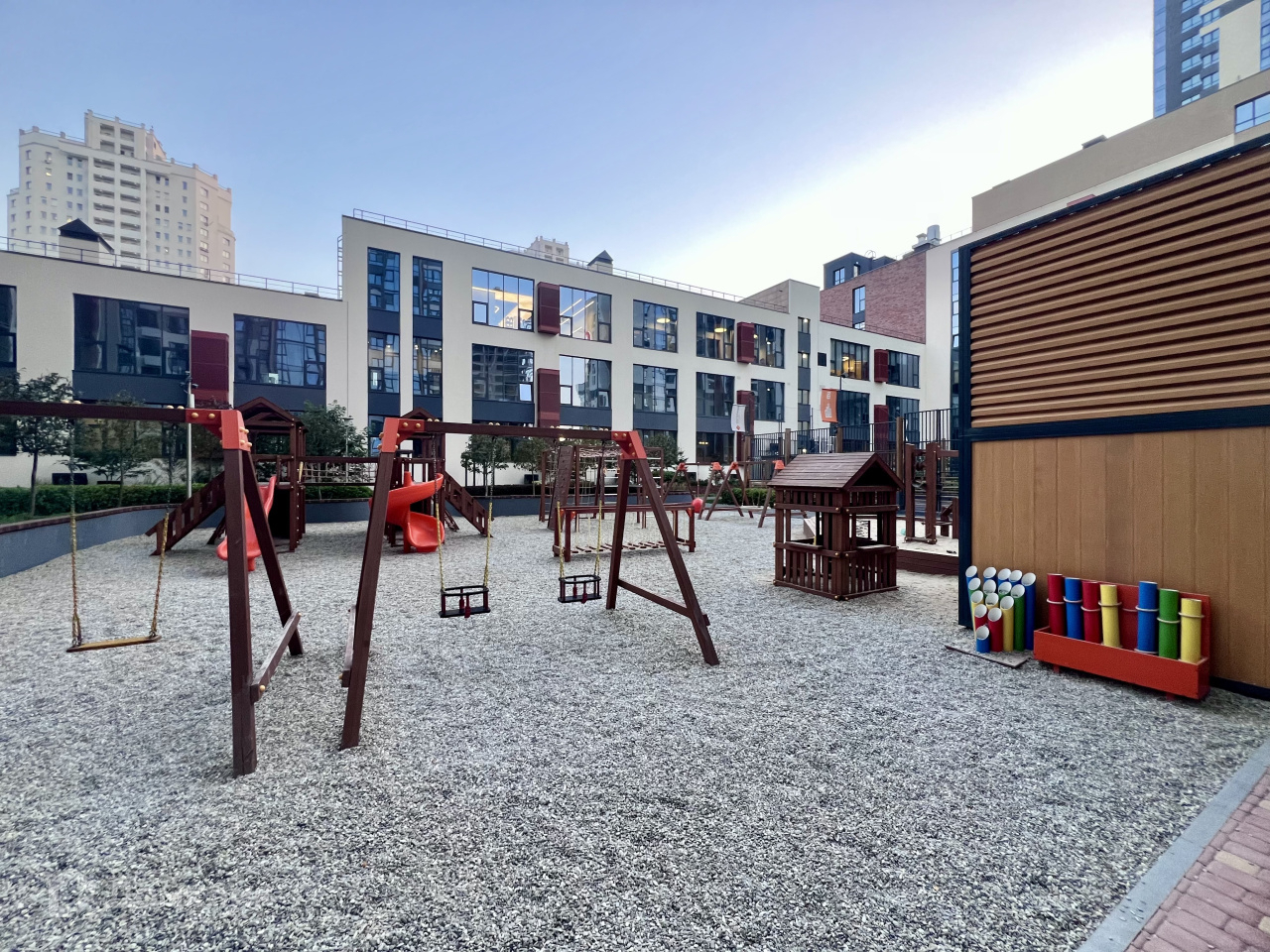 Обустроенные детские площадки из натуральной лиственницы, спортивные корты для летних игр и workout-зоны станут местом притяжения для маленьких резидентов и любителей занятий спортом на свежем воздухе в любое время года. Переняв опыт у европейских девелоперов, мы покрыли детскую площадку во дворе настоящей морской галькой. Это экологичное природное покрытие является безопасным и развивает моторику малышей.