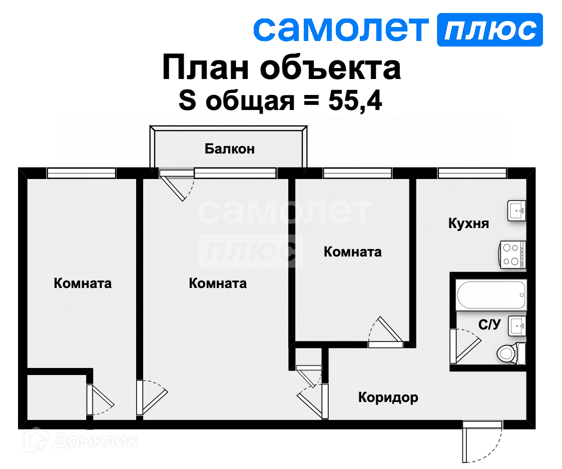 Общая площадь 55.4 м2