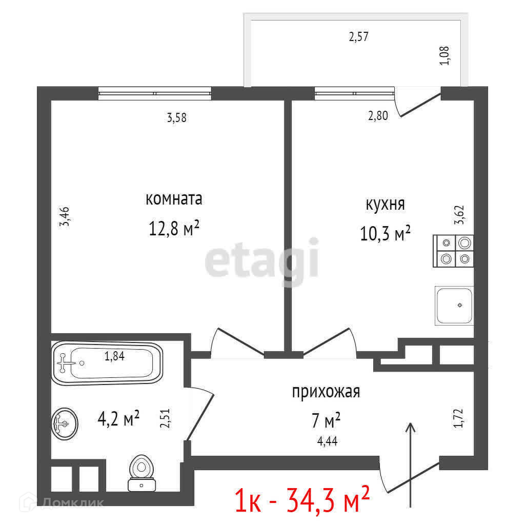 Общая площадь 34.3 м2