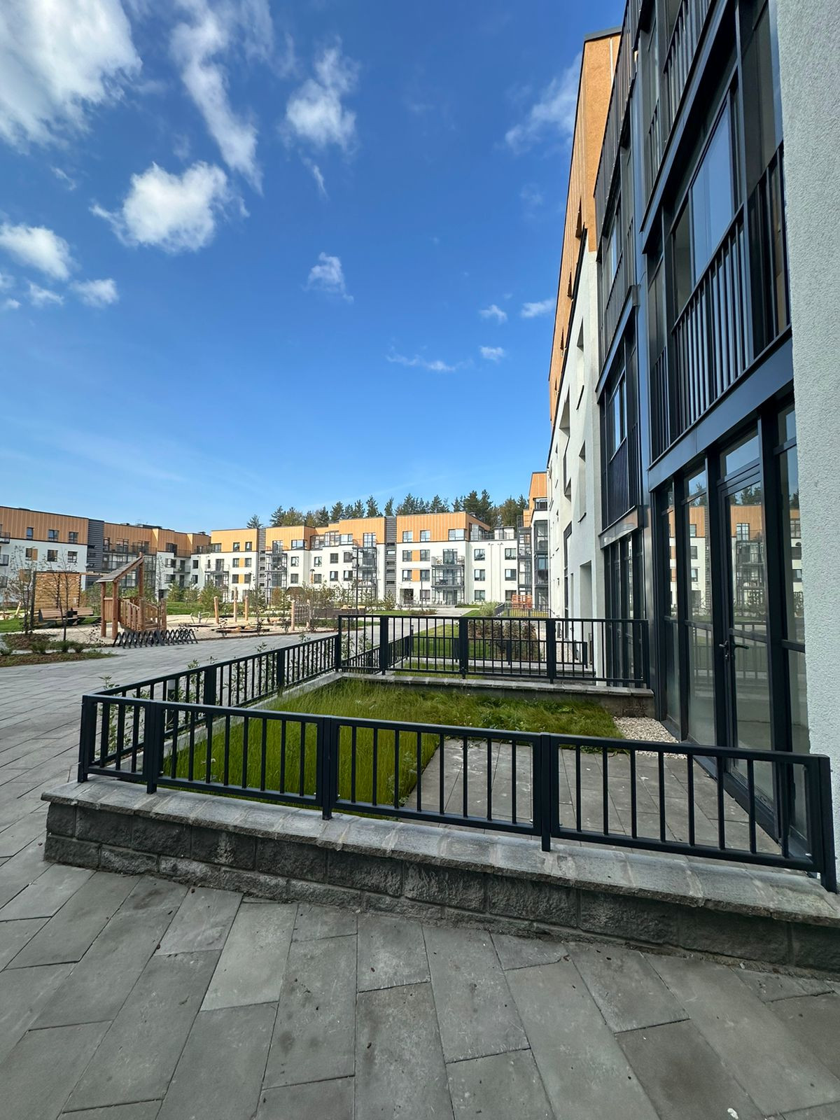 Безбарьерная среда: для того, чтобы каждому жителю было комфортно жить в наших домах, мы предусмотрели вход в парадную на уровне земли, исключая высокие бордюры и другие препятствия.