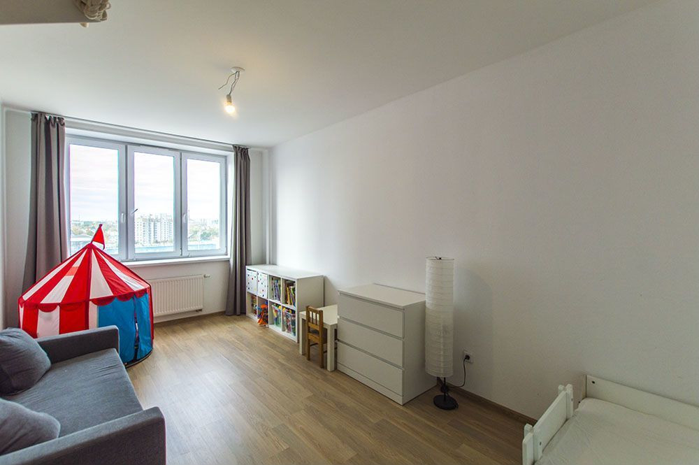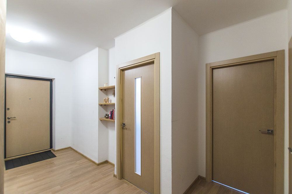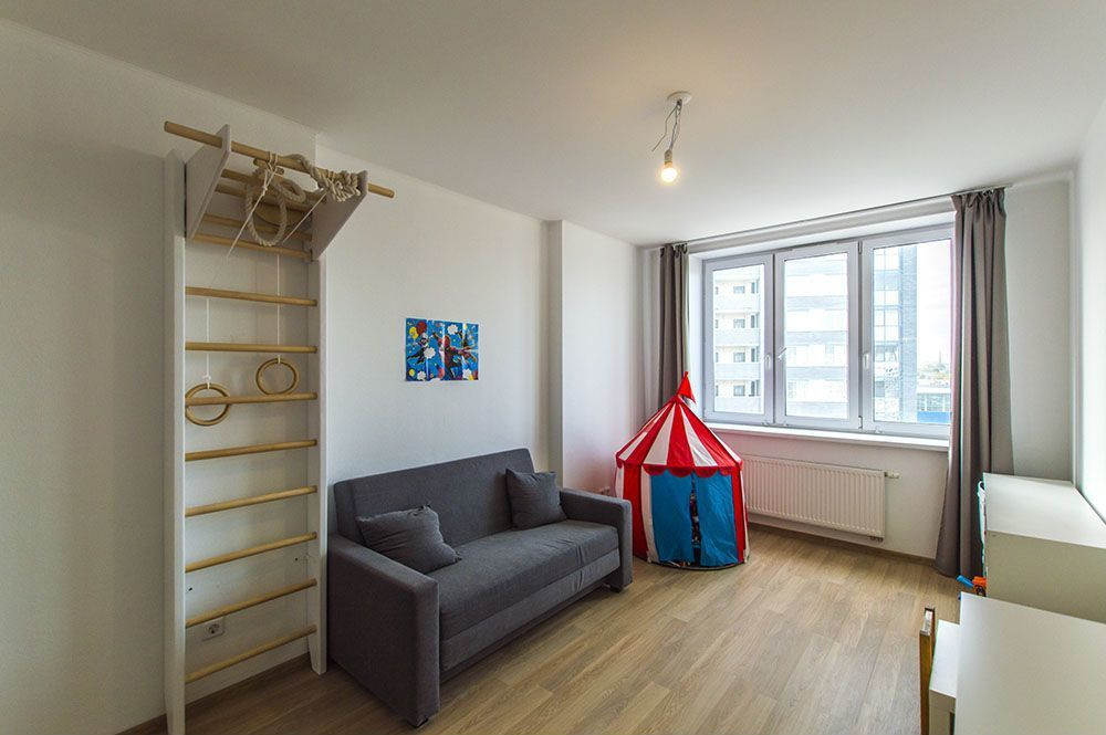 В квартире выполнен качественный ремонт, жилая площадь составляет 30.5 квадратных метров, а кухня — 20.6 квадратных метров, очень удобный формат и функционал трехкомнатной квартиры.