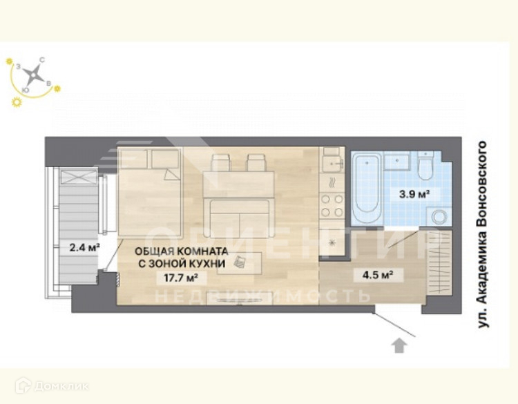Квартира студия, 28.5 м2, этаж 1 / 4, на продажу в Екатеринбурге, улица Академика Вонсовского, 19/4