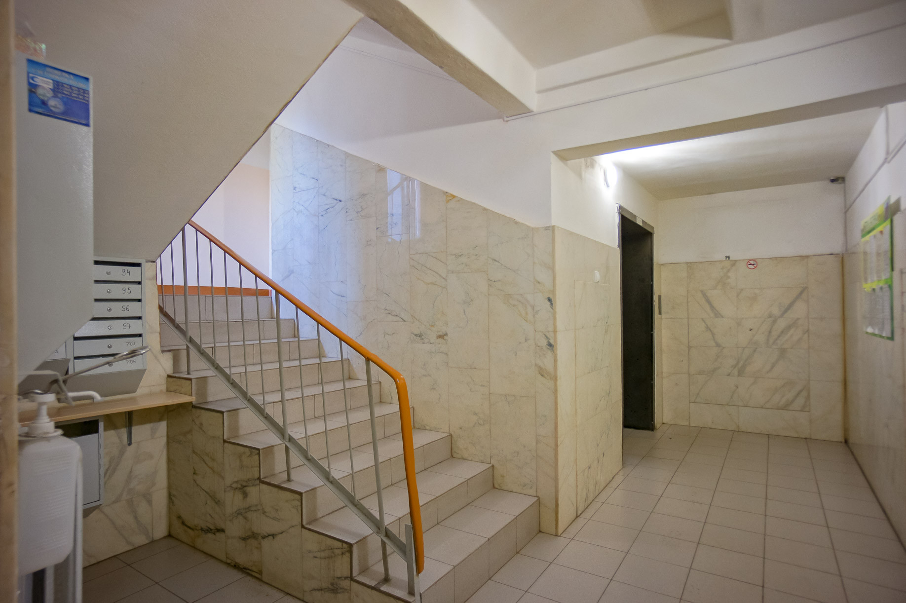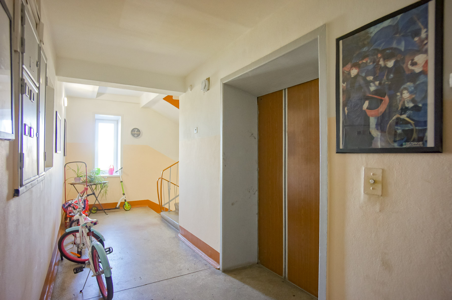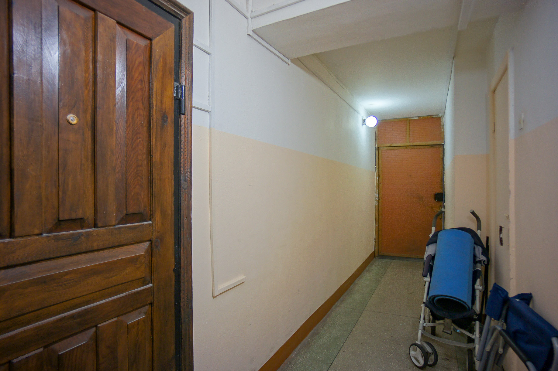 На площадке в секции всего две квартиры, есть кладовка для хранения вещей, в холле секции можно оставлять детский транспорт и др. вещи, секция имеет входную железную дверь с замками. Состояние подъезда, лифта - хорошее.