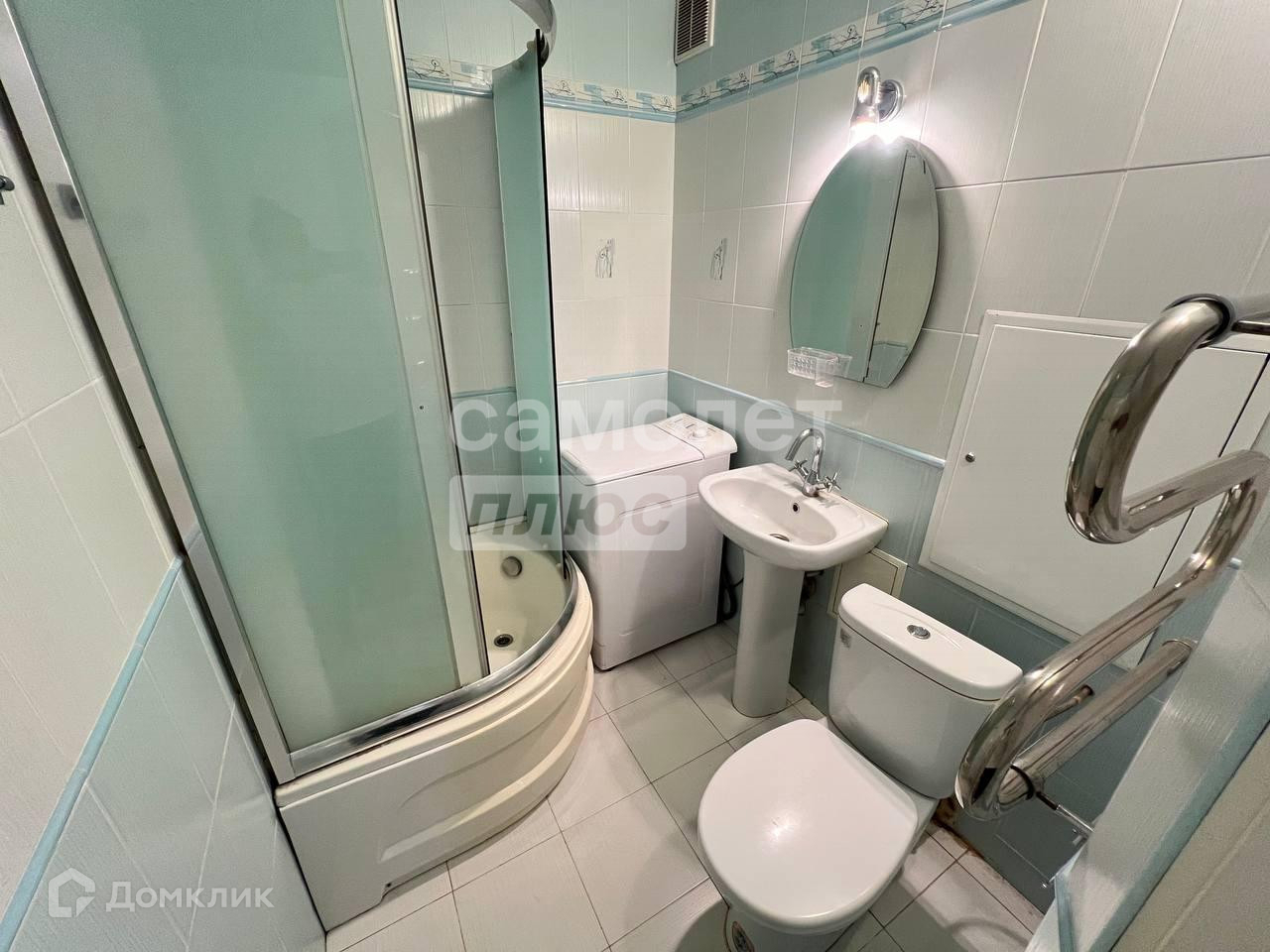 -Ванная комната, плитка, душевая кабина, полотенцесушитель, мебель.