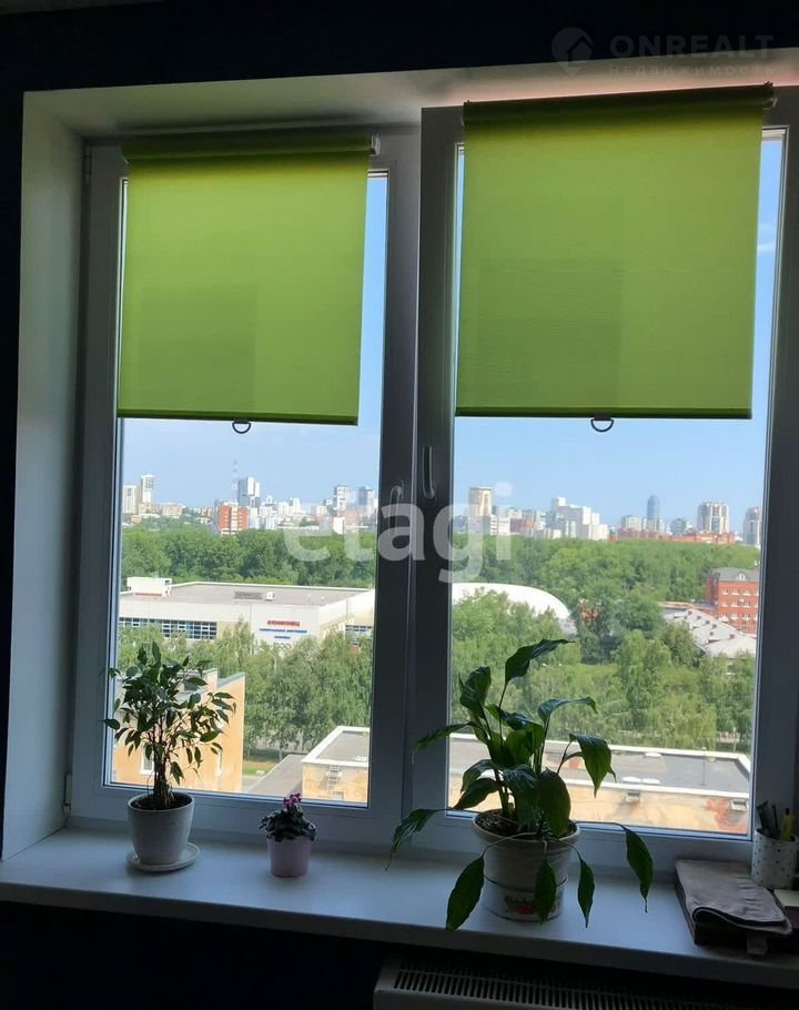 Окно на кухне выходит на парк и центр города, окно в комнате большое эркерное.