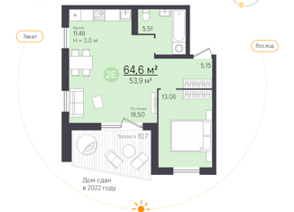 Двухкомнатная квартира на продажу, 53.9 м2, улица Олега Кошевого, 1