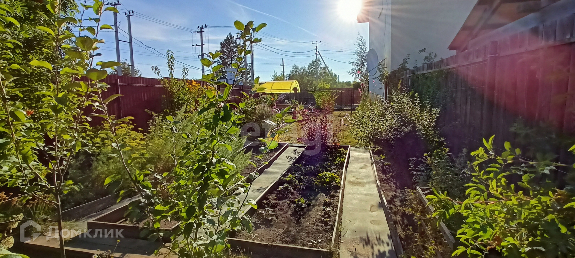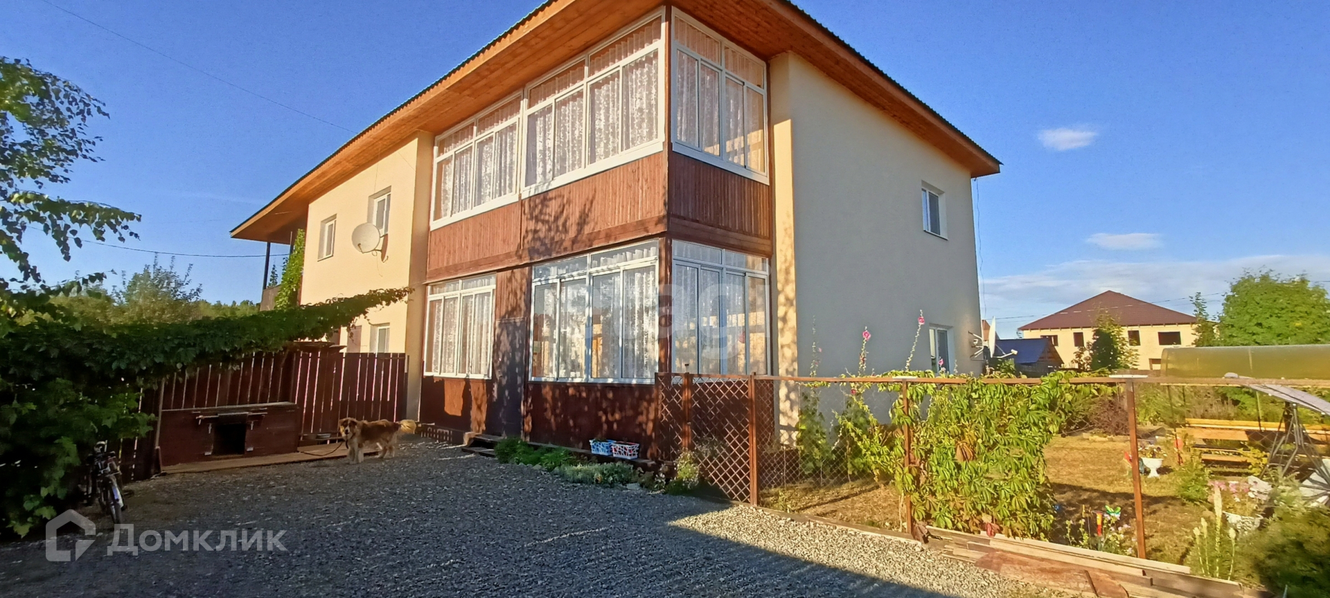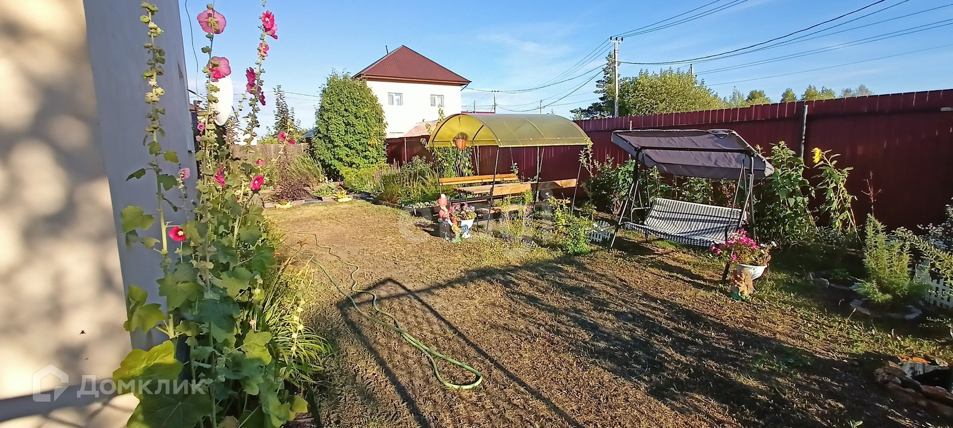 У квартиры свой земельный участок в 3 сотки, на котором гармонично расположено все, что необходим для комфорта загородного дома: парковка на несколько машин, отсыпанная щебнем, беседка, площадка с газоном и несколько грядок. И все это спрятано от чужих глаз за забором.