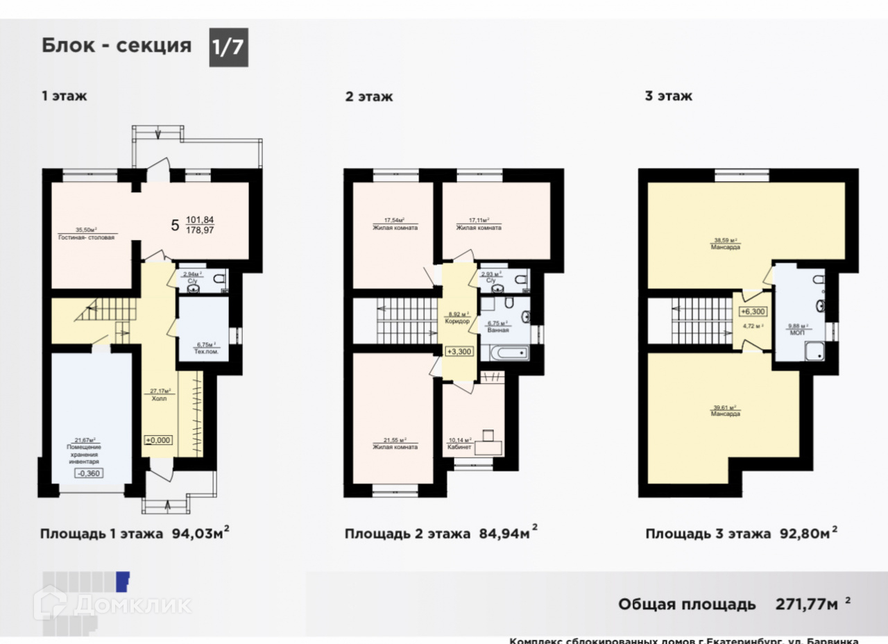 3-этажный таунхаус, 185.6 м2, на продажу в Екатеринбурге, улица Барвинка, 23