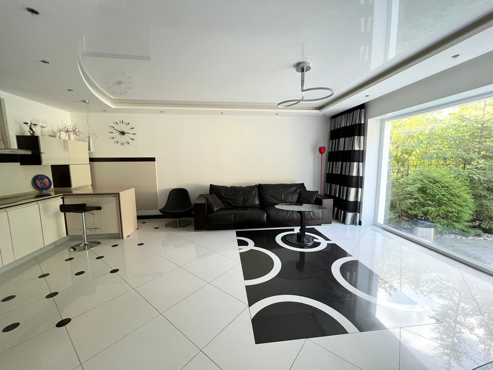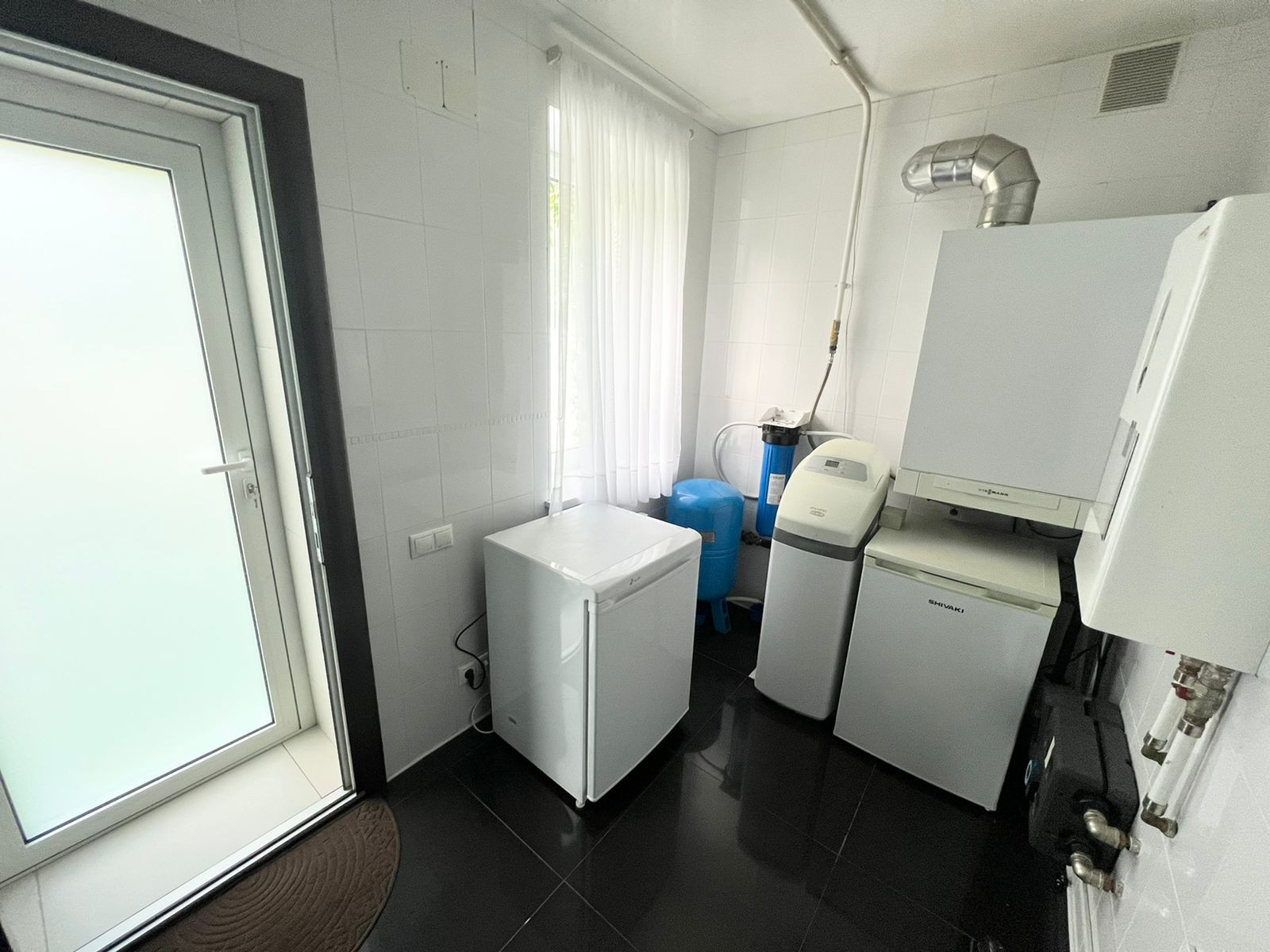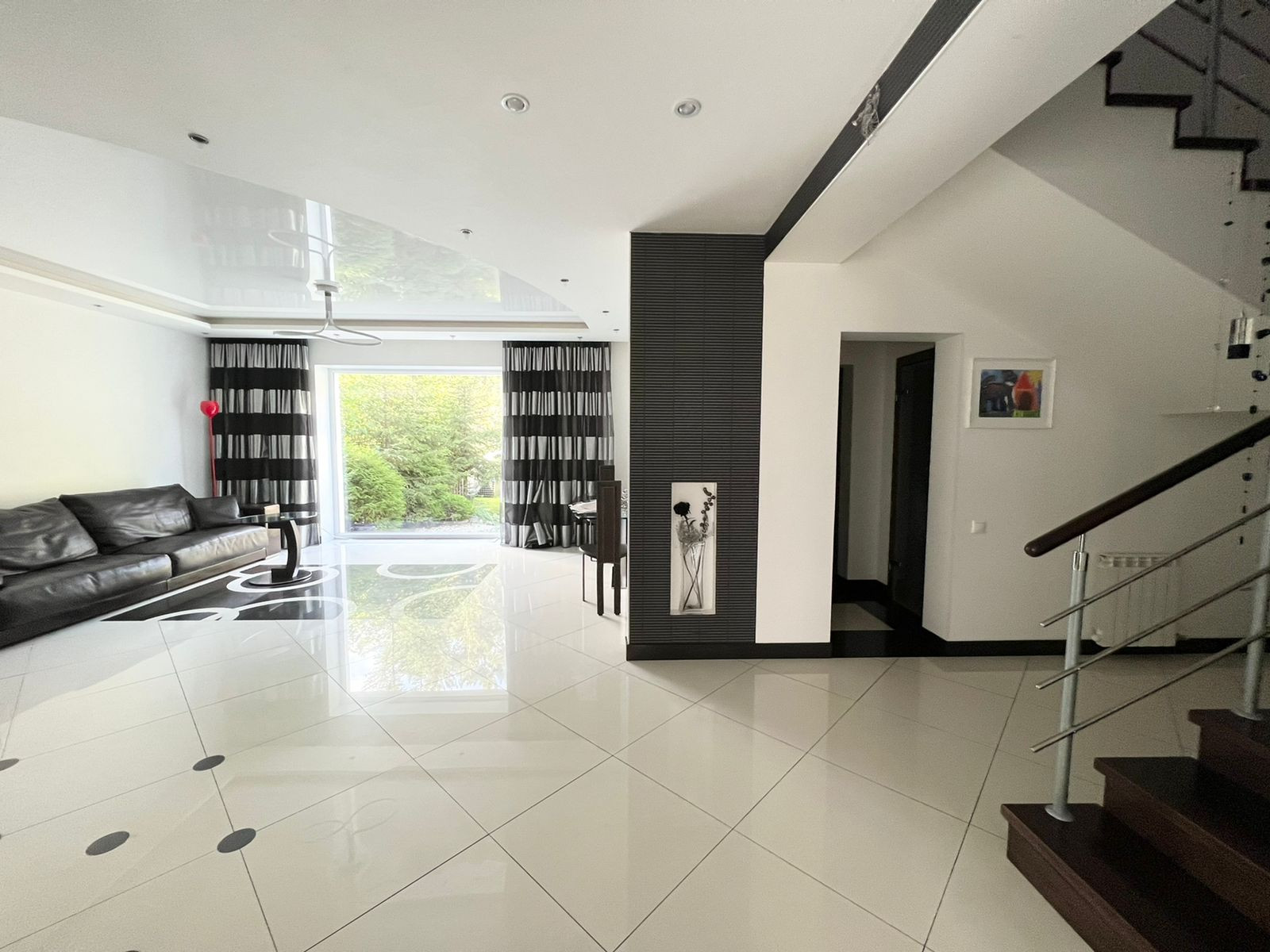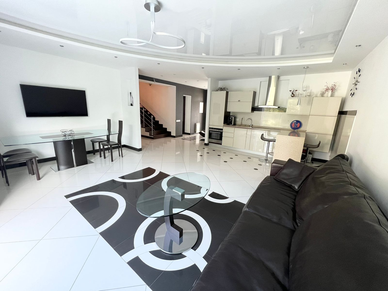 На первом этаже кухня-гостиная. Остаётся кухонный гарнитур со всей встроенной техникой: духовой шкаф, вытяжка, посудомоечная машина, вытяжка, холодильник. А также барный стол со стульями, диван, обеденный стол со стульями. А  также на первом этаже расположена гардеробная, санузел и котельная - с выходом на свой приусадебный участок. Вход в гараж из дома.