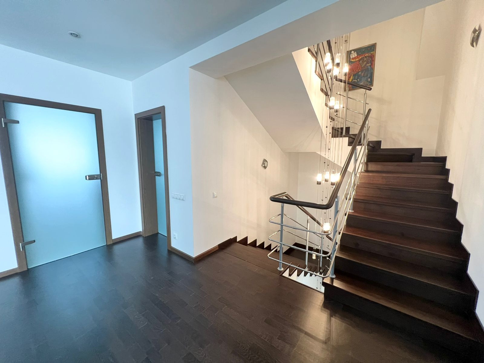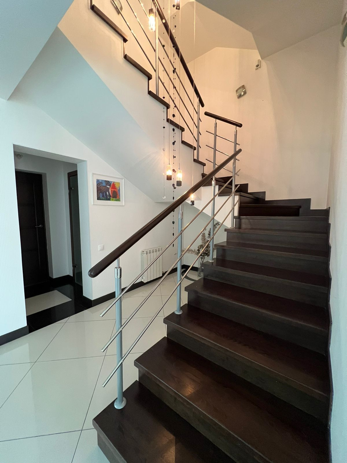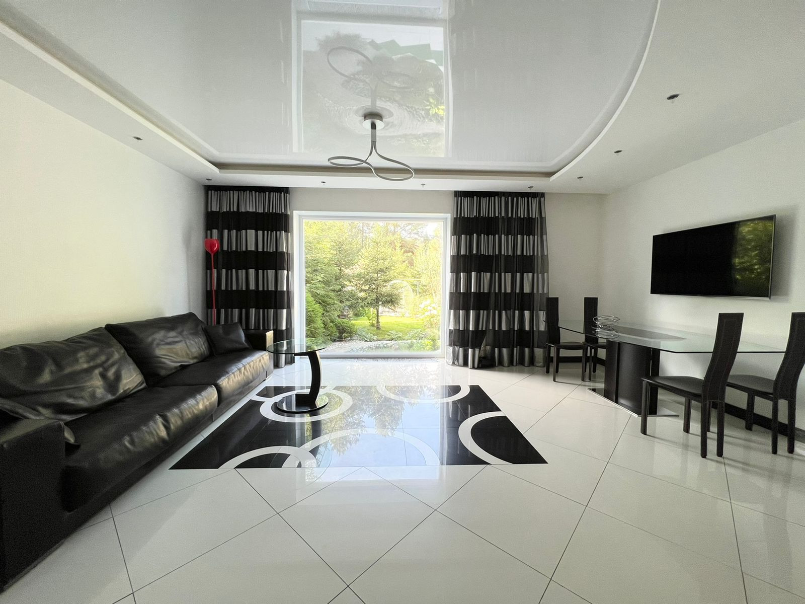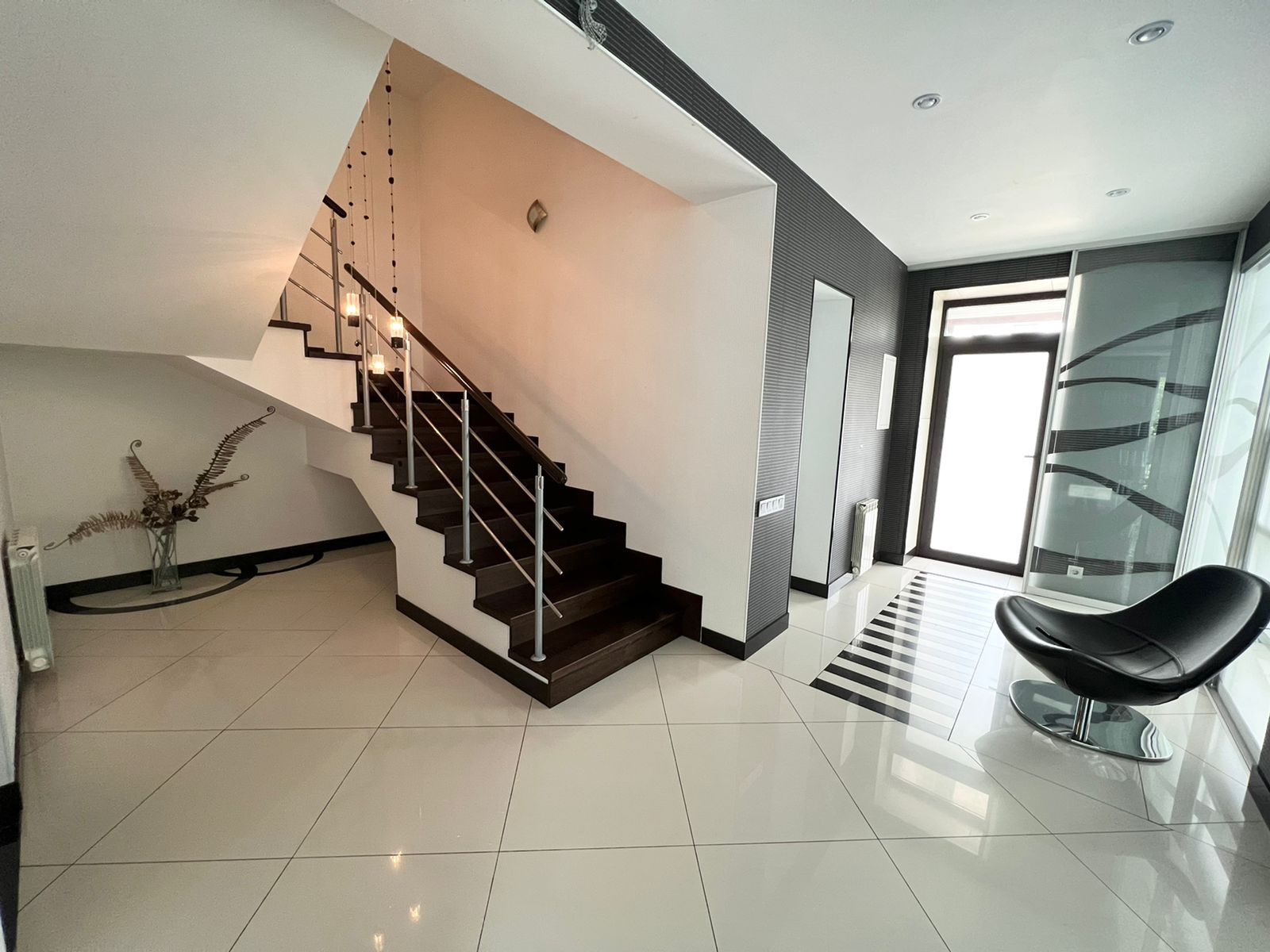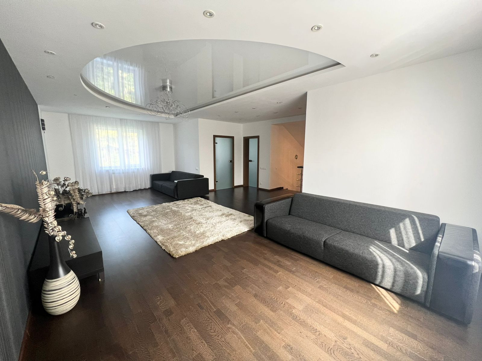 На первом этаже кухня-гостиная. Остаётся кухонный гарнитур со всей встроенной техникой: духовой шкаф, вытяжка, посудомоечная машина, вытяжка, холодильник. А также барный стол со стульями, диван, обеденный стол со стульями. А  также на первом этаже расположена гардеробная, санузел и котельная - с выходом на свой приусадебный участок. Вход в гараж из дома.