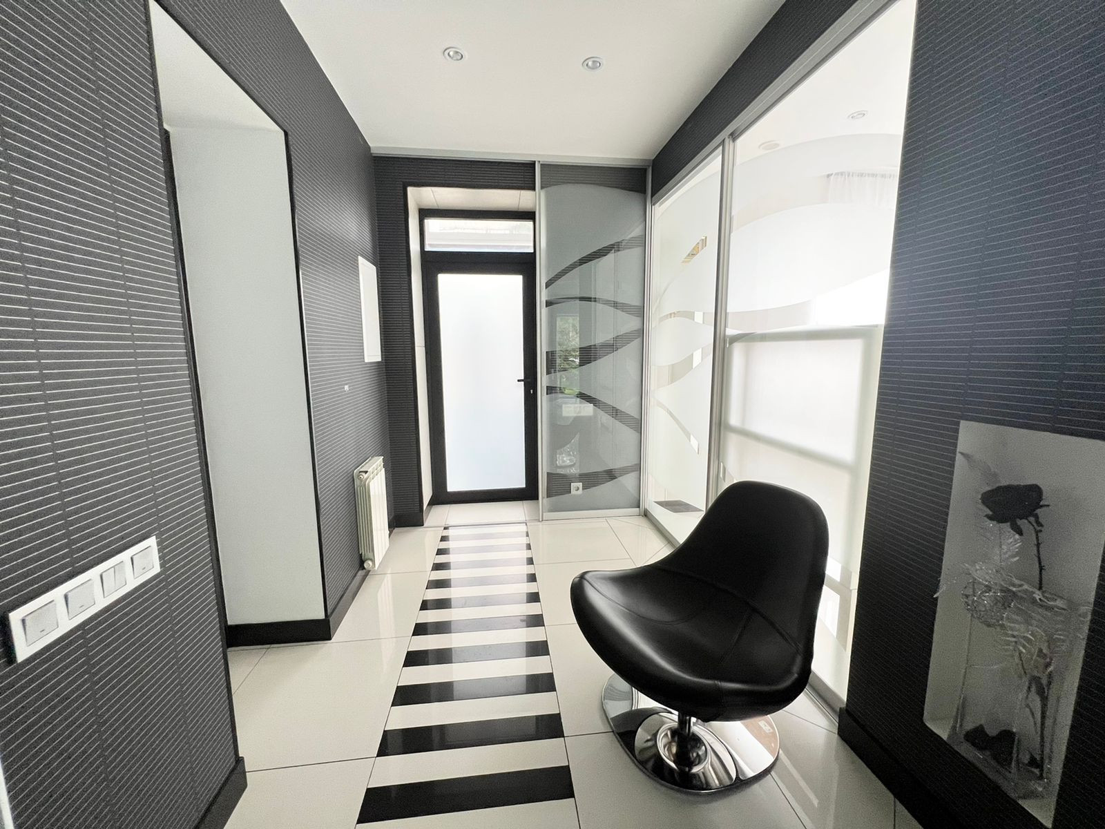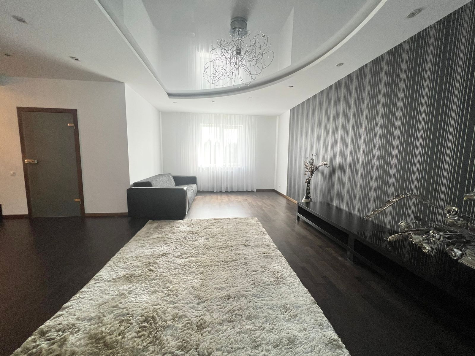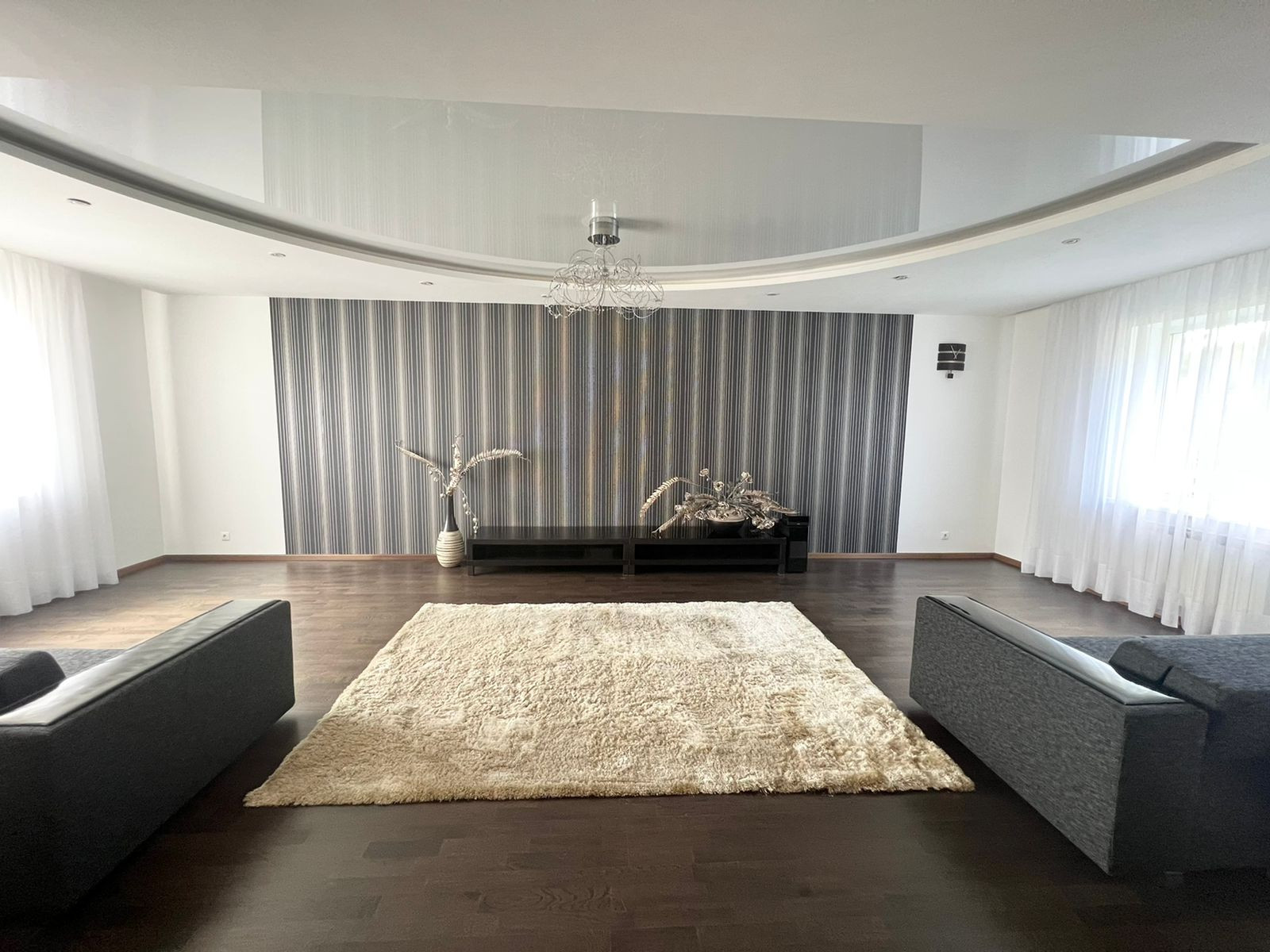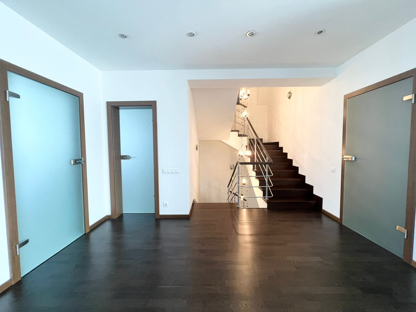 На первом этаже кухня-гостиная. Остаётся кухонный гарнитур со всей встроенной техникой: духовой шкаф, вытяжка, посудомоечная машина, вытяжка, холодильник. А также барный стол со стульями, диван, обеденный стол со стульями. А  также на первом этаже расположена гардеробная, санузел и котельная - с выходом на свой приусадебный участок. Вход в гараж из дома.